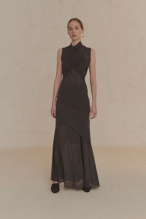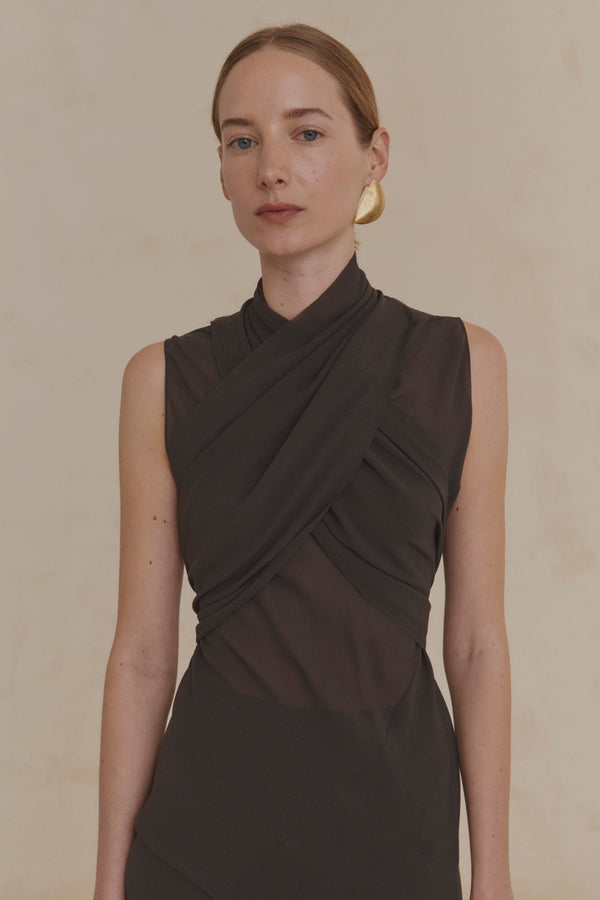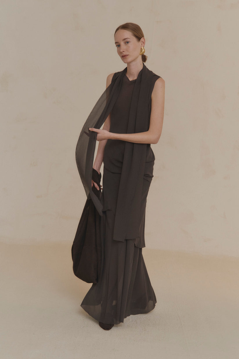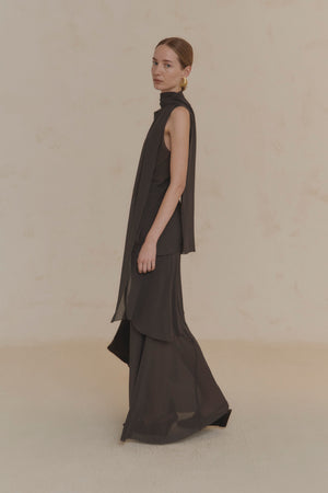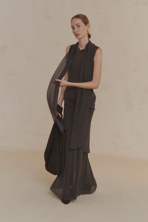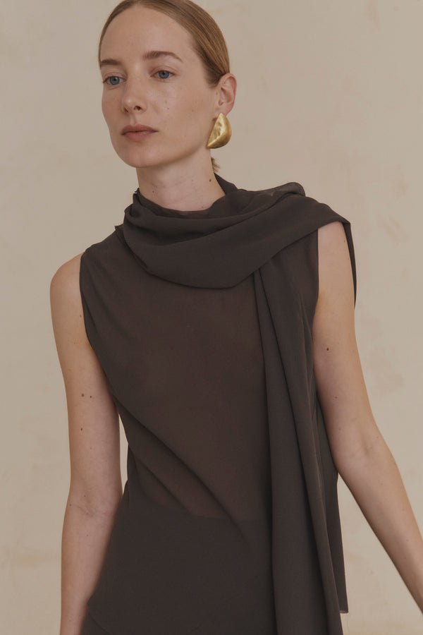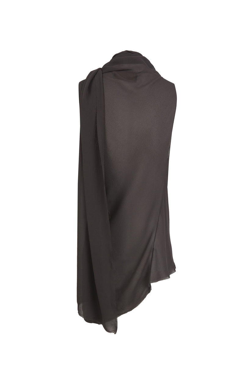 Sleeveless silk georgette top with an asymmetrical hem. The Serene top features a stole that can be draped around the neck and chest.