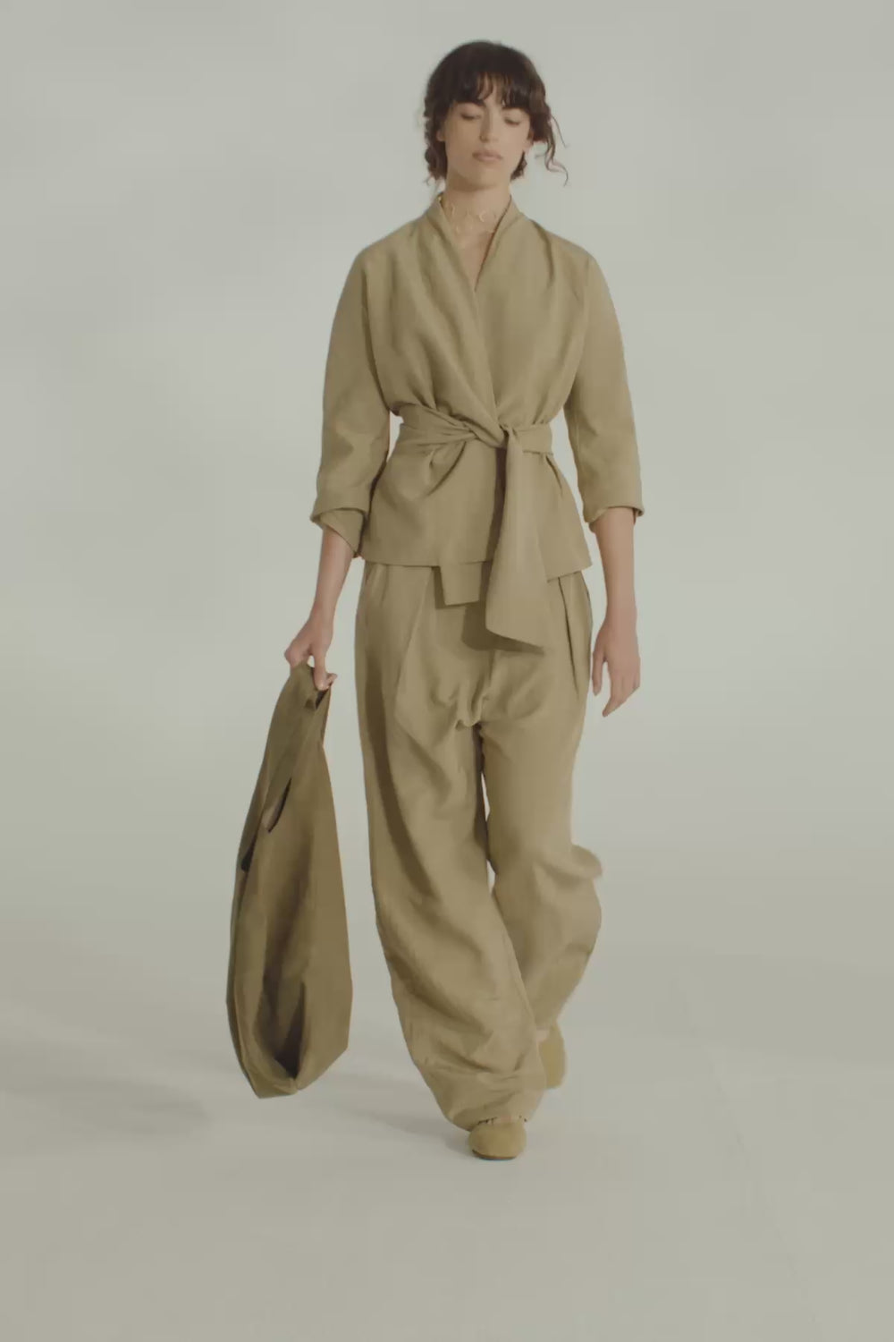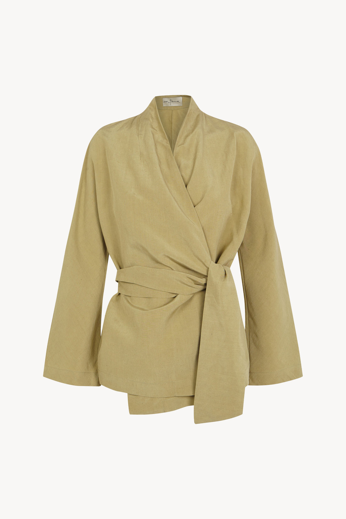 Simona, matte khaki wrap jacket in linen and silk