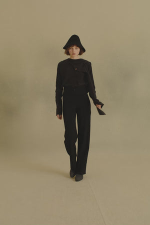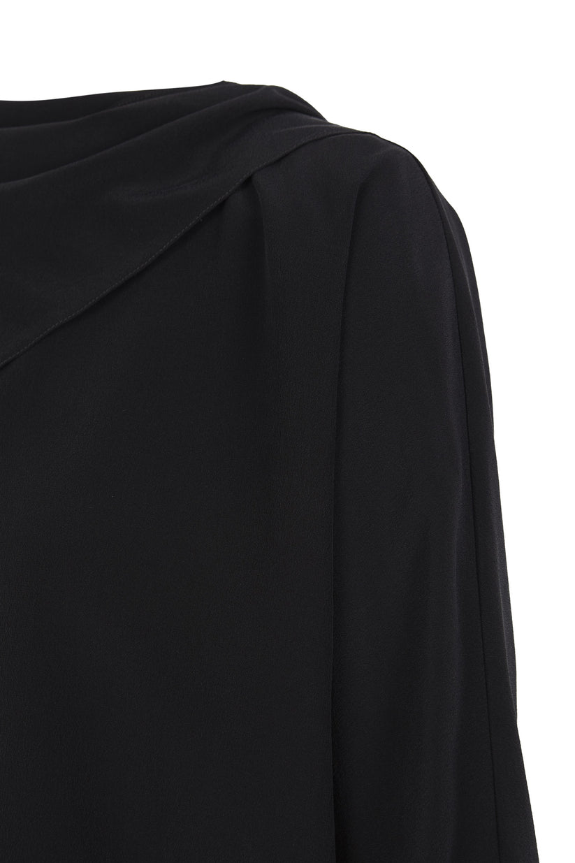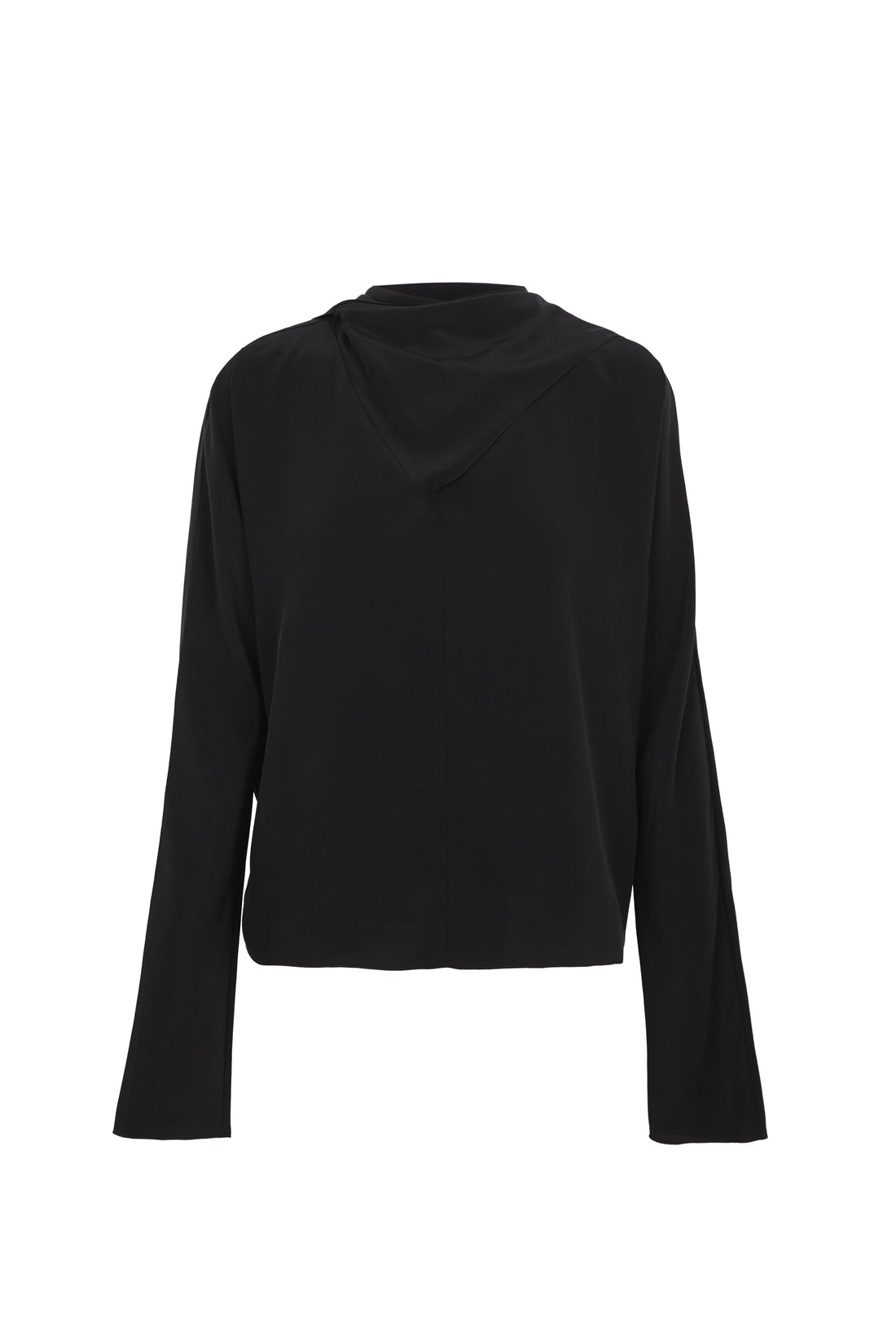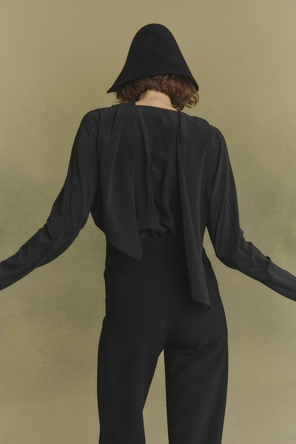 Silk blouse with Japanese sleeves, V-neck, and ties extending from the neckline
