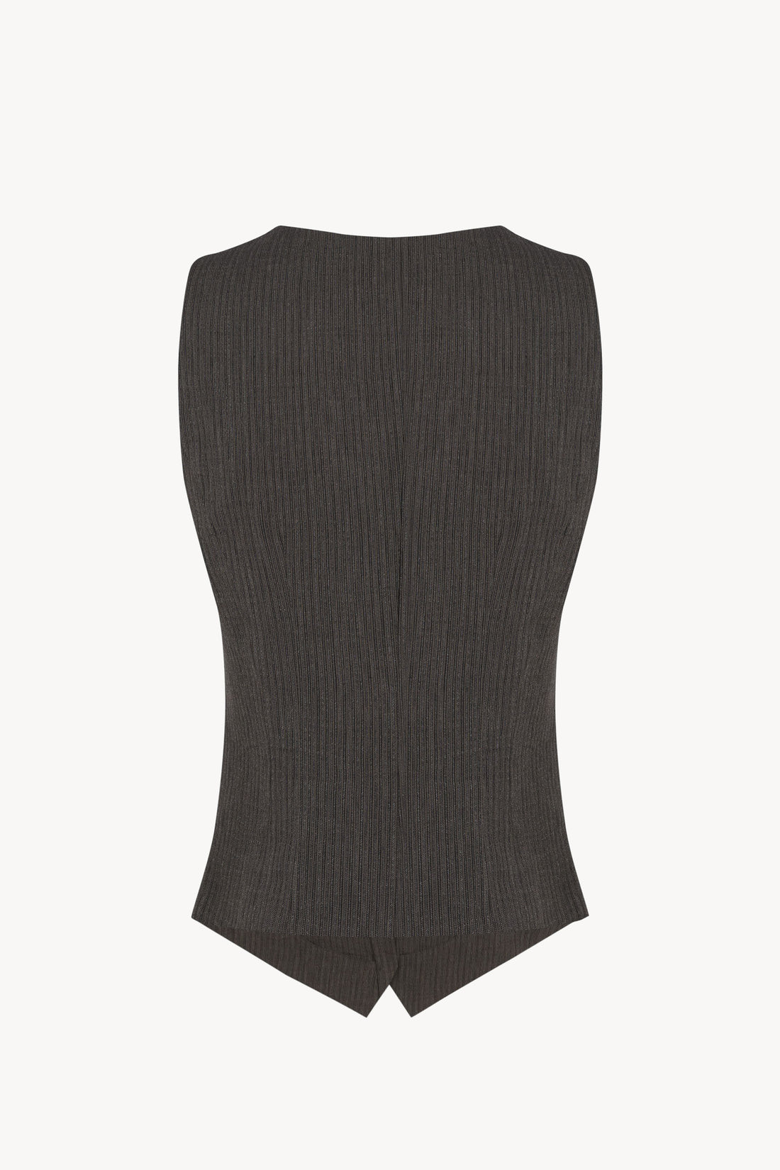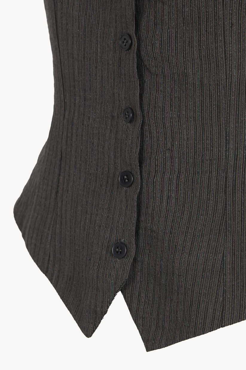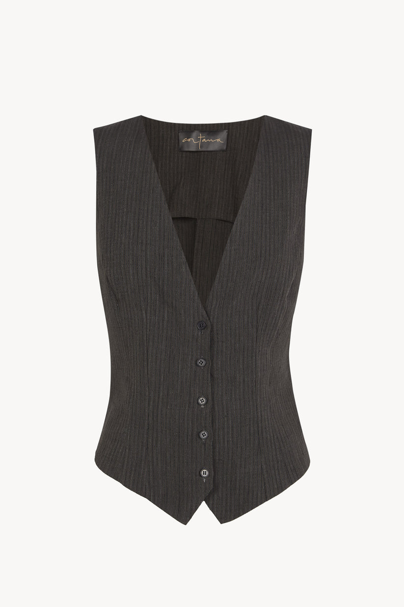 Short fitted vest made from a striped jacquard fabric that blends linen, viscose, and cotton. The Trapani vest has a V-shaped neckline and button closure at the front. Wear it with the matching Trapani jacket and pants for a total look.