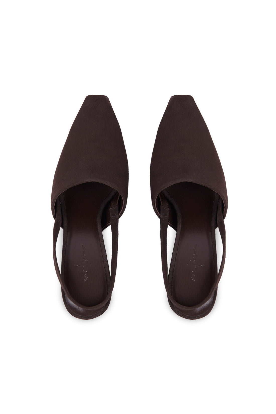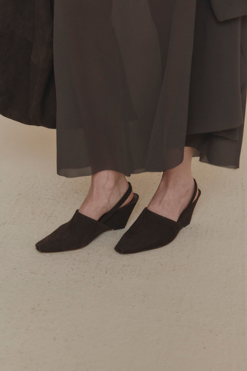 Soft suede shoes with a slightly open toe, wedge heel, and adjustable slingback strap. The Umbra sandals have a leather lining and polished leather soles painted by hand to match the upper.