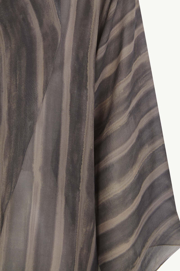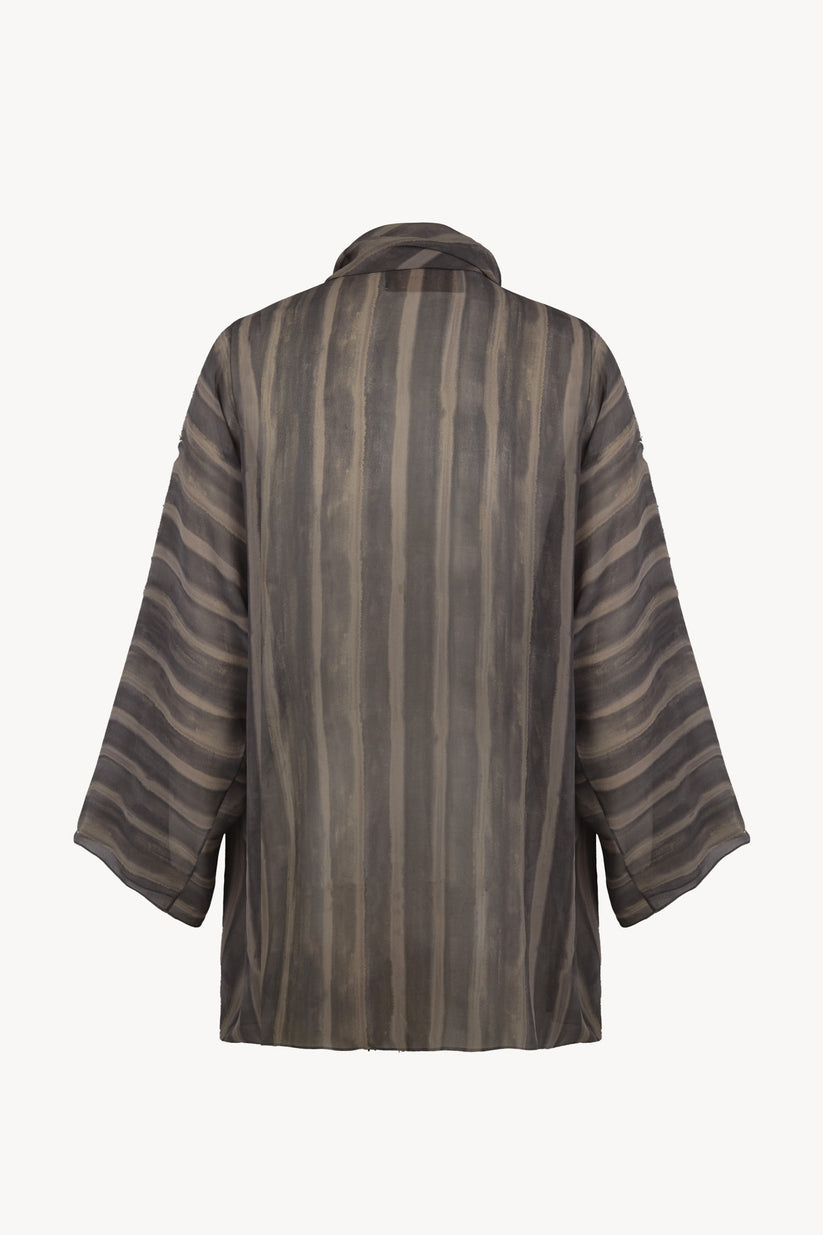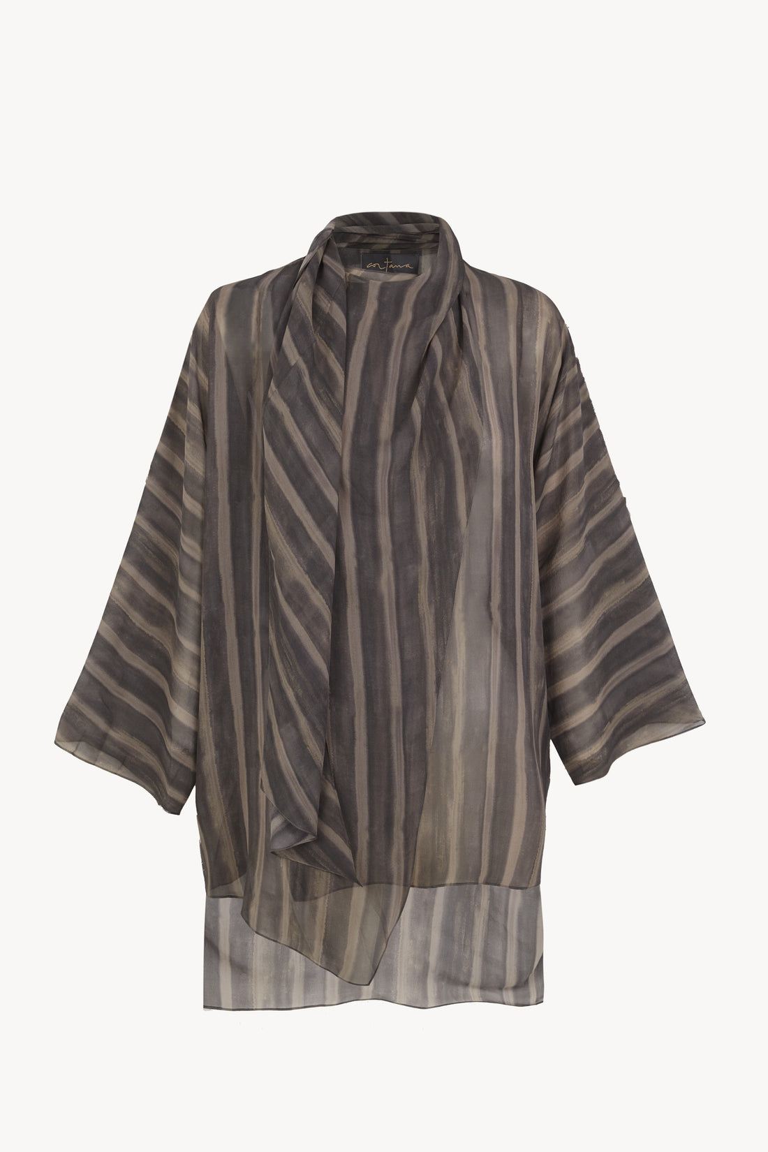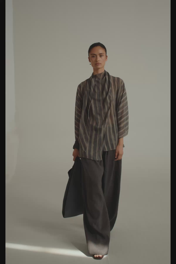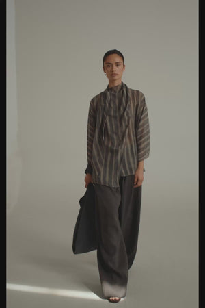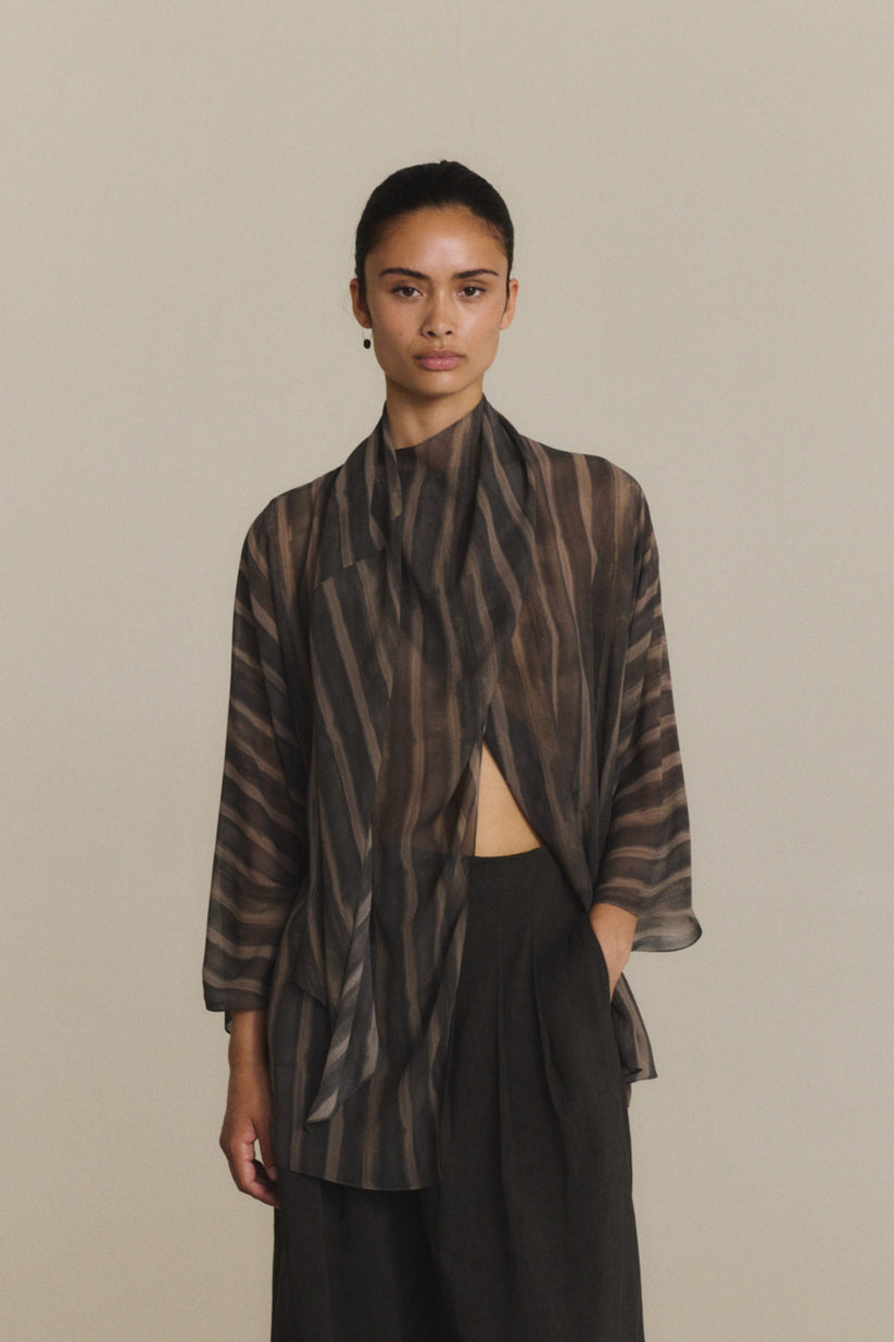 Wrap blouse crafted from printed silk. The Ursula shirt features a front crossover design and an integrated collar stole that can be styled in multiple ways. The exclusive print is inspired by a watercolor by Cortana’s creative director, adding a unique artistic touch.
