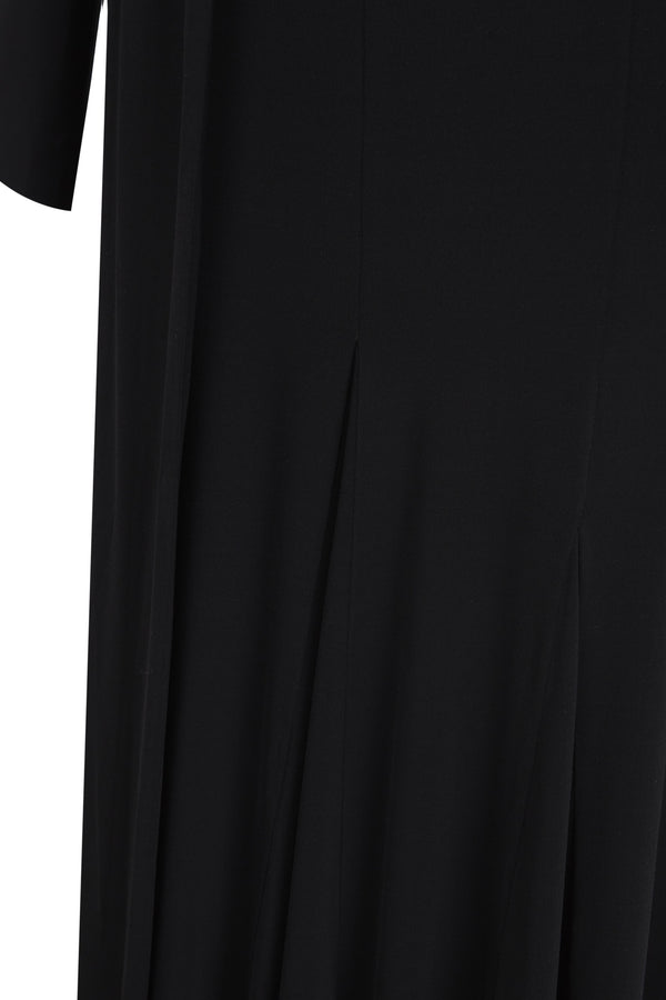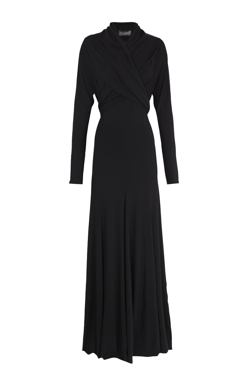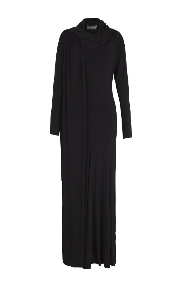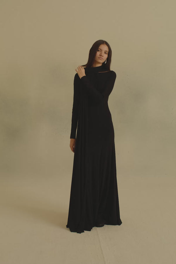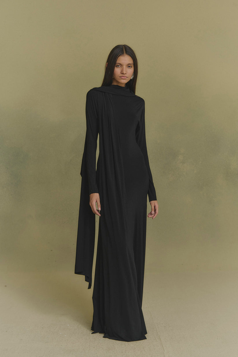 Long A-line dress with godets and dolman sleeves, made from stretch cupro. The Velora dress features a bateau neckline with a long integrated stole at the back, allowing it to be worn in multiple ways, as shown in the images.
