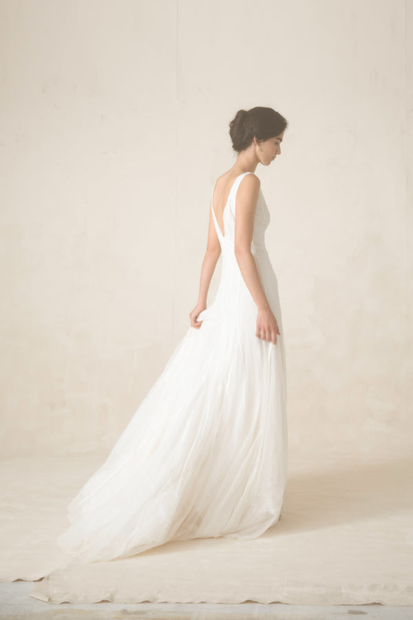 Dress made from cotton tulle with frayed silk satin ribbon appliqués along the seams. The Eve dress features a V-neckline on both the front and back, with a deeper cut in the back. It is lined with a double layer of stretch silk satin and finished with organza godets for added volume.