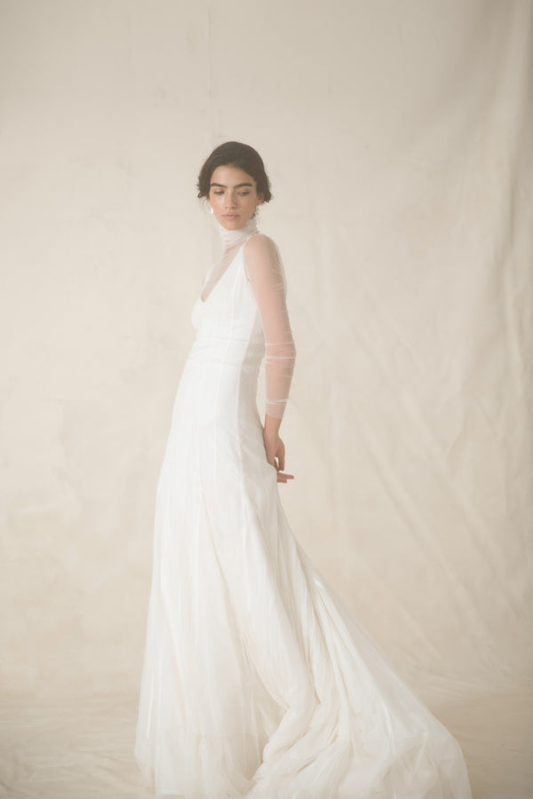 This dress can be worn with the Maxi Tulle or with the Volare long jacket, both made from silk tulle.