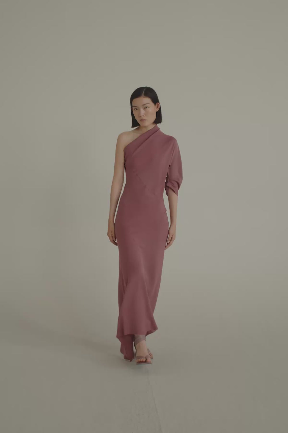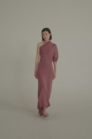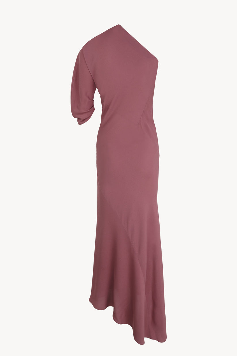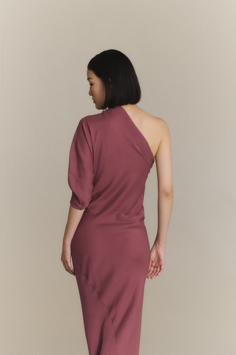 Vestido cortado al bies realizado en crepe de seda y con una sola manga. Este modelo tiene escote asimétrico y cortes asimétricos que entallan la cintura.