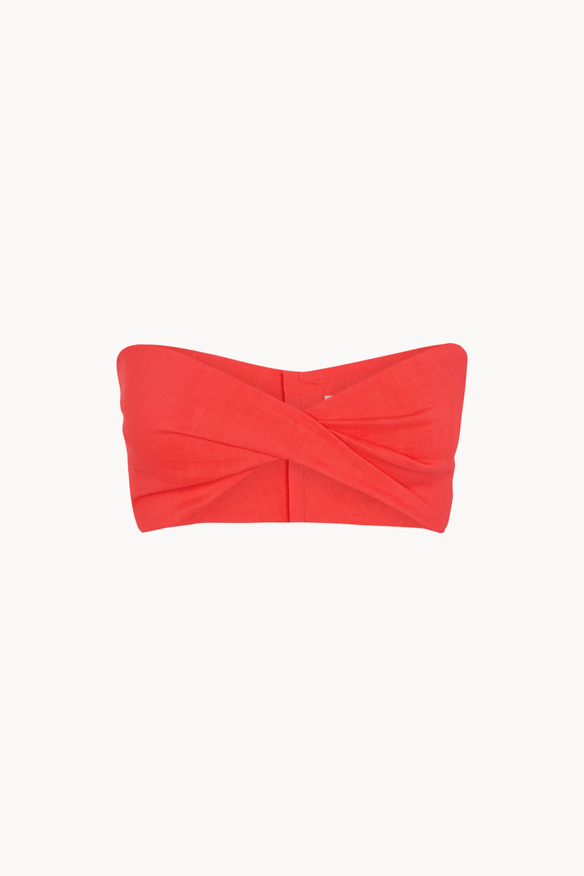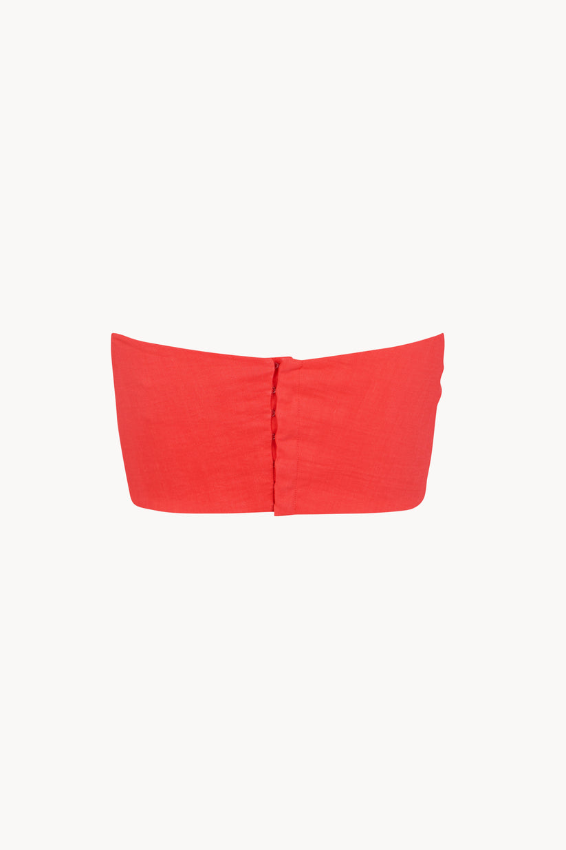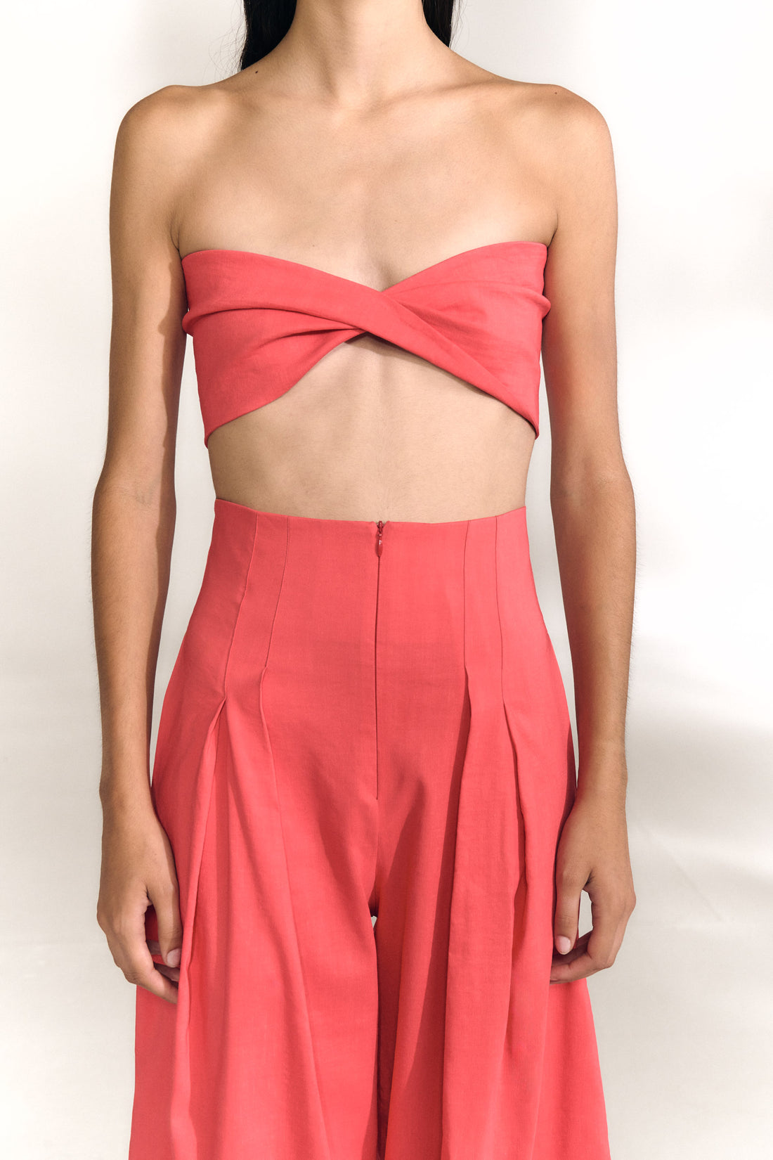 Top palabra de honor con drapeado realizado en un tejido stretch que de cáñamo y viscosa. El top Aman abrocha en la espalda con corchetes invisibles.