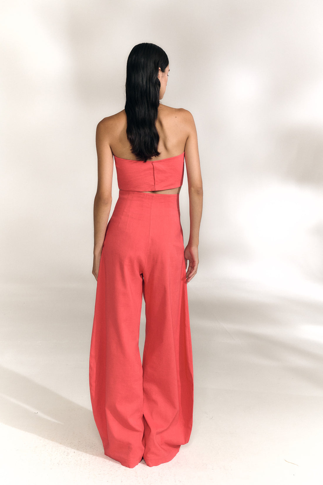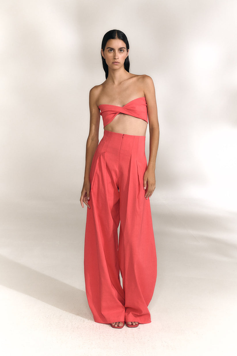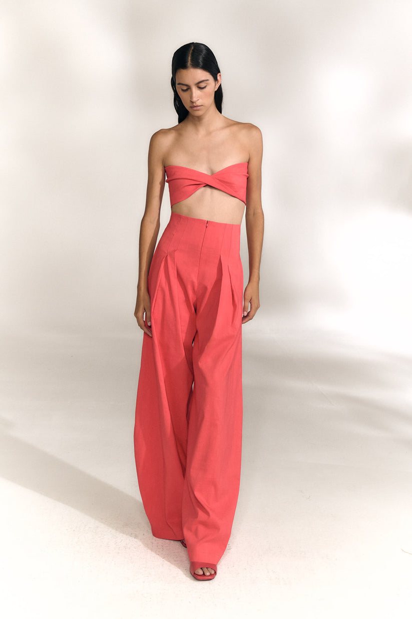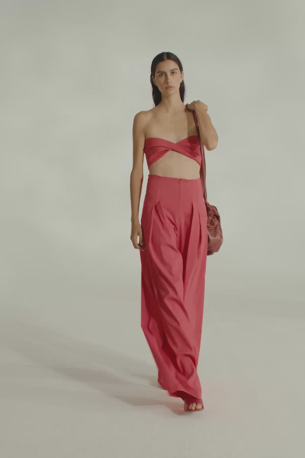 Top palabra de honor con drapeado realizado en un tejido stretch que de cáñamo y viscosa. El top Aman abrocha en la espalda con corchetes invisibles.