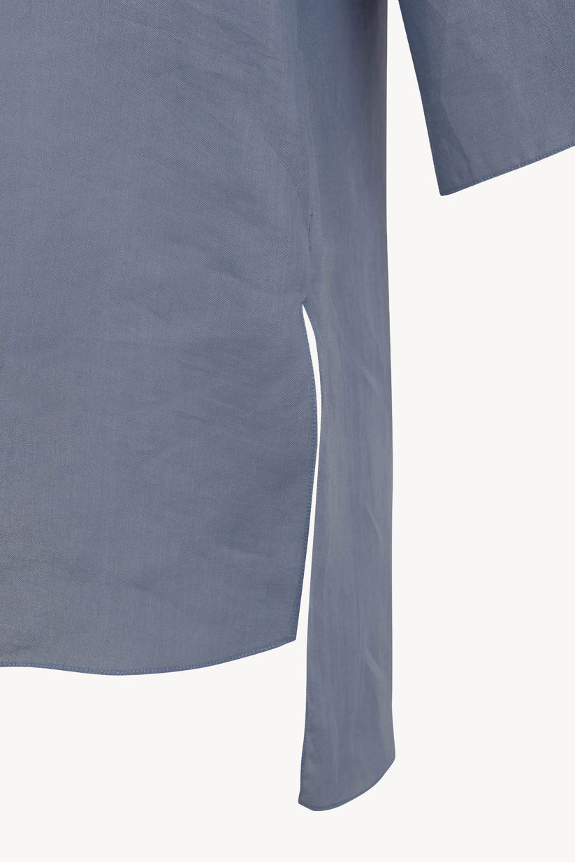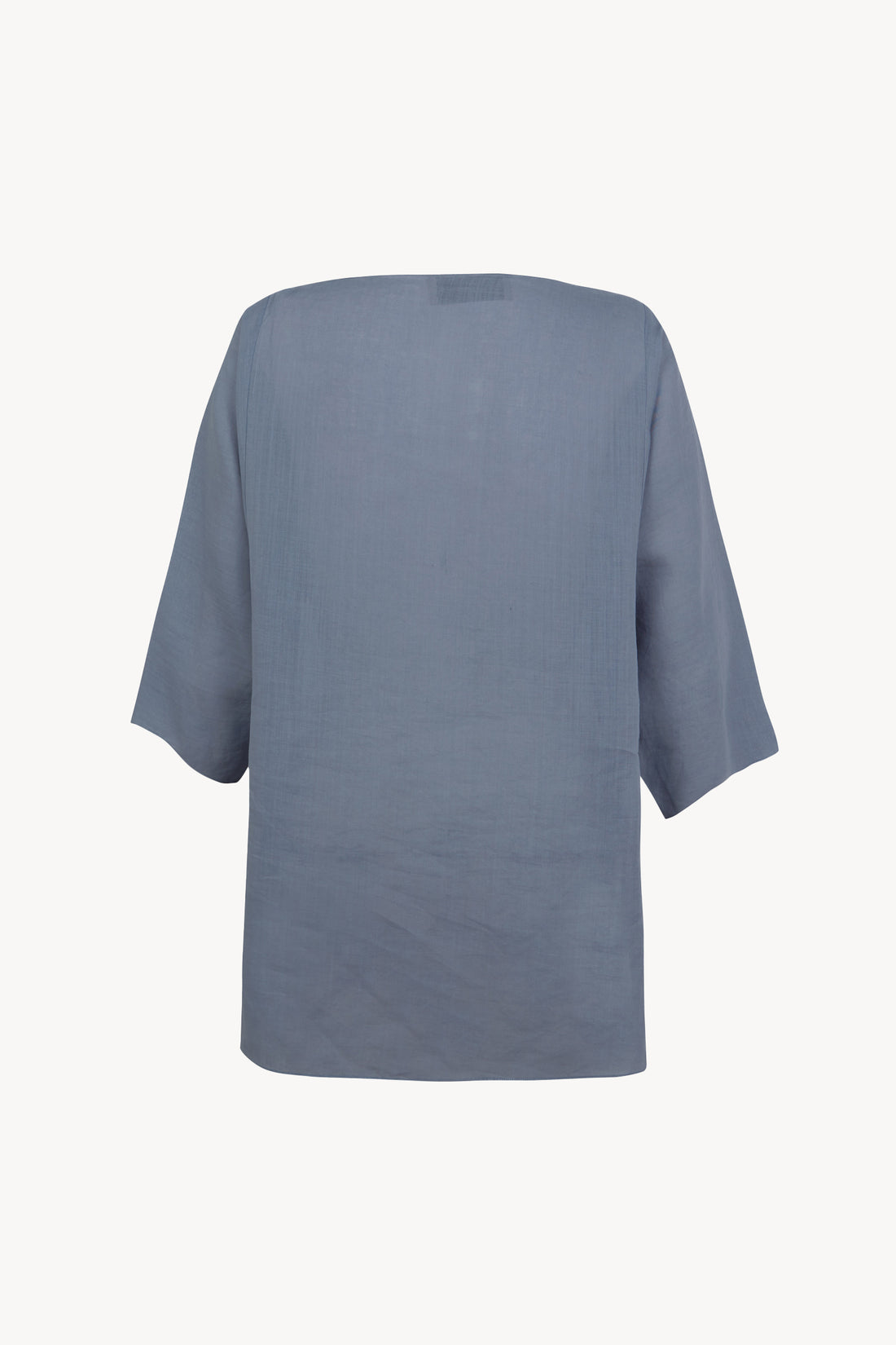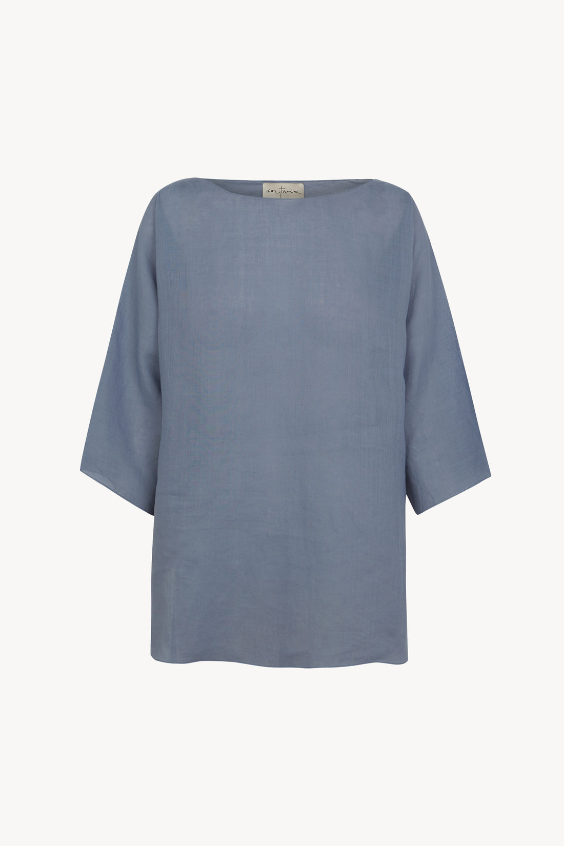 Top oversize realizado en ramio, tiene cuello barco, manga japonesa y la parte posterior es ligeramente más larga.