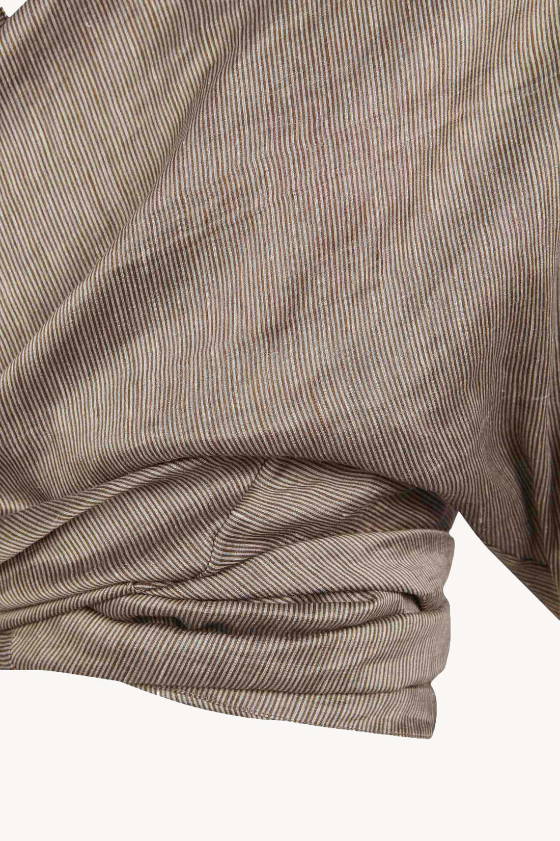Chaqueta realizada en un estampado milrayas que combina lino y seda. La chaqueta Aria tiene dos lazadas que permiten llevarla suelta o cruzada y atada en la espalda.