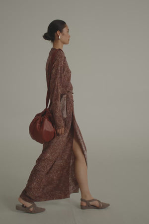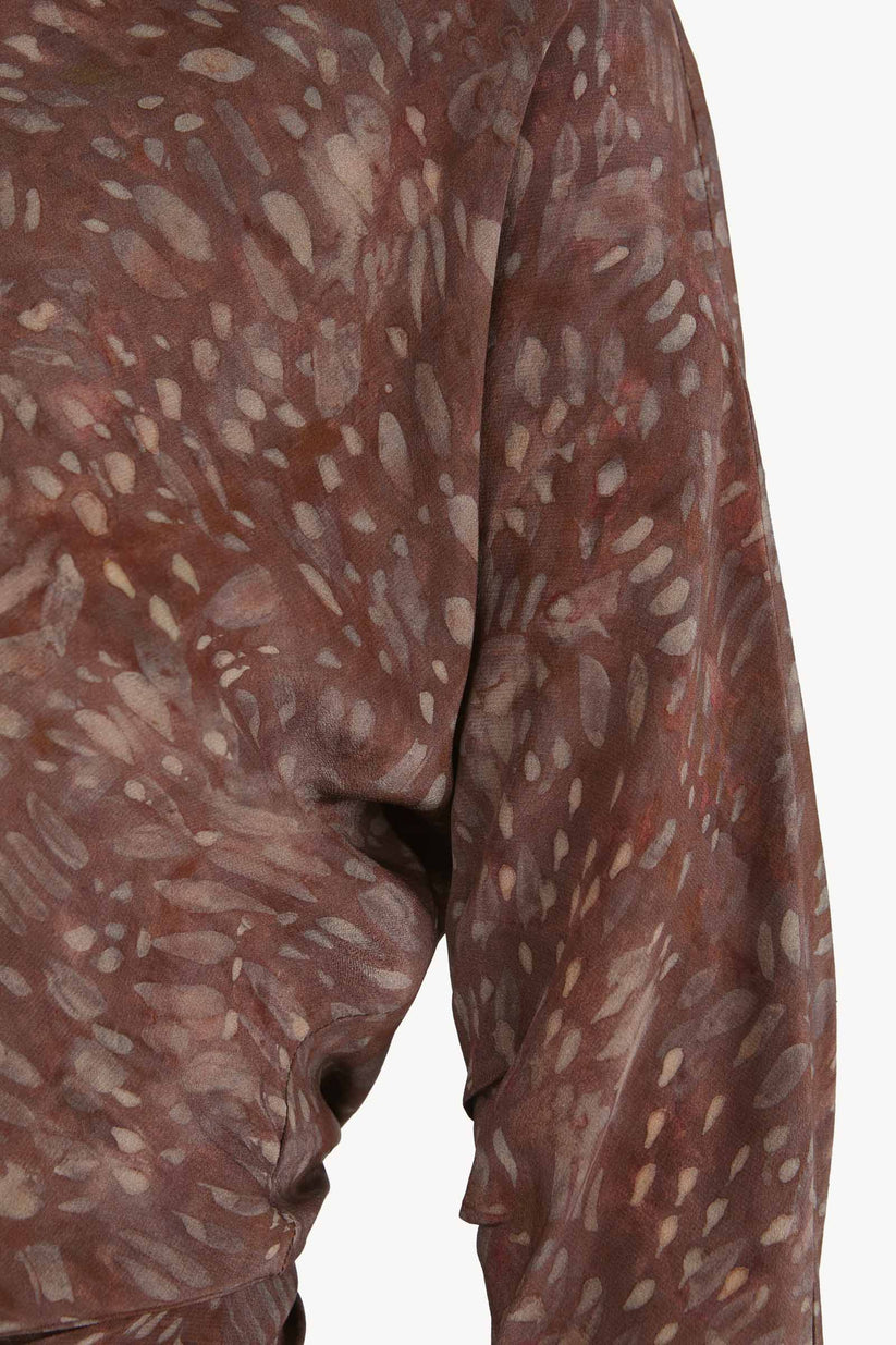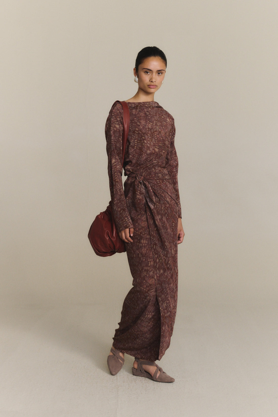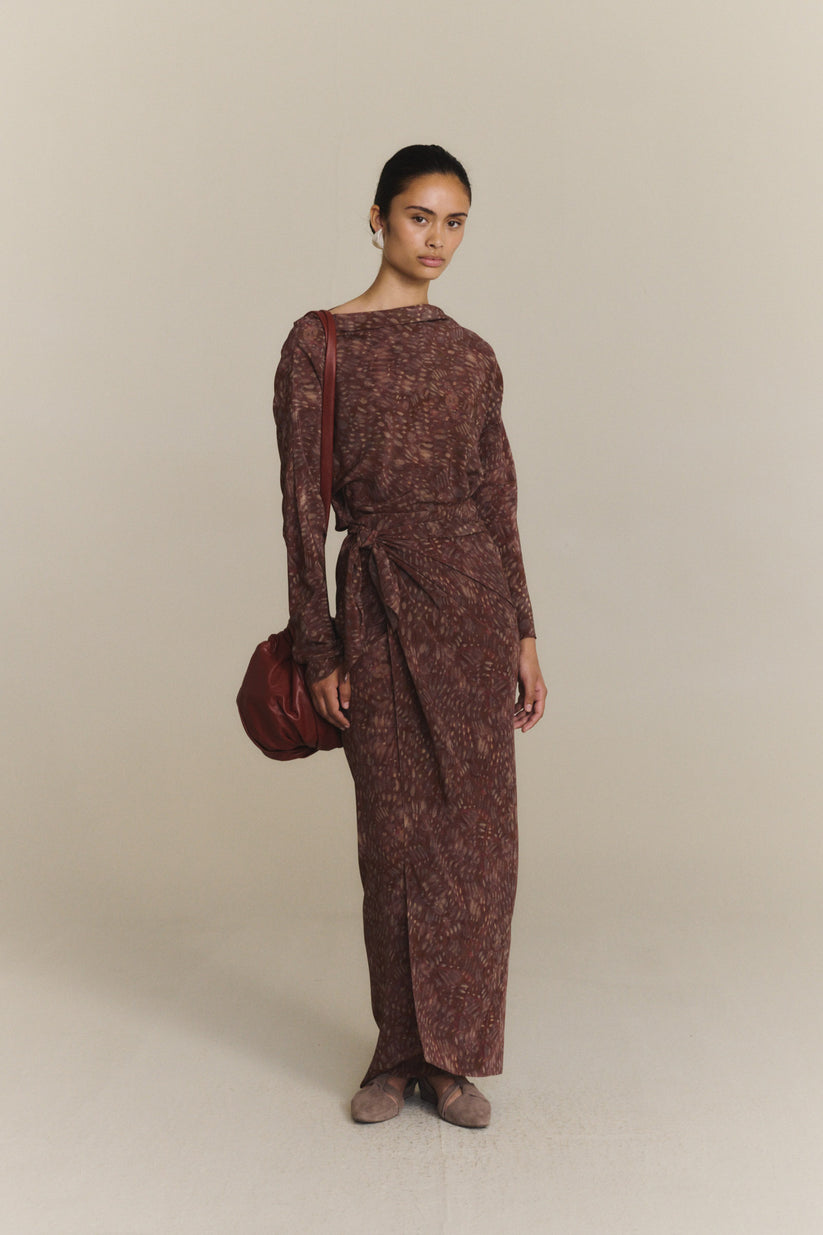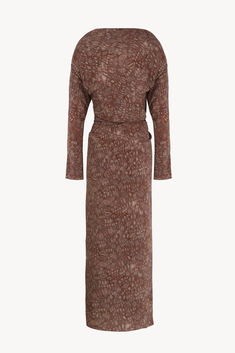 Vestido envolvente cortado al bies realizado en seda estampada. El vestido Astrid tiene manga japonesa con pliegues, escote asimétrico y lleva incorporada una falda tipo pareo que se ajusta en la cintura. Este estampado exclusivo parte de una acuarela realizada por la directora creativa de Cortana.