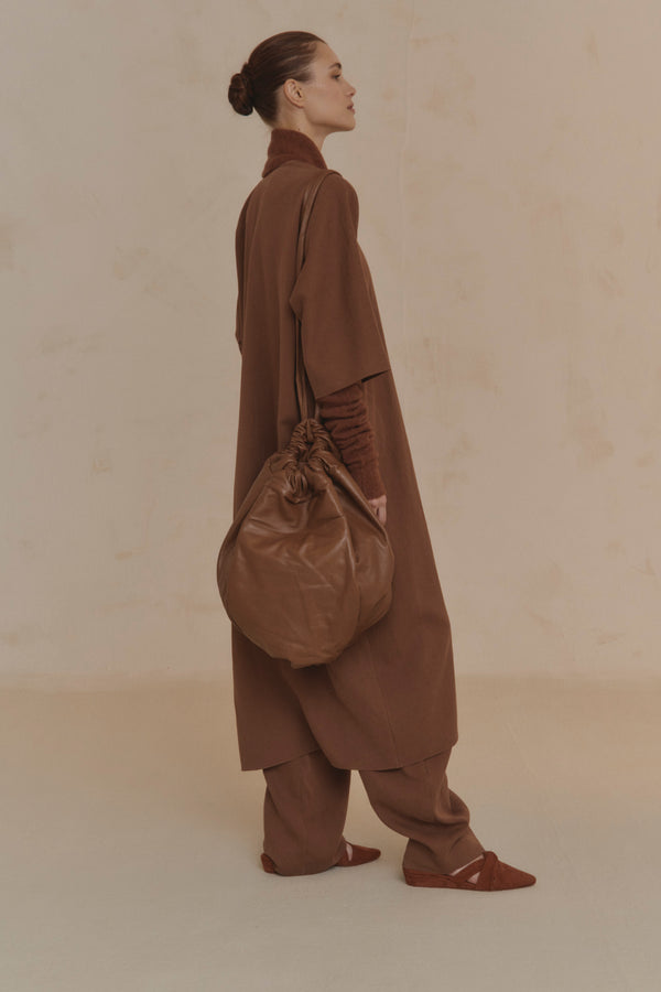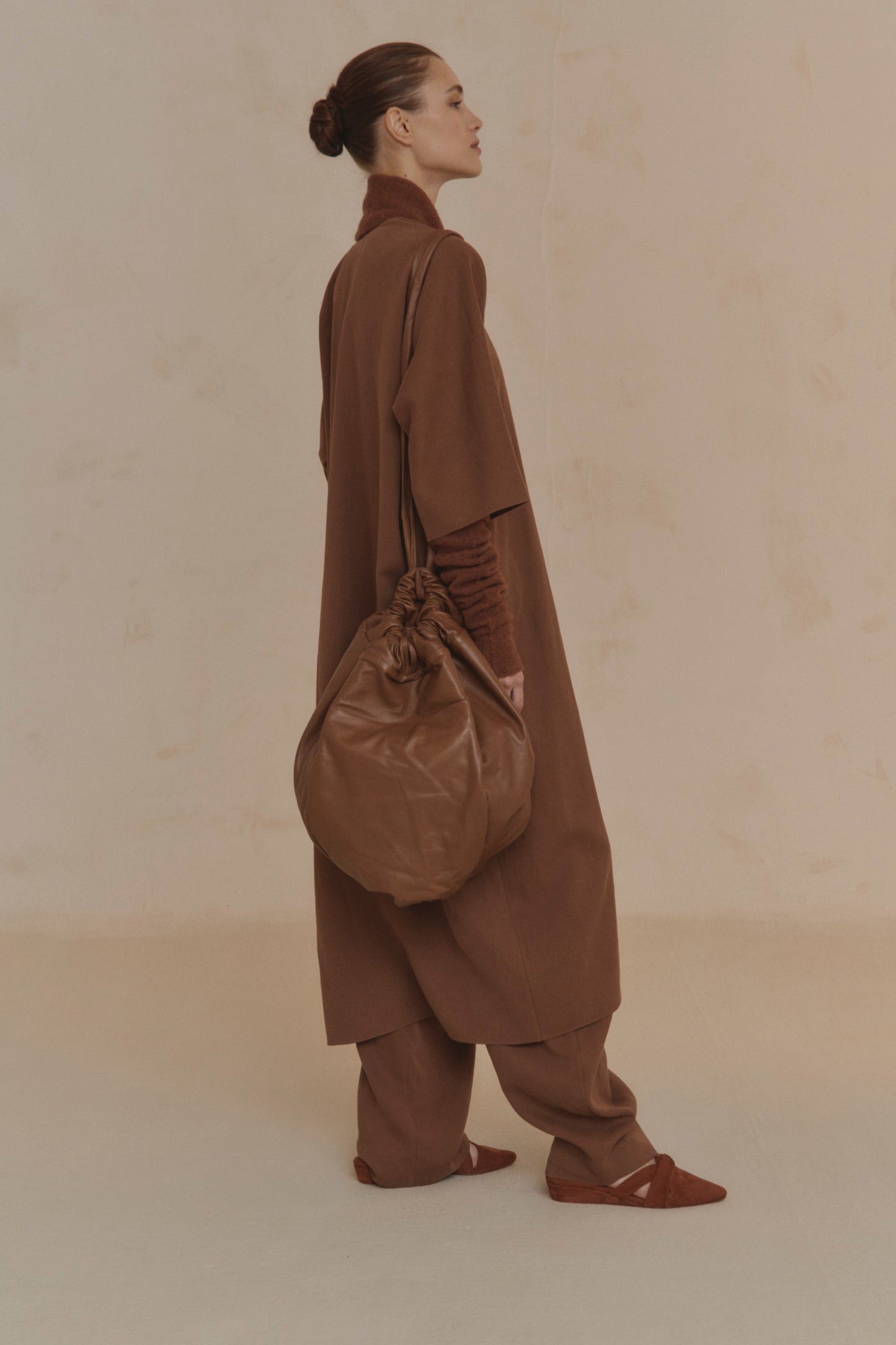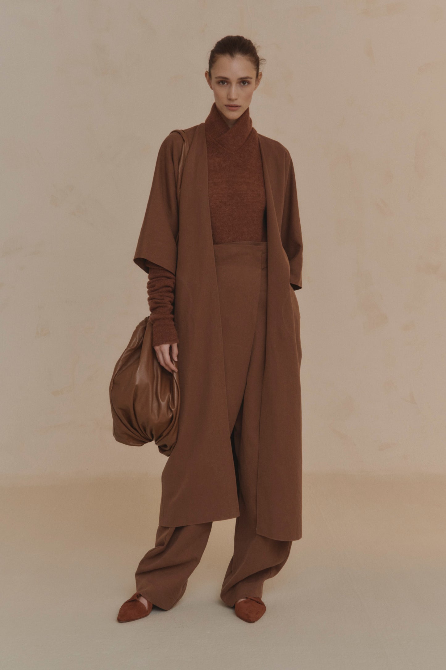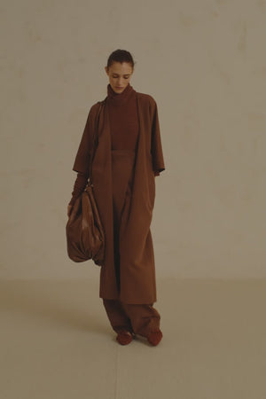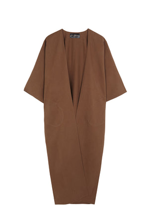 Abrigo largo oversize de lino grueso con mangas tres cuartos y bolsillos laterales. Este diseño está cortado en una sola pieza.