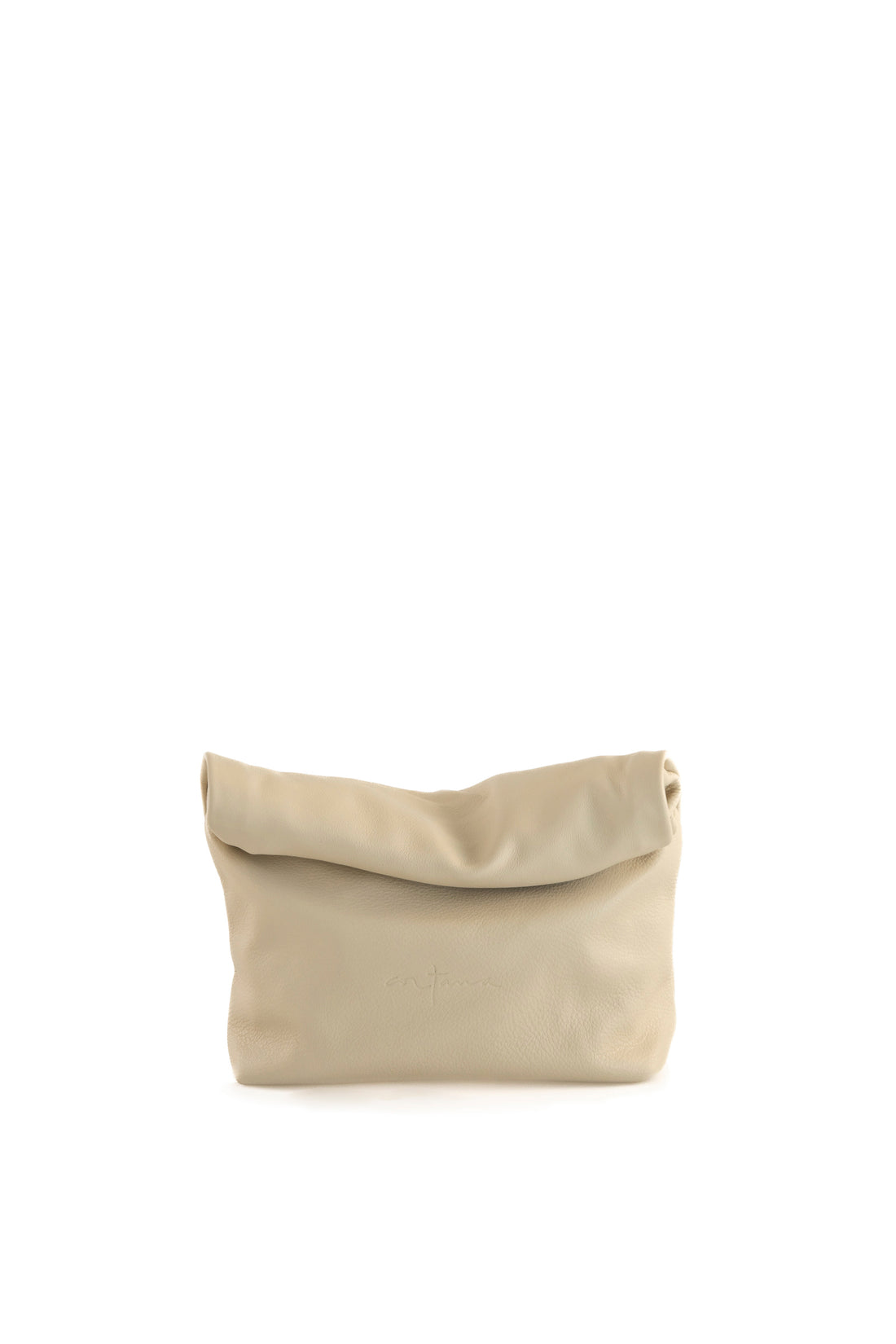 Bolso de mano plegable fabricado en España y realizado en piel napa. El bolso Delhi cierra mediante un imán interior invisible. Detalle frontal de logo con relieve.