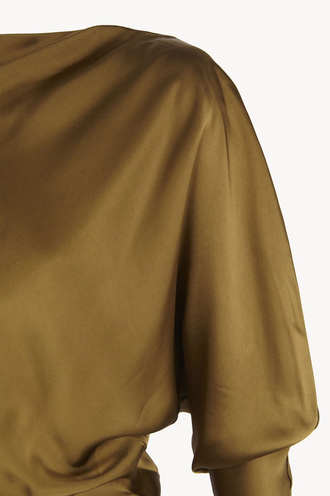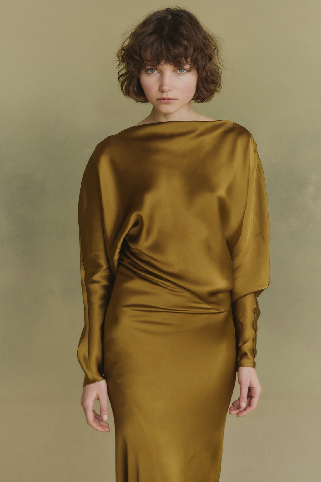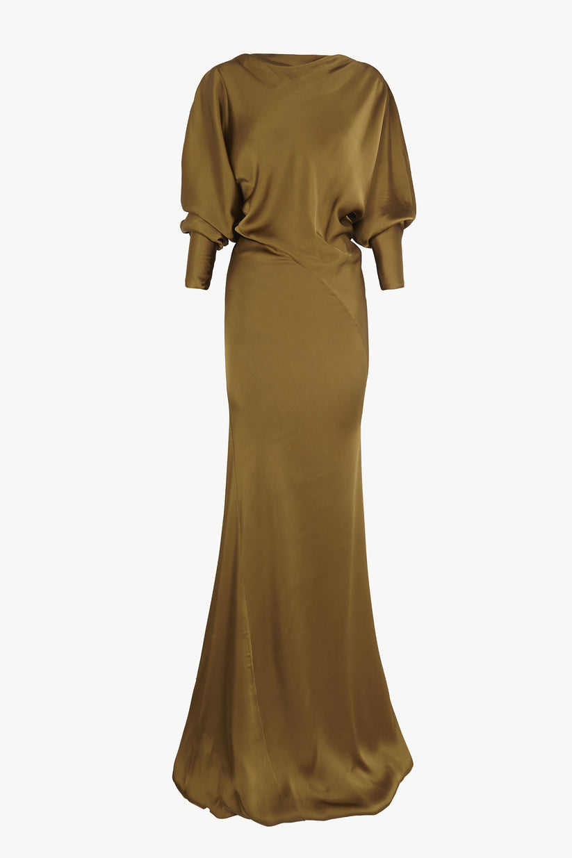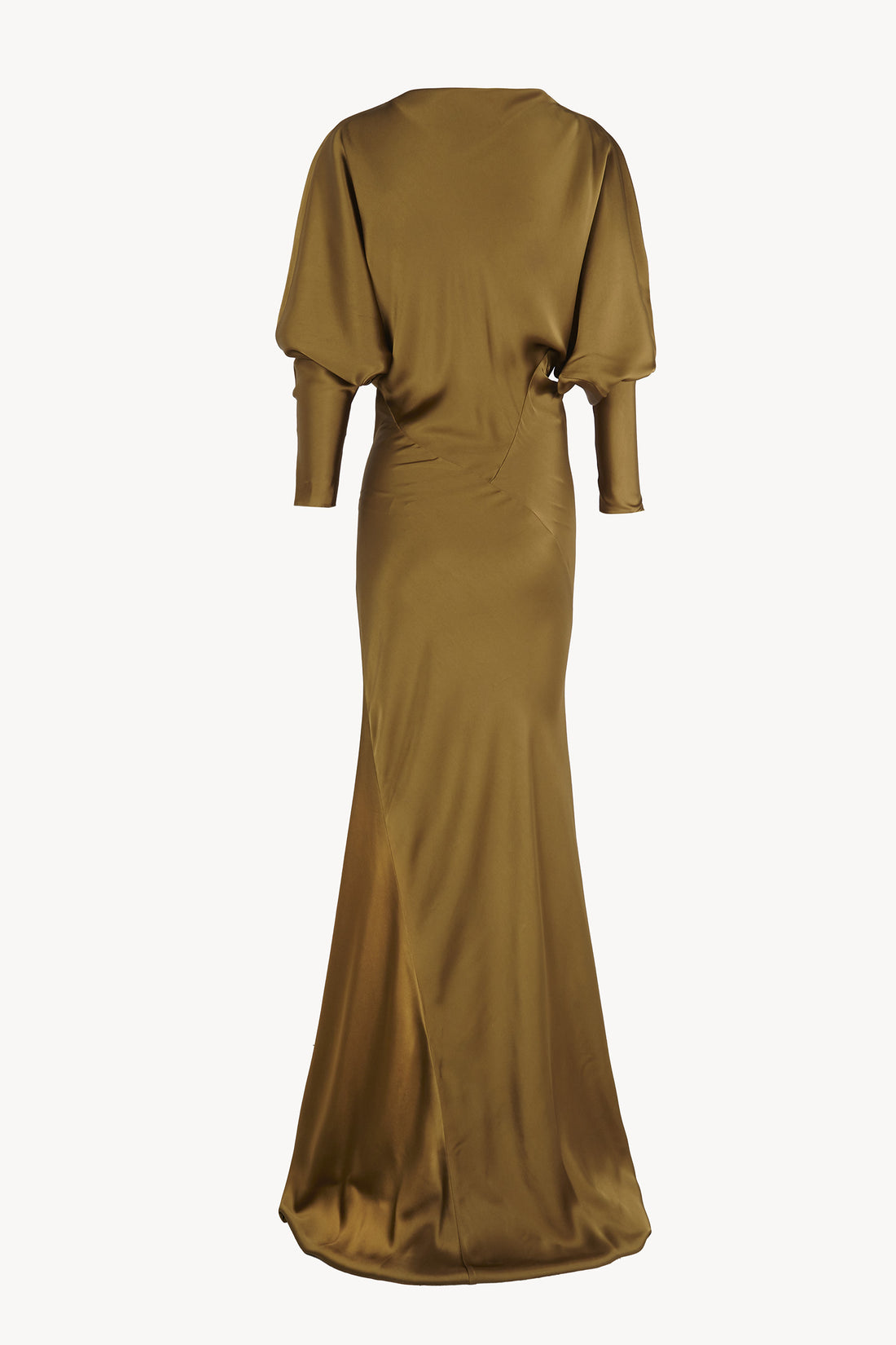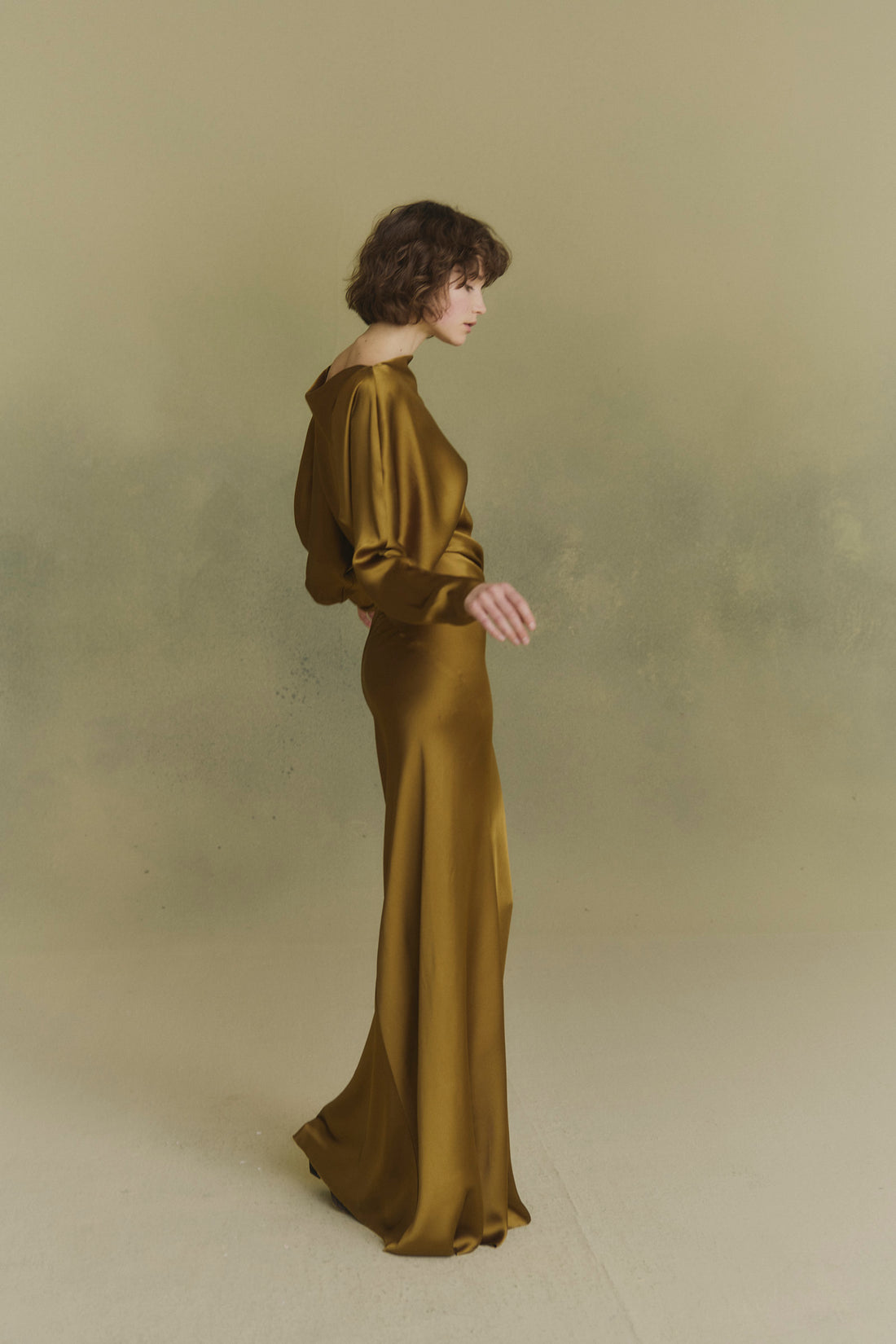 Vestido largo de fiesta confeccionado en hilatura de acetato y viscosa en tono dorado. Cortado al bies, con escote barco y manga larga japonesa.