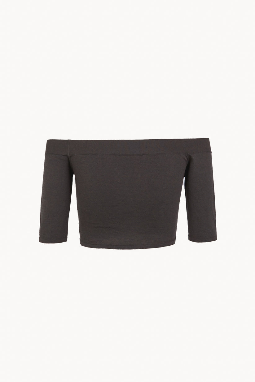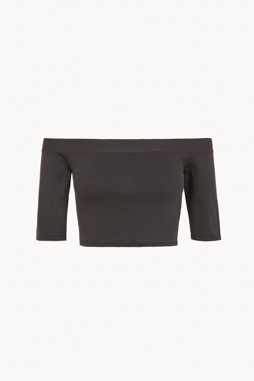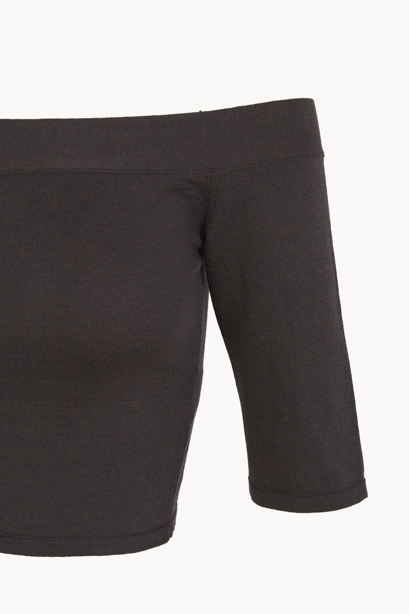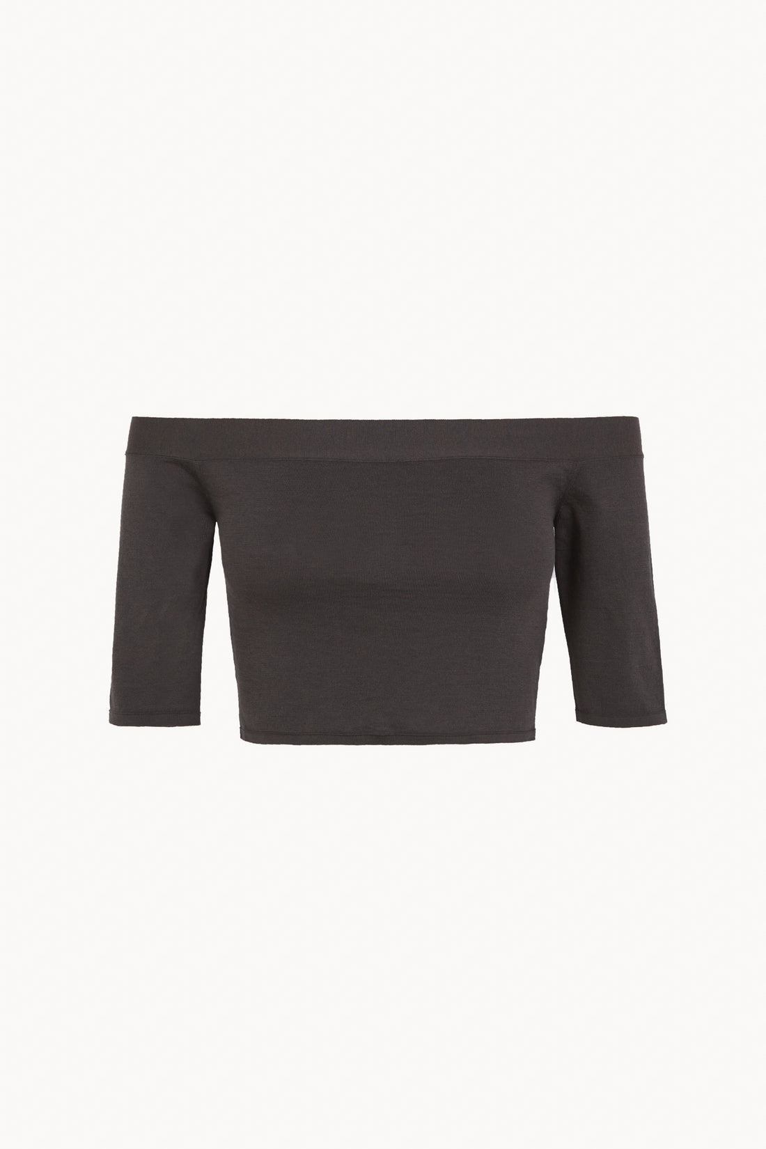 Crop top de punto de seda y algodón orgánico stretch con hombros descubiertos y manga corta.