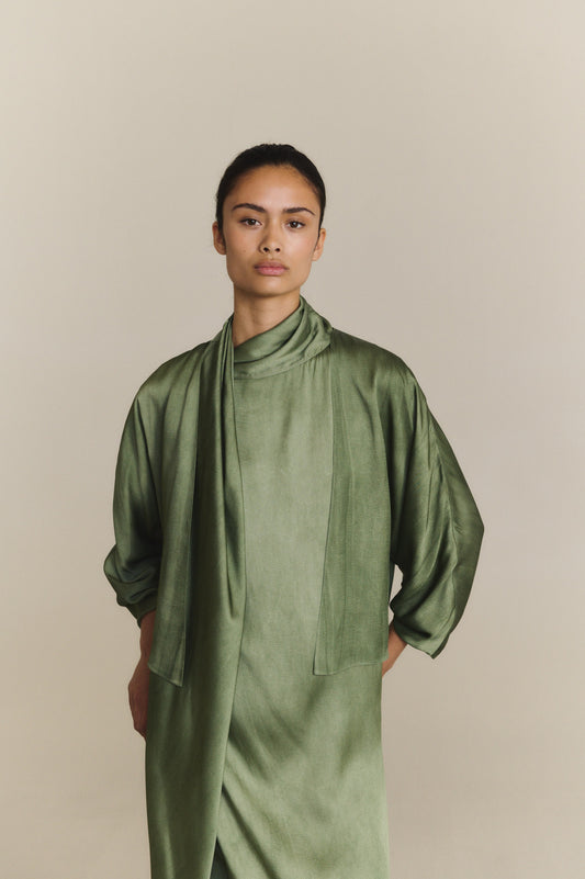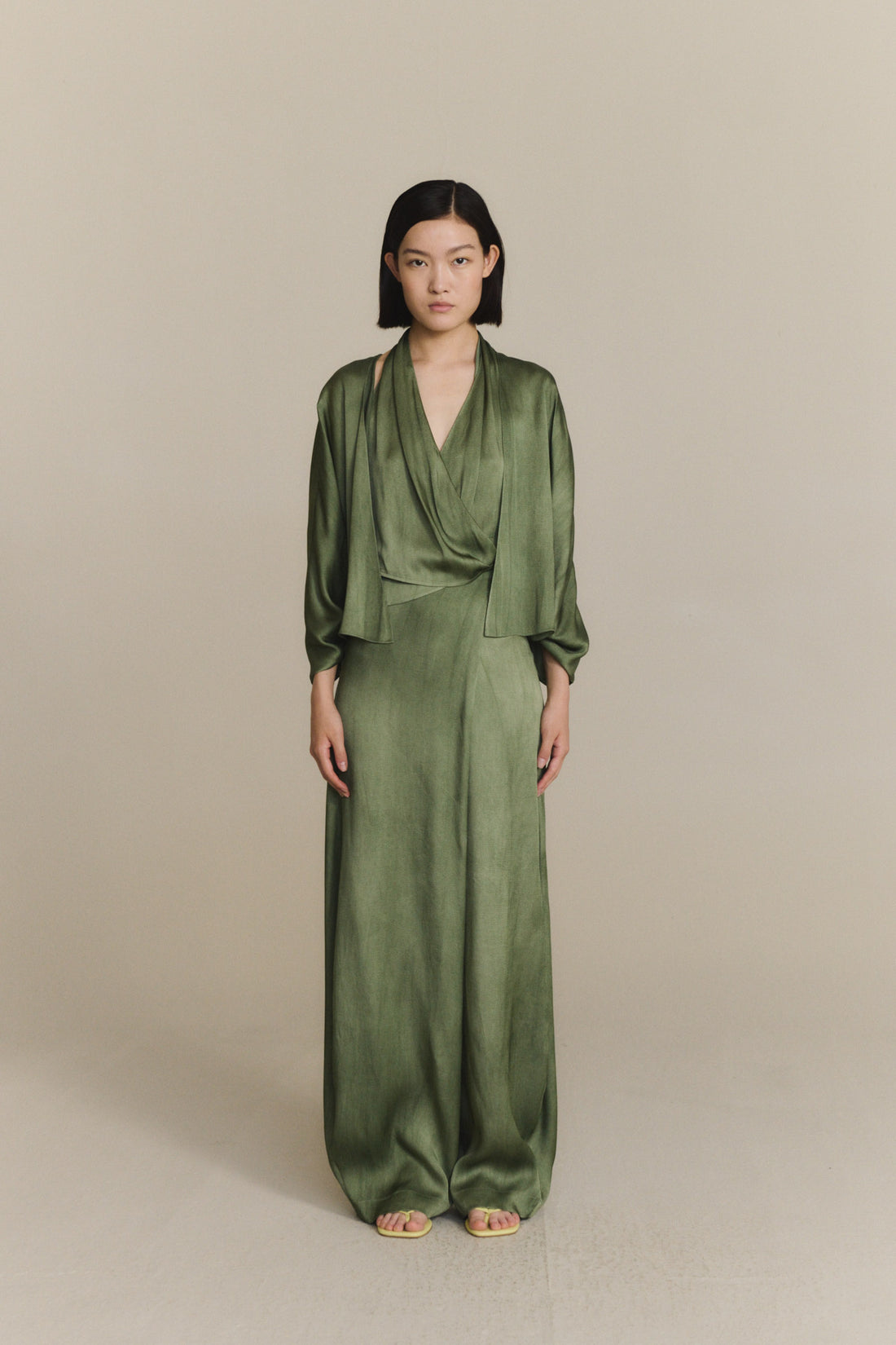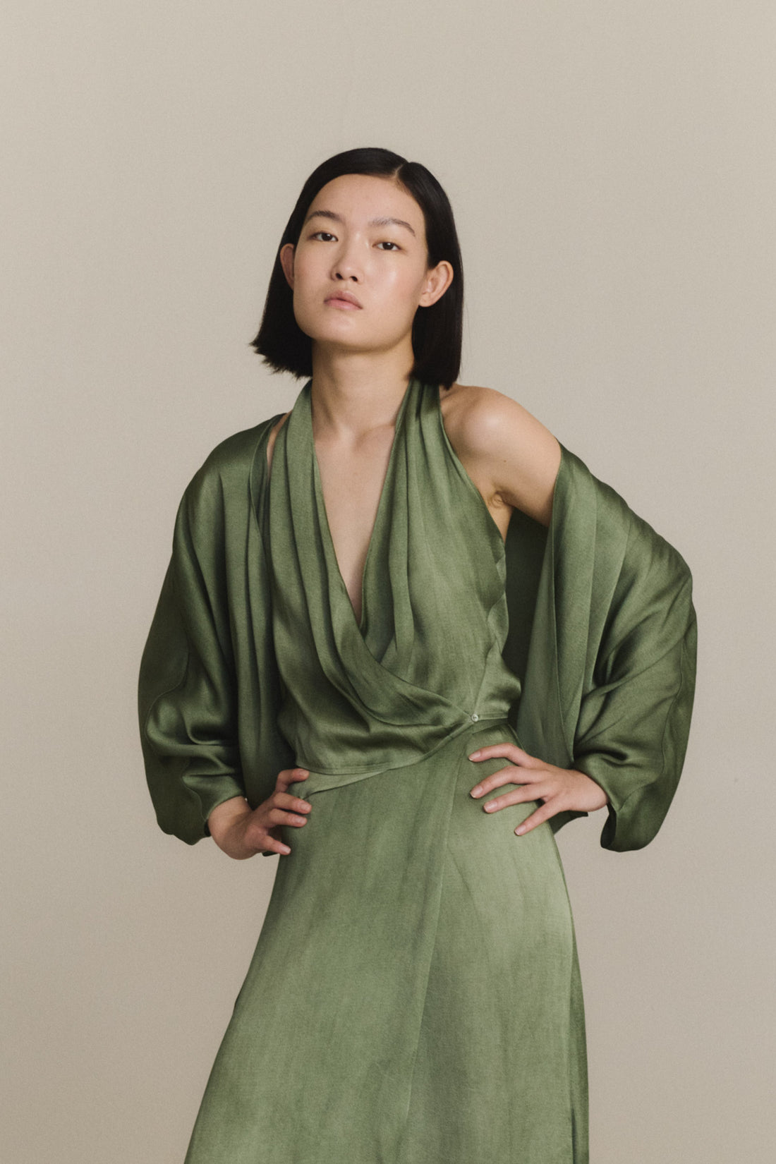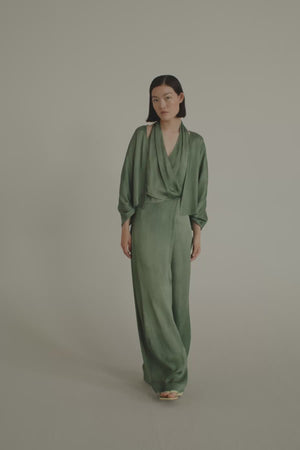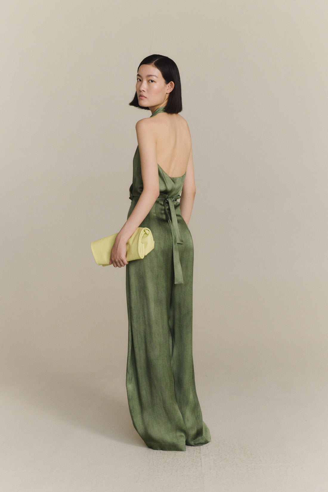 Pantalón de talle alto envolvente realizado en un tejido satinado maltinto. El pantalón Elea se cruza en el delantero y se ajusta con una lazada del mismo tejido que se ata en la espalda creando una silueta fluida y sofisticada.