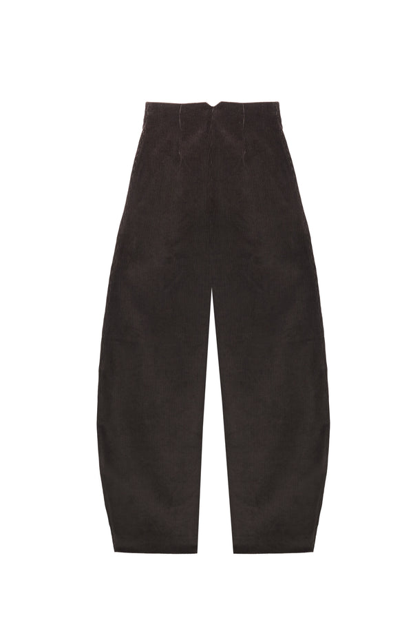 Pantalón de pana de talle alto con una ligera curvatura en la pierna y cremallera invisible en el delantero. Modelo realizado en un tejido de pana que combina algodón, lino y cachemir.