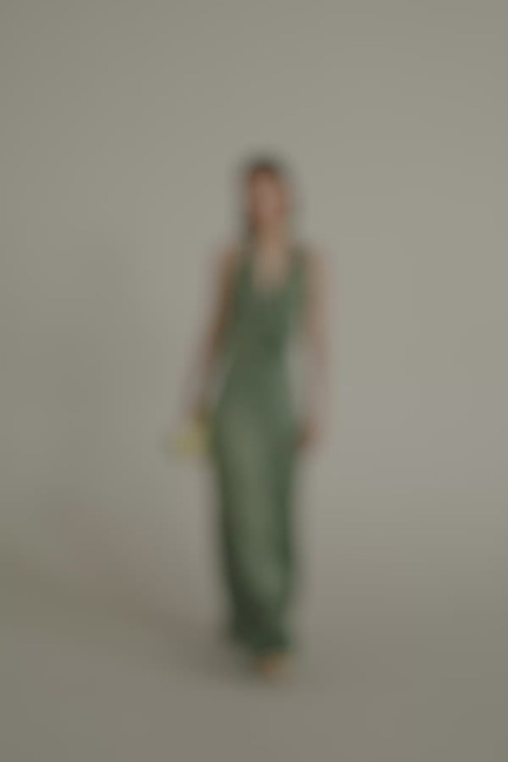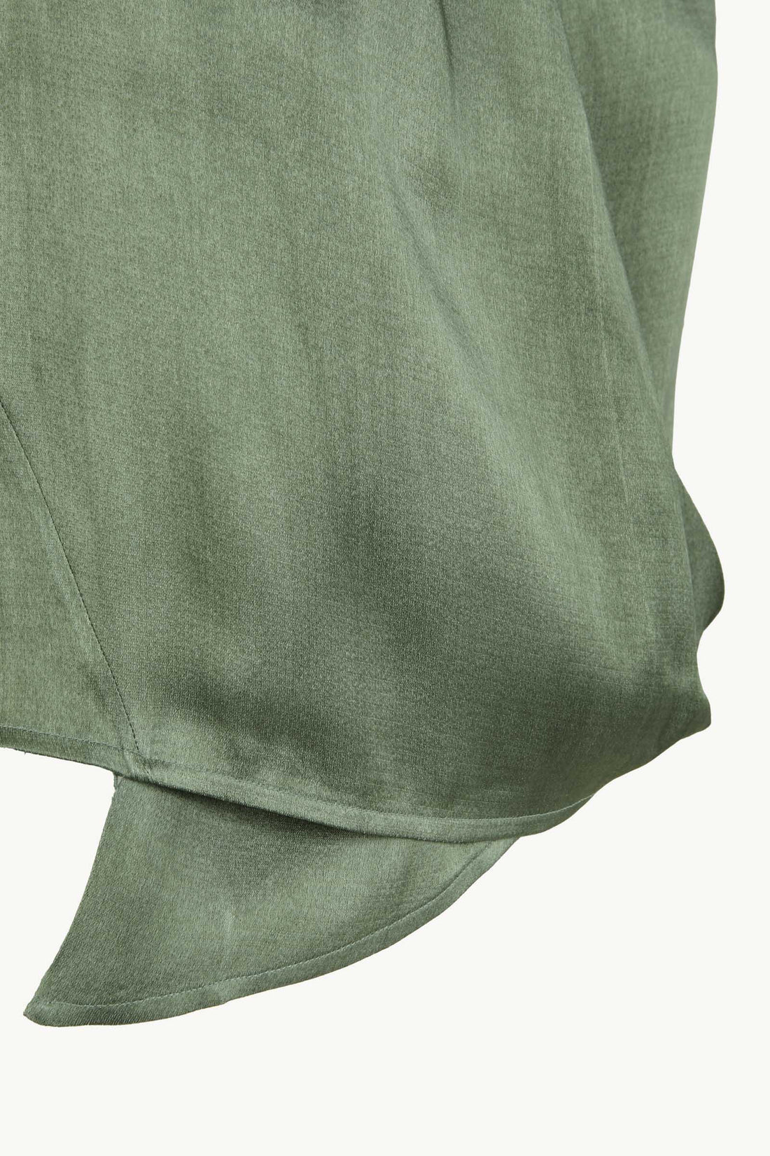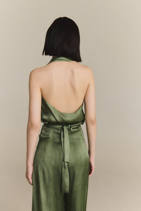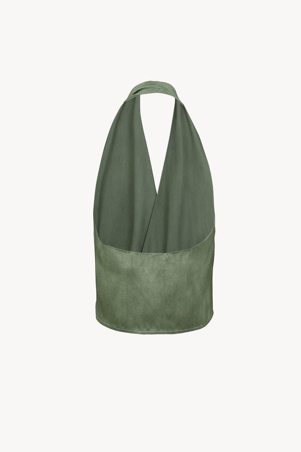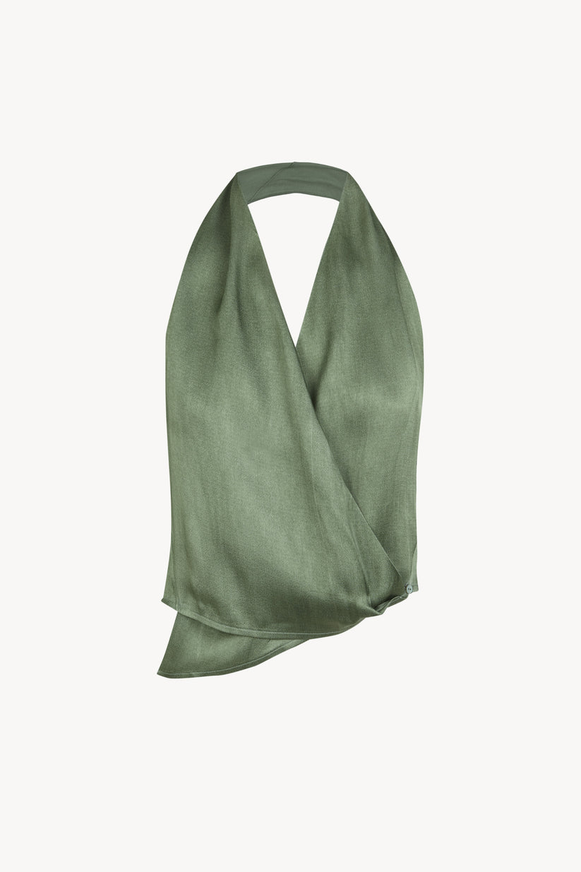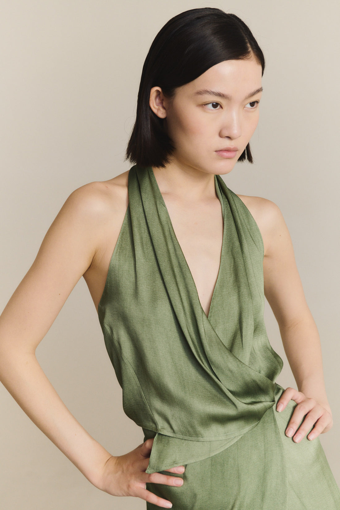 Top halter realizado en un tejido con acabado satinado maltinto. El top Etna presenta un diseño cruzado en el delantero con bajo asimétrico y abrocha mediante dos botones pequeños.