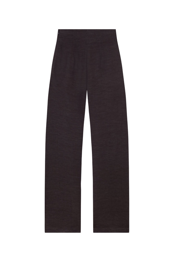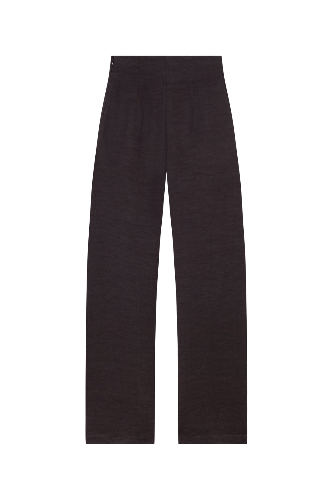 Pantalón de talle alto realizado en un tejido que combina lino y viscosa. Este diseño tiene cierre con cremallera lateral y la pierna tiene una ligera curvatura.