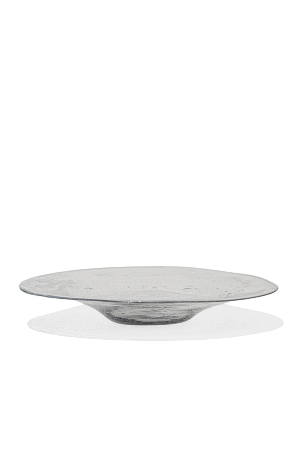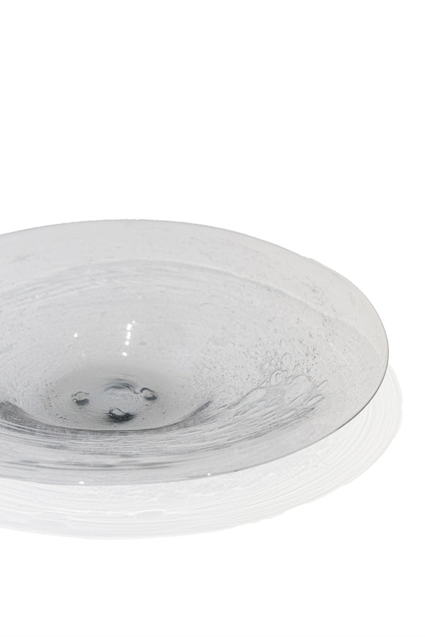 Fuente de vidrio soplado, fabricada a partir de vidrio reciclado, este proceso facilita la generación de burbujas en el interior, estas irregularidades confieren a cada pieza un aspecto único.
