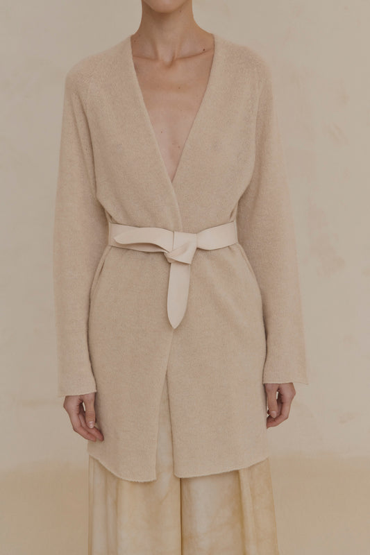 Chaqueta abierta de punto realizada con un hilo que combina lana de baby alpaca, cachemir y seda. La chaqueta Hana tiene un corte recto y no lleva botones.