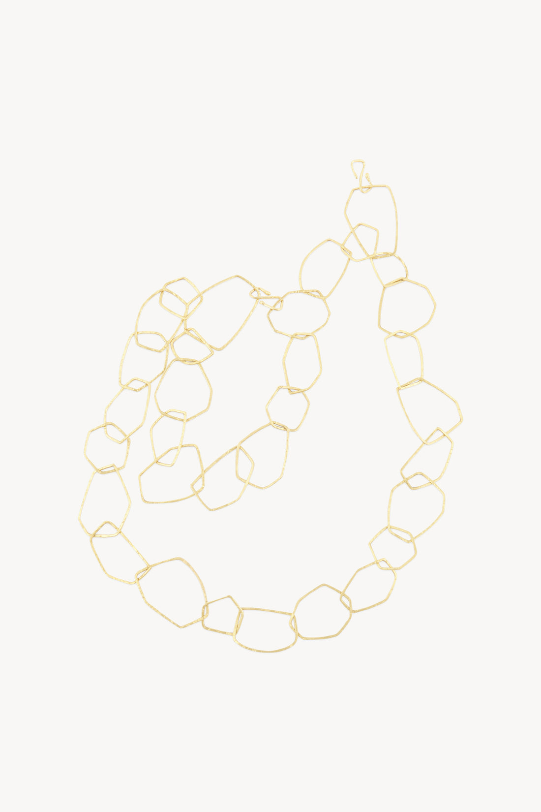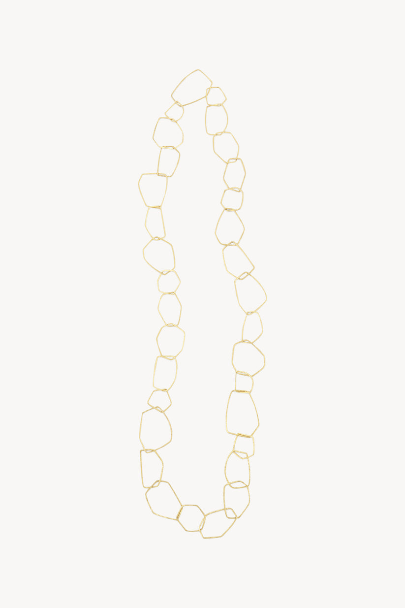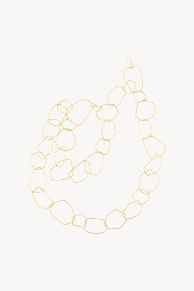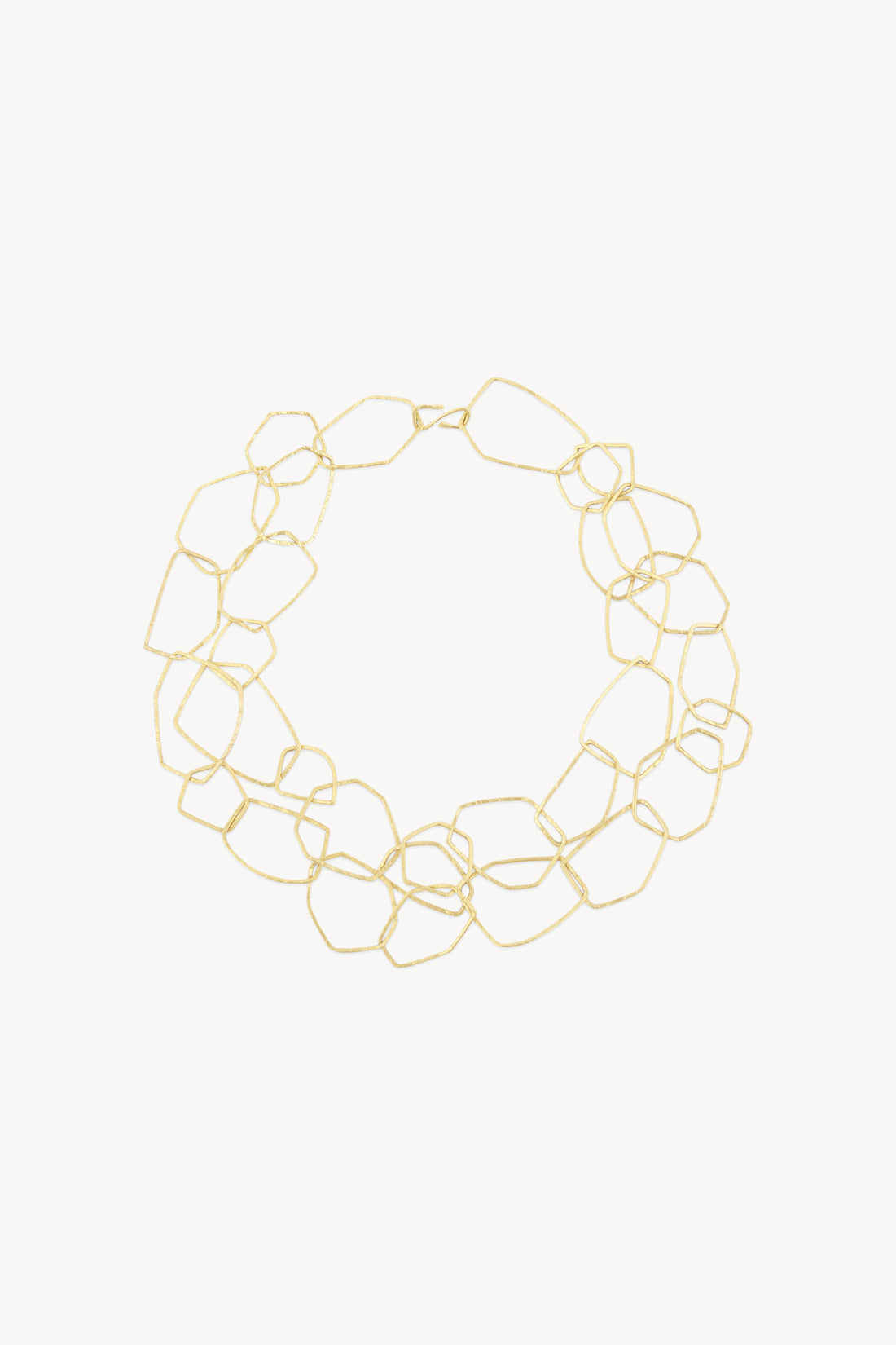 Collar de aros entrelazados de tamaños irregulares, realizado a mano en plata de ley y chapado en oro. Esta pieza ha sido diseñada por la directora creativa de la firma y producida en talleres artesanos de Mallorca. El collar pertenece a la colección Irus y se vende con dos enganches que permiten regular la pieza a diferentes alturas y jugar con diferentes formas.