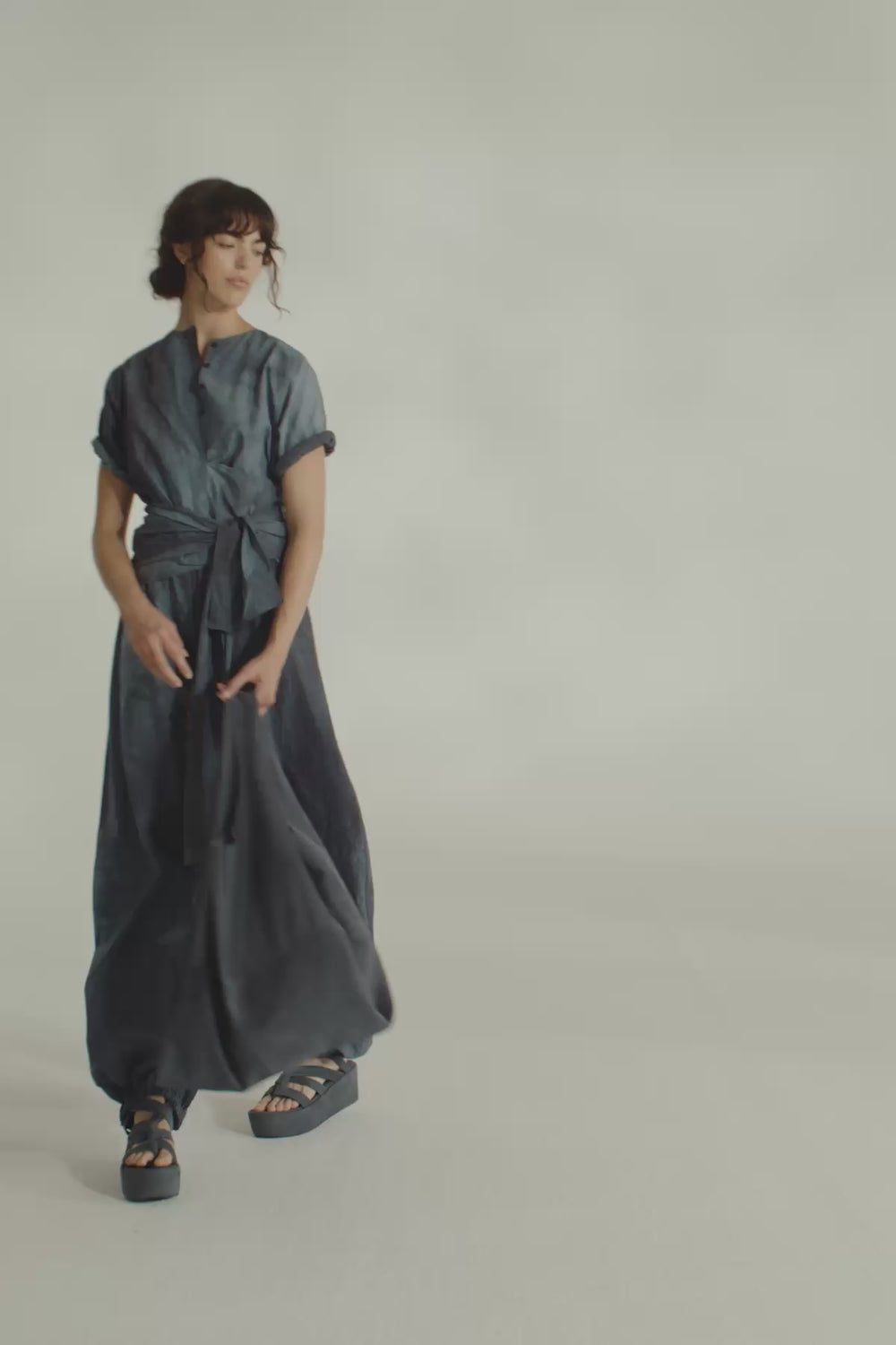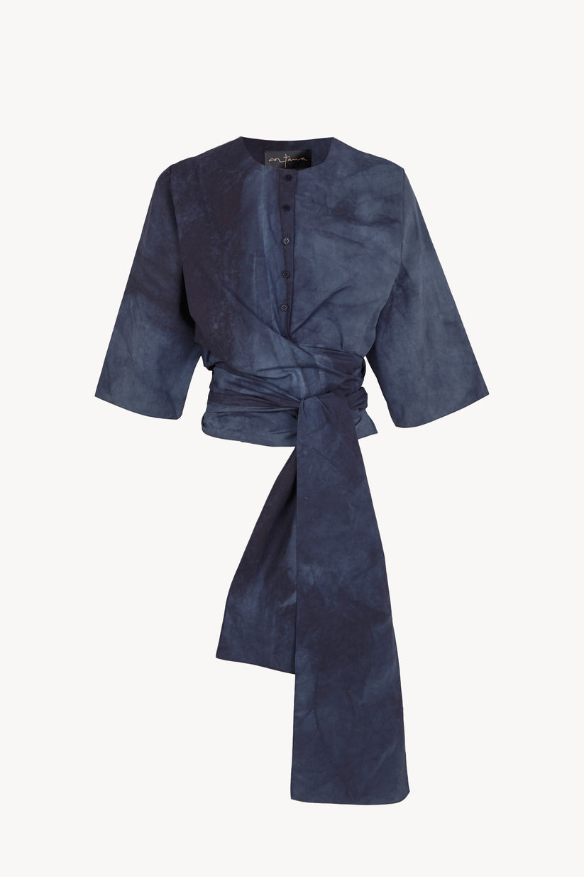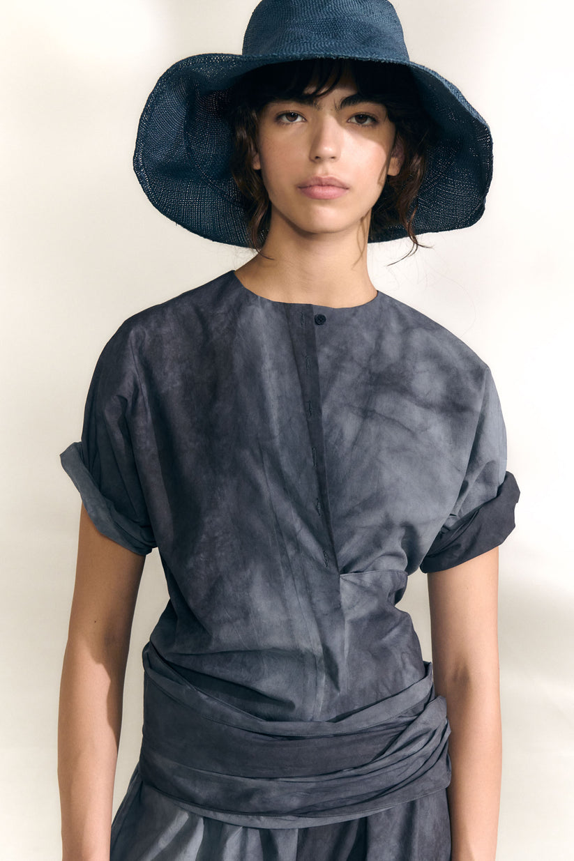 Camisa con cuello redondo, manga japonesa tres cuartos y cierre frontal con botones de corozo a tono. El top Isla está confeccionado en popelín de algodón orgánico con acabado maltinto. Tiene una lazada que se lleva atada a la cintura.