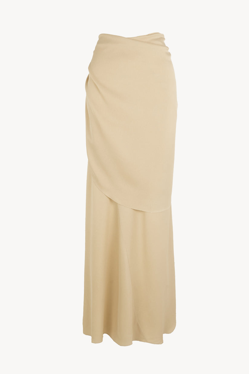 Falda asimétrica cortada al bies realizada en crepe de seda. La falda Isolde tiene cinturilla elástica y una sobrefalda que puede llevarse de diversas maneras.