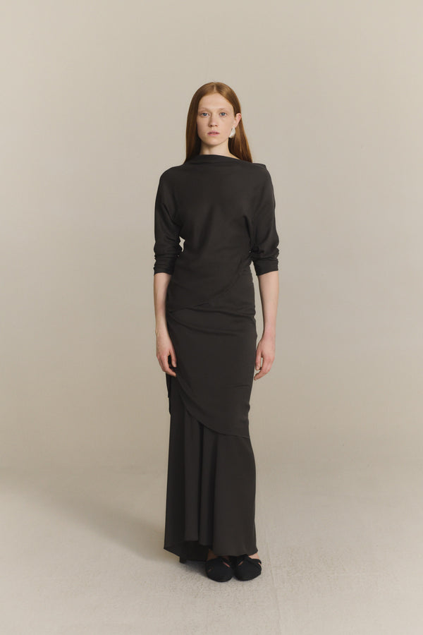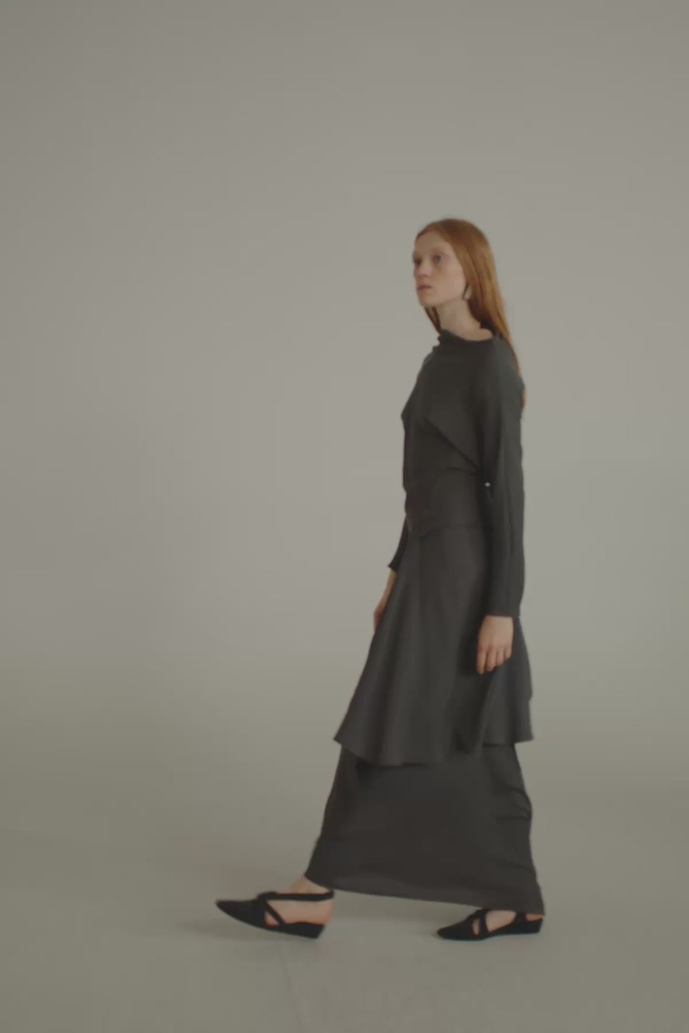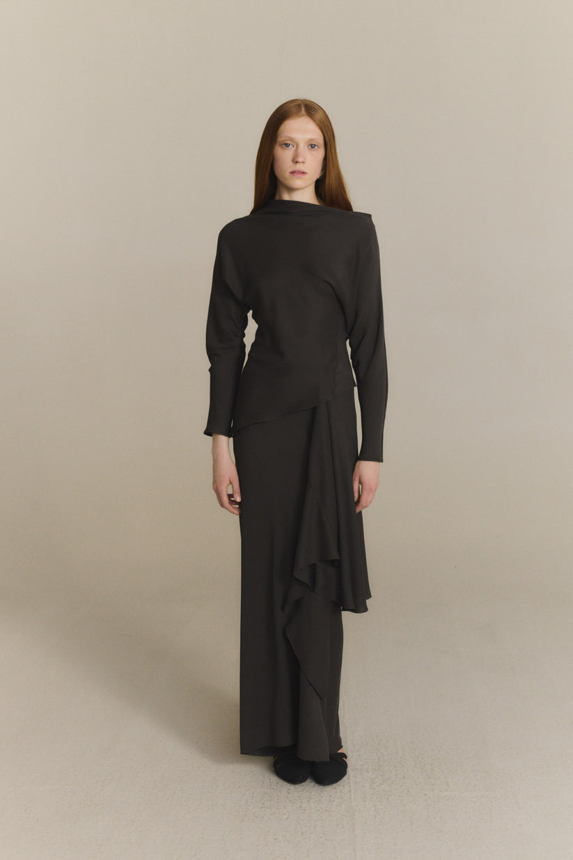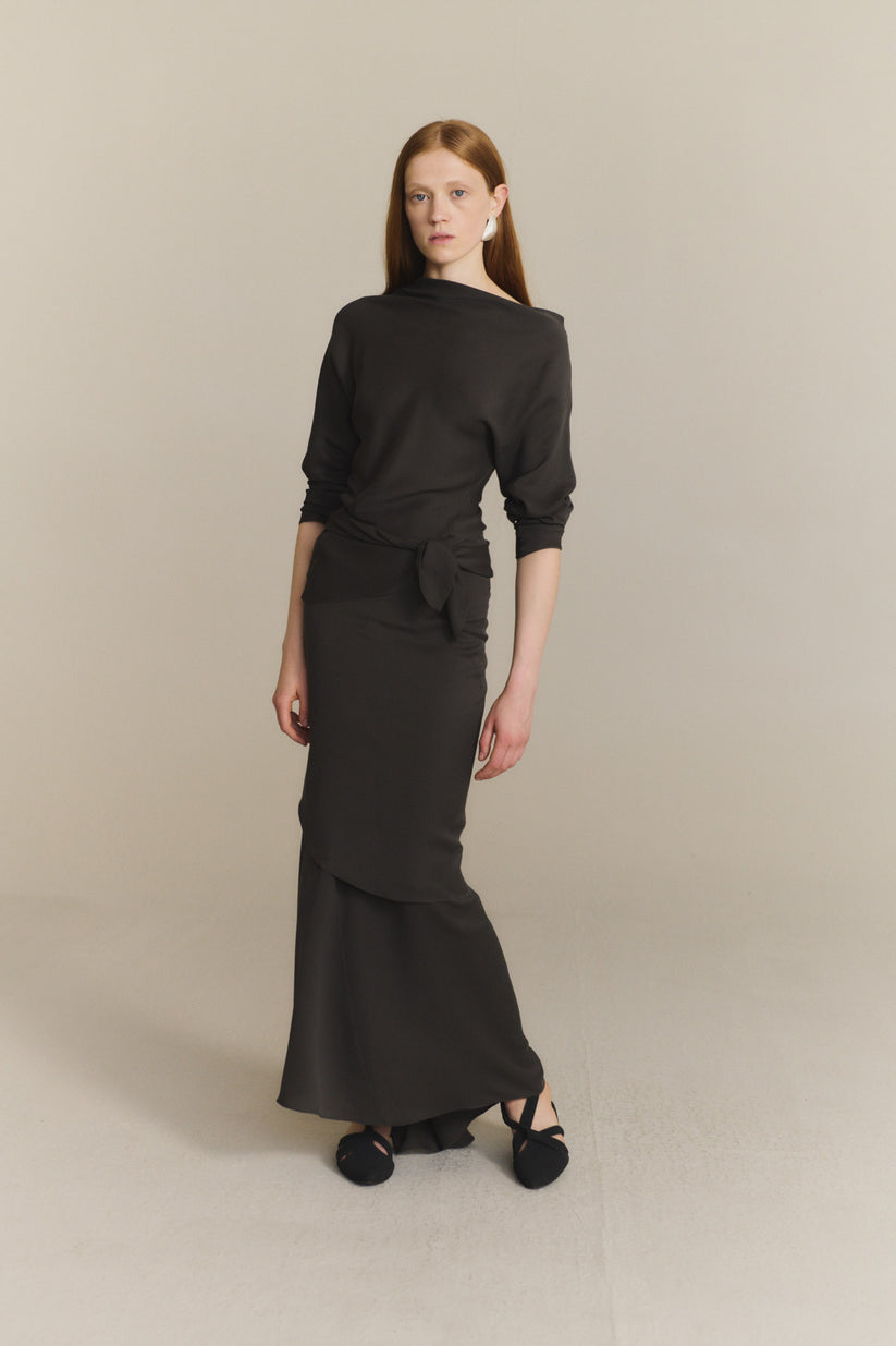 Falda asimétrica cortada al bies realizada en crepe de seda. La falda Isolde tiene cinturilla elástica y una sobrefalda que puede llevarse de diversas maneras.