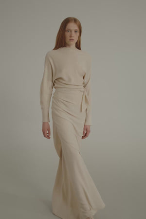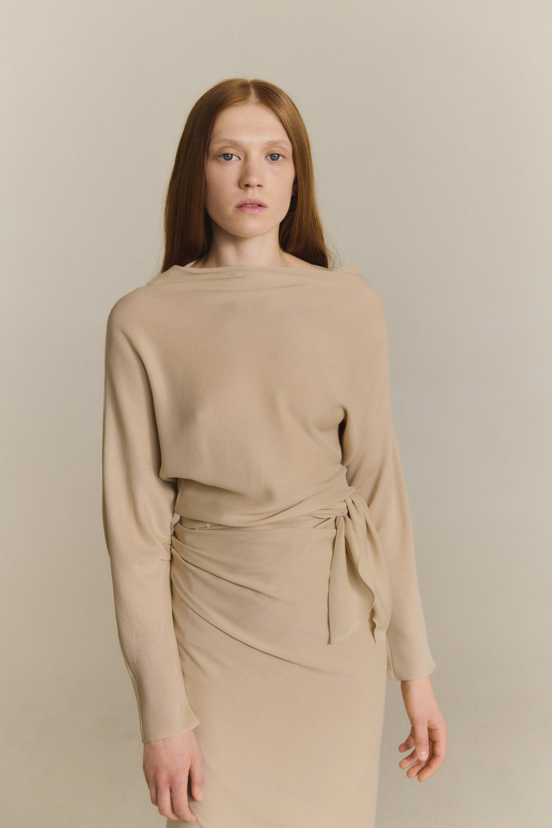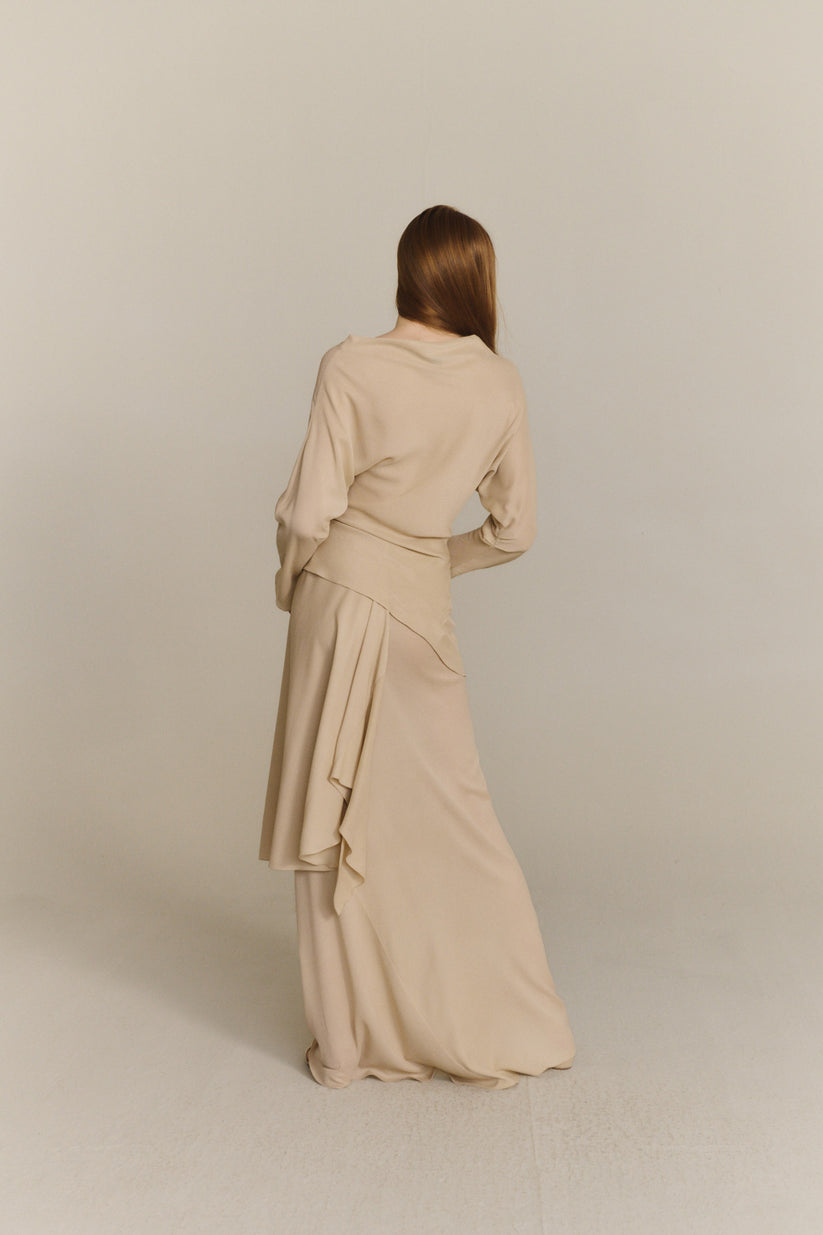 Top cortado al bies realizado en crepe de seda. El top Isolde tiene manga larga japonesa con pliegues y escote barco asimétrico.