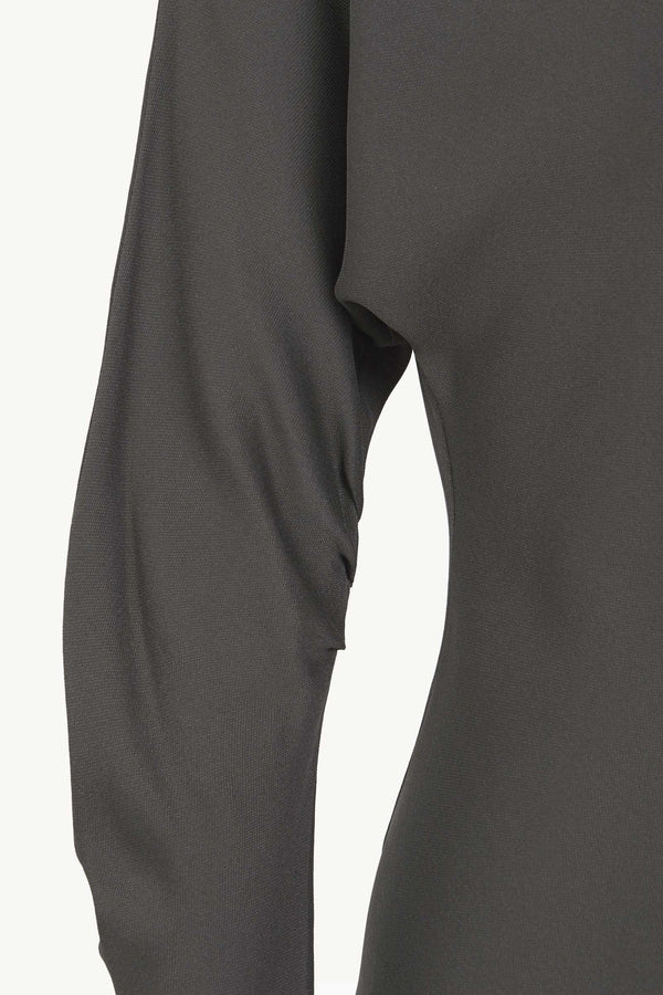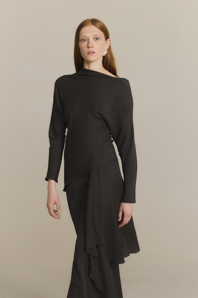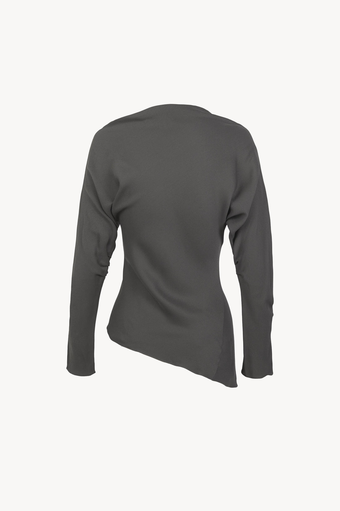 Top cortado al bies realizado en crepe de seda. El top Isolde tiene manga larga japonesa con pliegues y escote barco asimétrico.