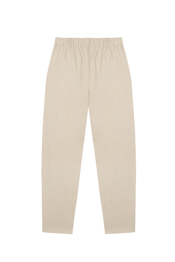 Pantalón realizado en tejido que combina lana y cachemir, lleva pinzas y queda ligeramente fruncido al tener una goma interior en la cintura. Bolsillos laterales.