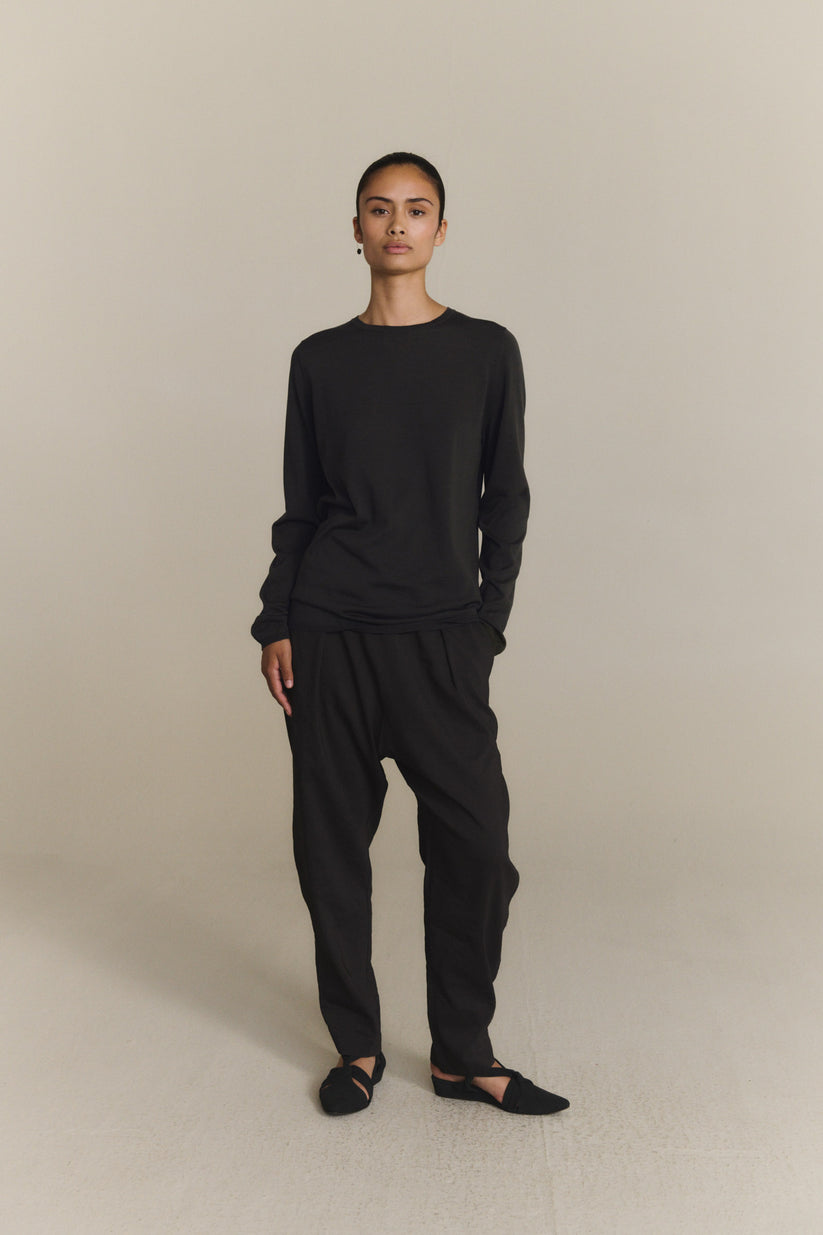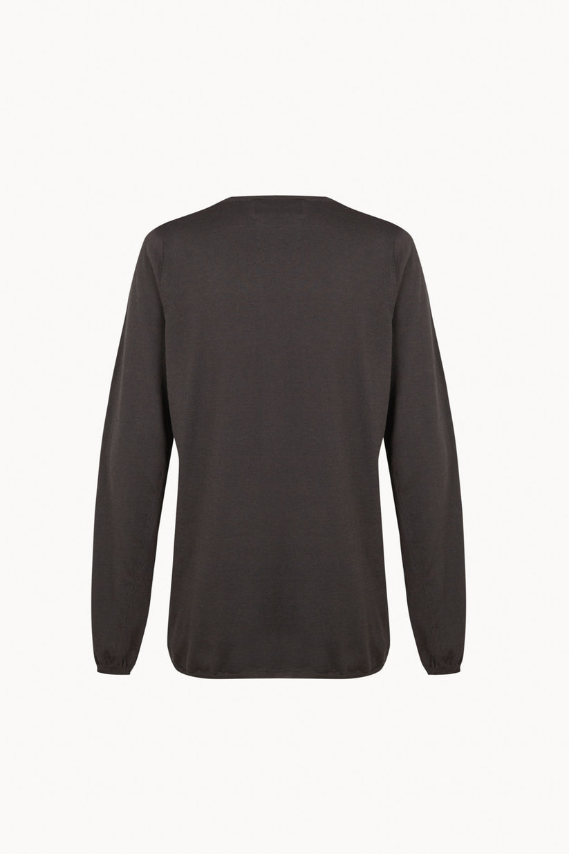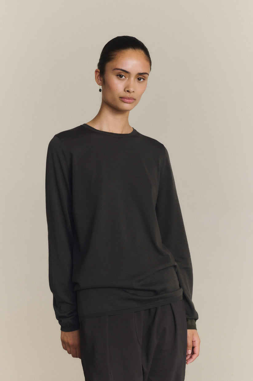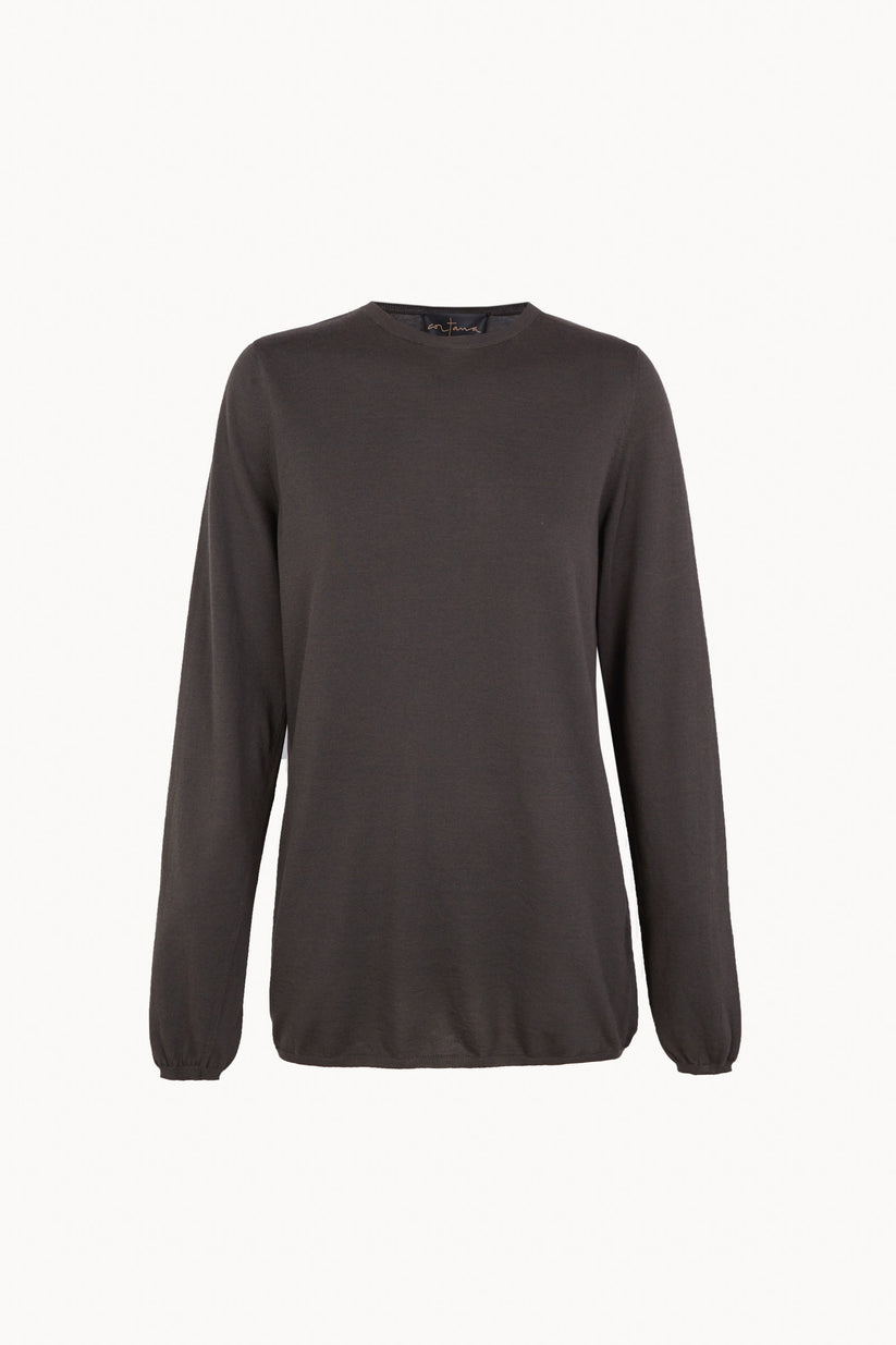 Jersey de manga larga con cuello redondo y un fit relajado. Confeccionado en punto liso de tacto suave y ligero gracias a la combinación del algodón orgánico y seda de morera, una fibra premium reconocida por su extraordinaria suavidad y brillo natural. Presenta estructura rib en puños y bajo para un ajuste cómodo y delicado.