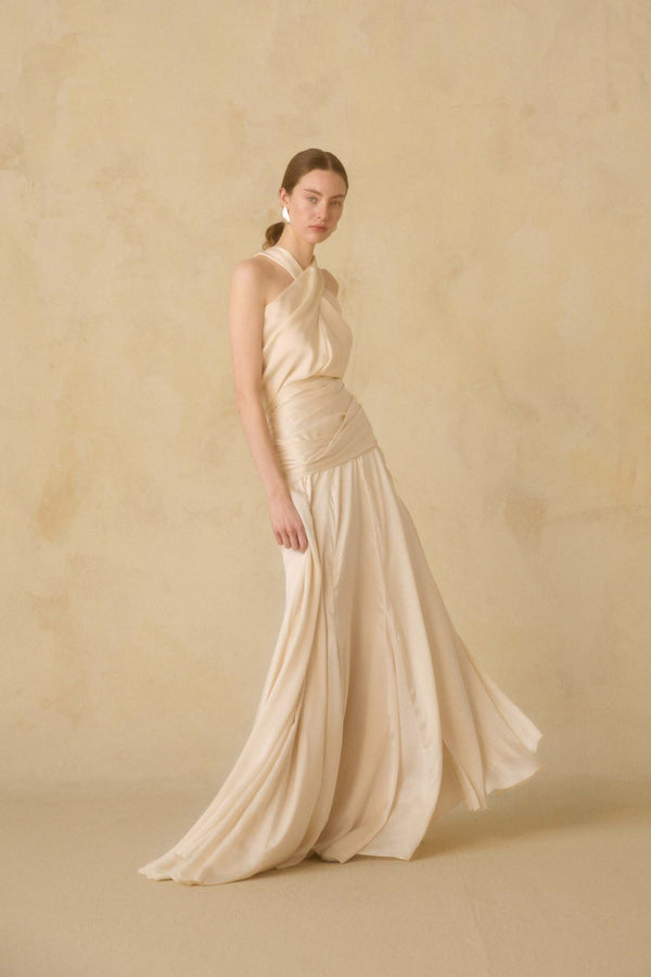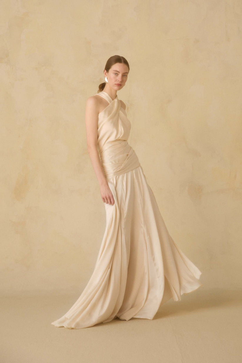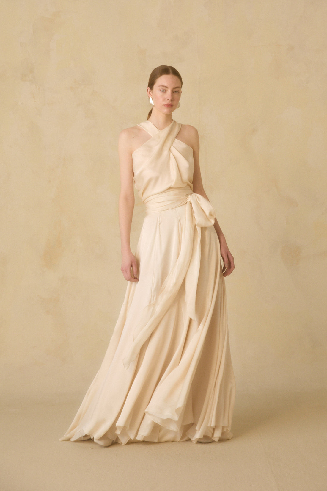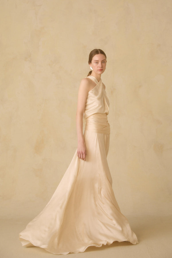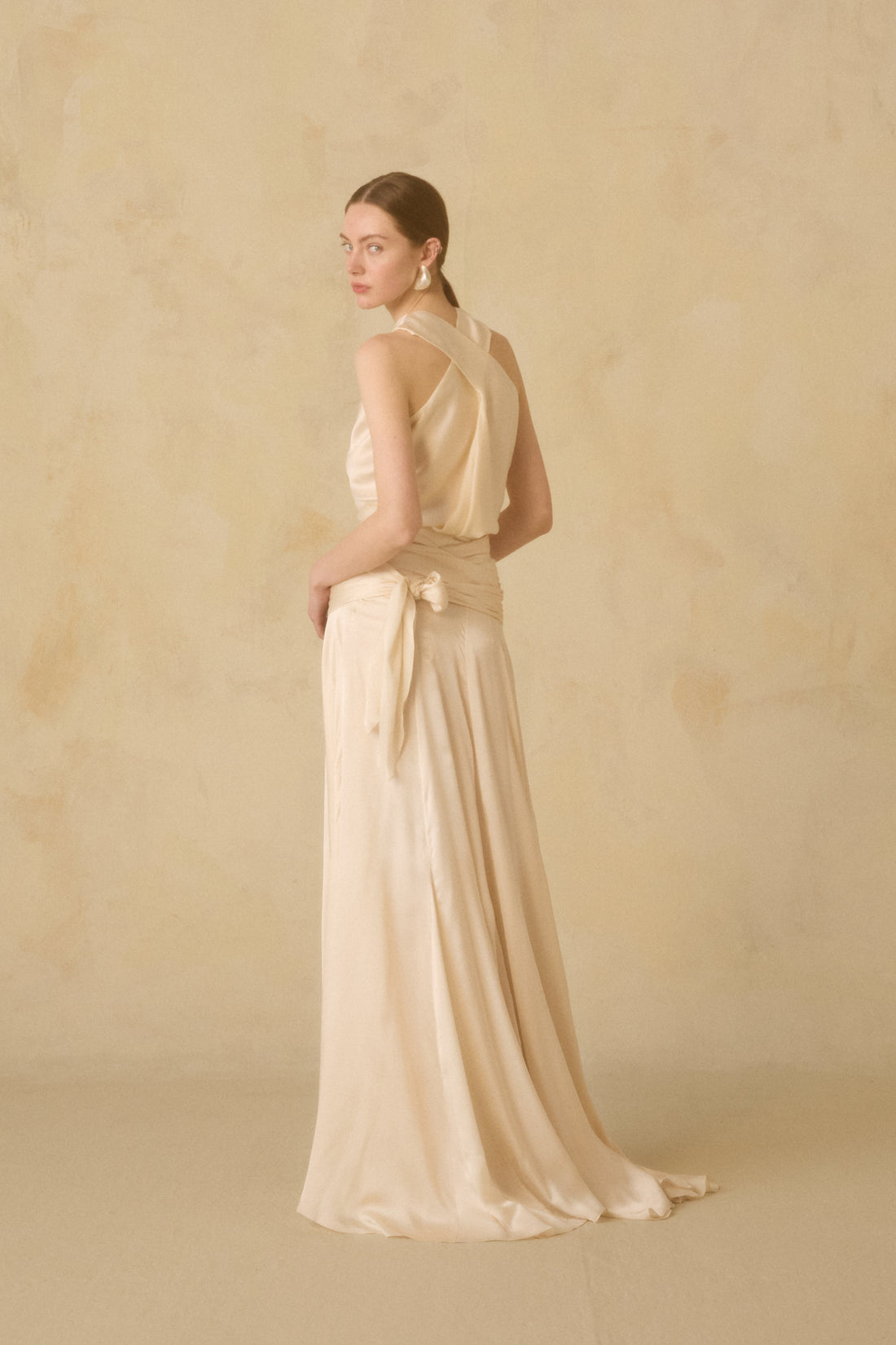 Top Lis, cortado al bies y realizado con doble capa de satén de seda. El escote se cruza tanto en la parte delantera como en la espalda.