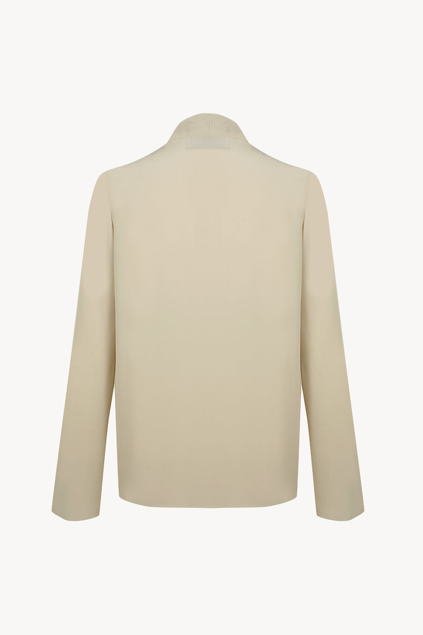 Blusa de seda con escote drapeado asimétrico y con manga larga. La blusa Lyra se puede llevar suelta o como en las fotografías.