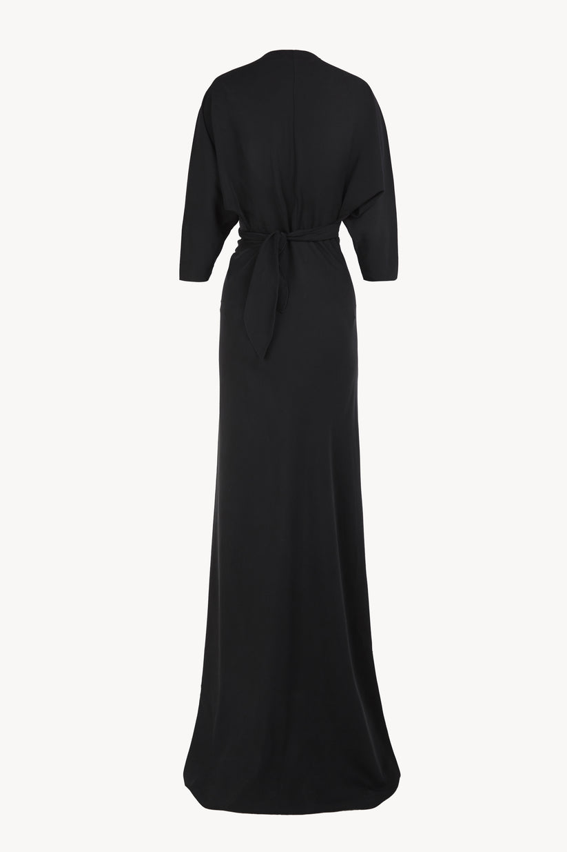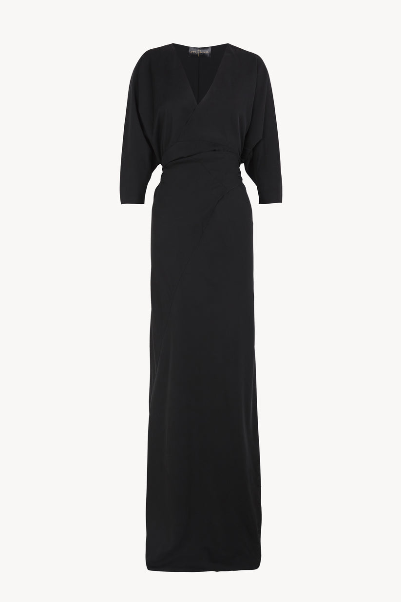 Vestido largo cortado al bies y realizado en seda mate, con mangas dolman y escote en forma de V. Se cruza en la parte delantera y anuda en la espalda.