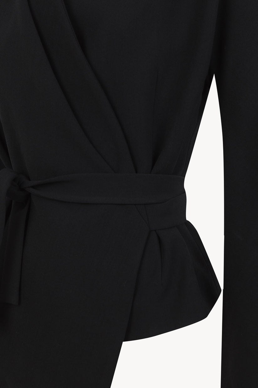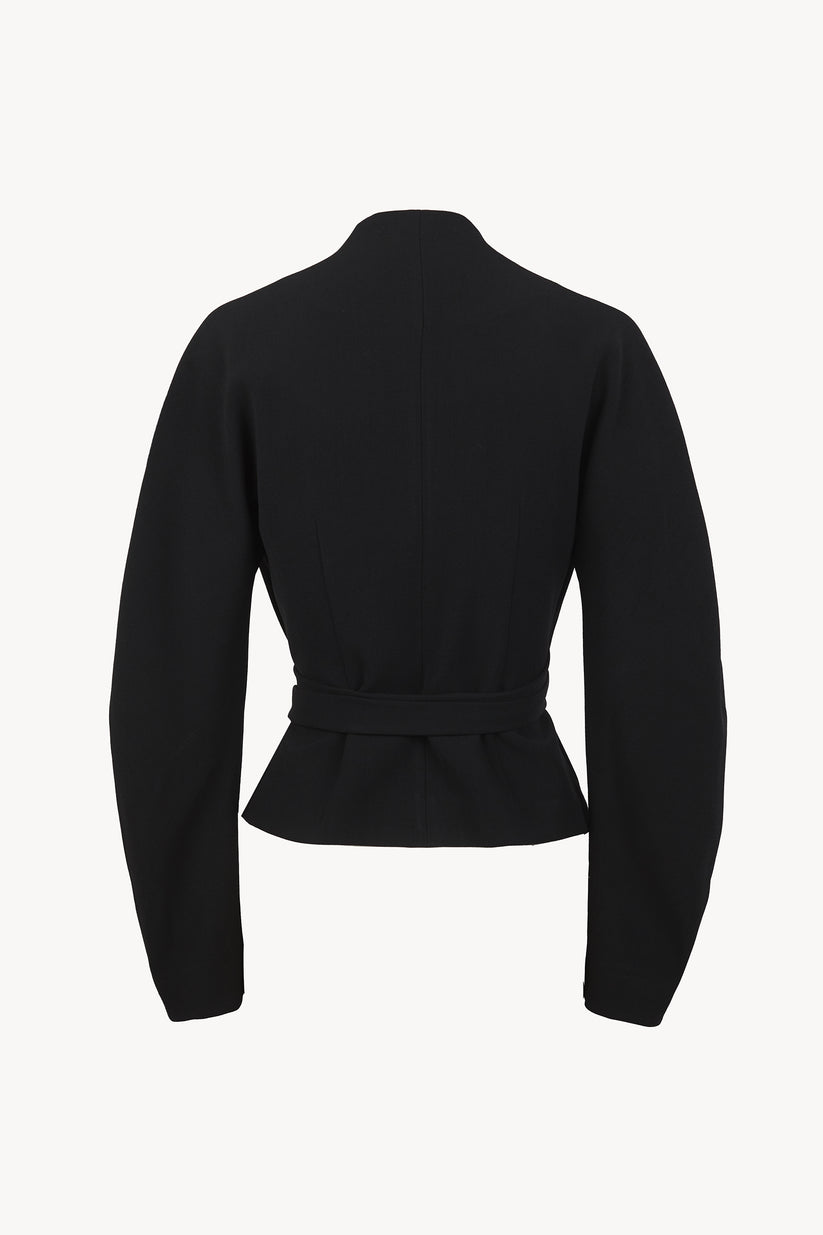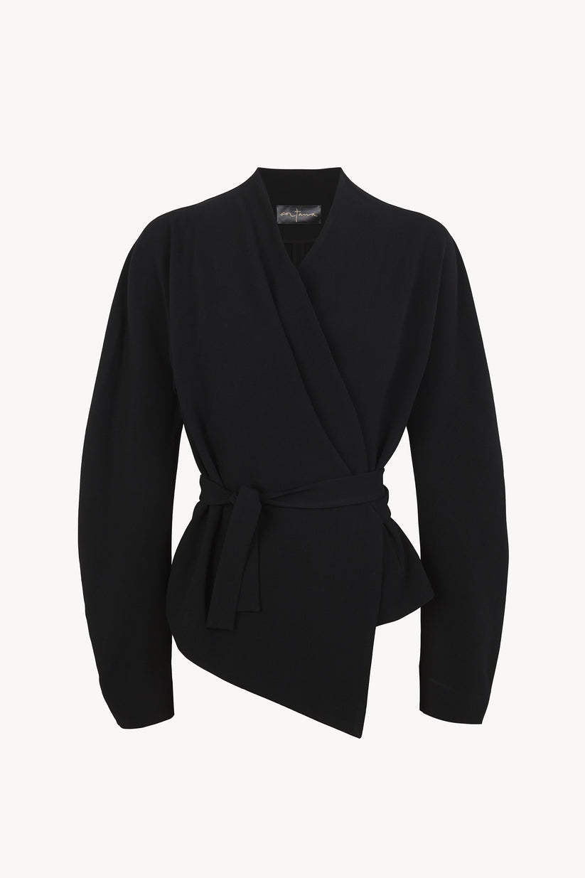 Chaqueta realizada en un tejido grueso de lana stretch, tiene mangas japonesas ligeramente curvadas y se cruza en el delantero para atarse en la cintura.