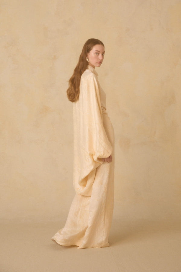 Chaqueta tipo kimono realizada en una sola pieza con un jacquard de lino y seda. La chaqueta Nara tiene forro de seda. Combina con el pantalón envolvente Nara, realizado en el mismo tejido.
