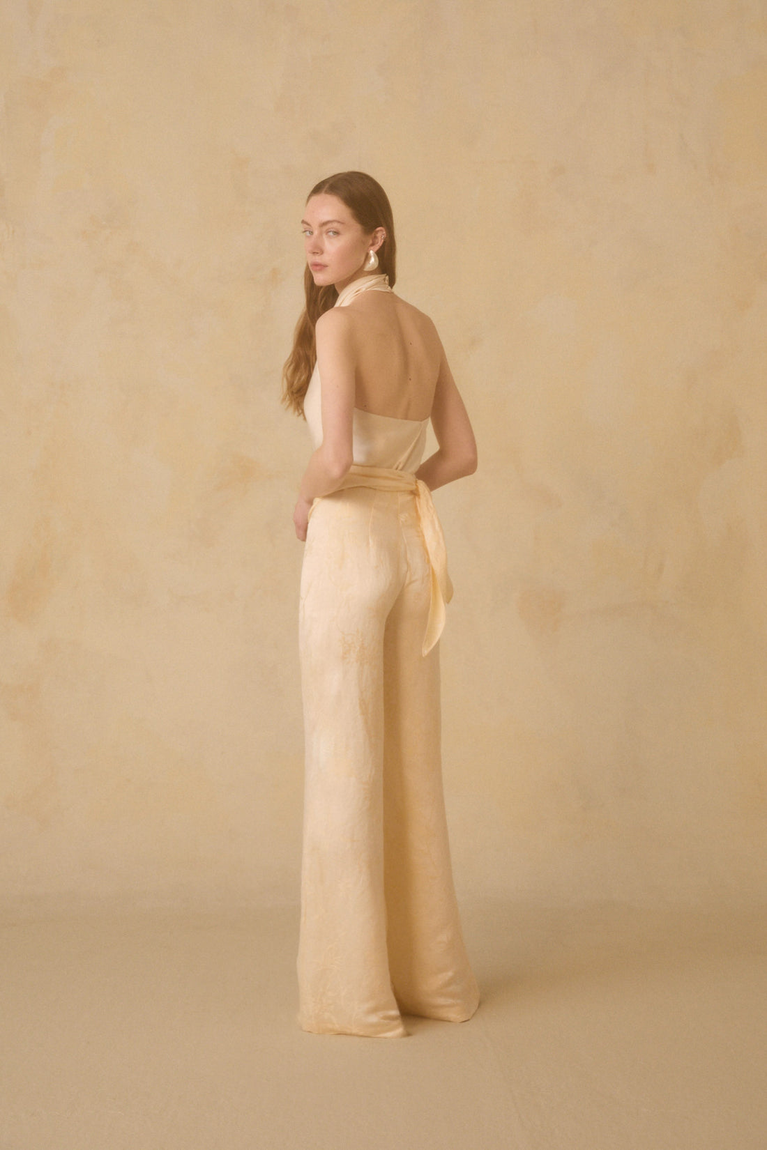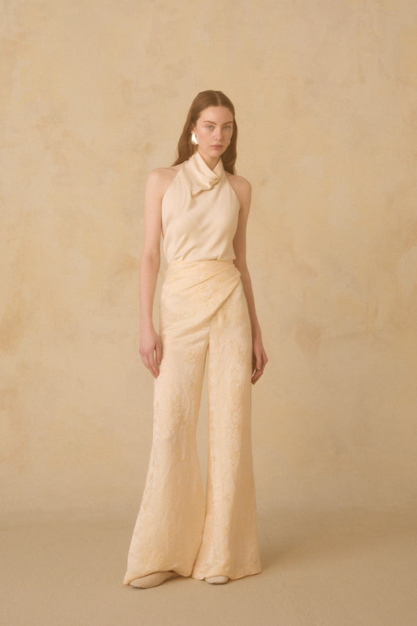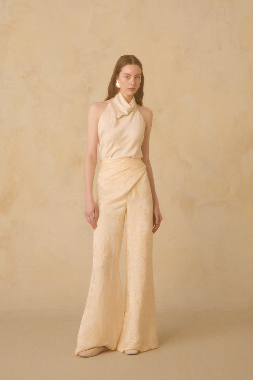 Tulip, top al bies con escote halter realizado con dos capas de satén de seda y que se abrocha en el cuello con botones pequeños.