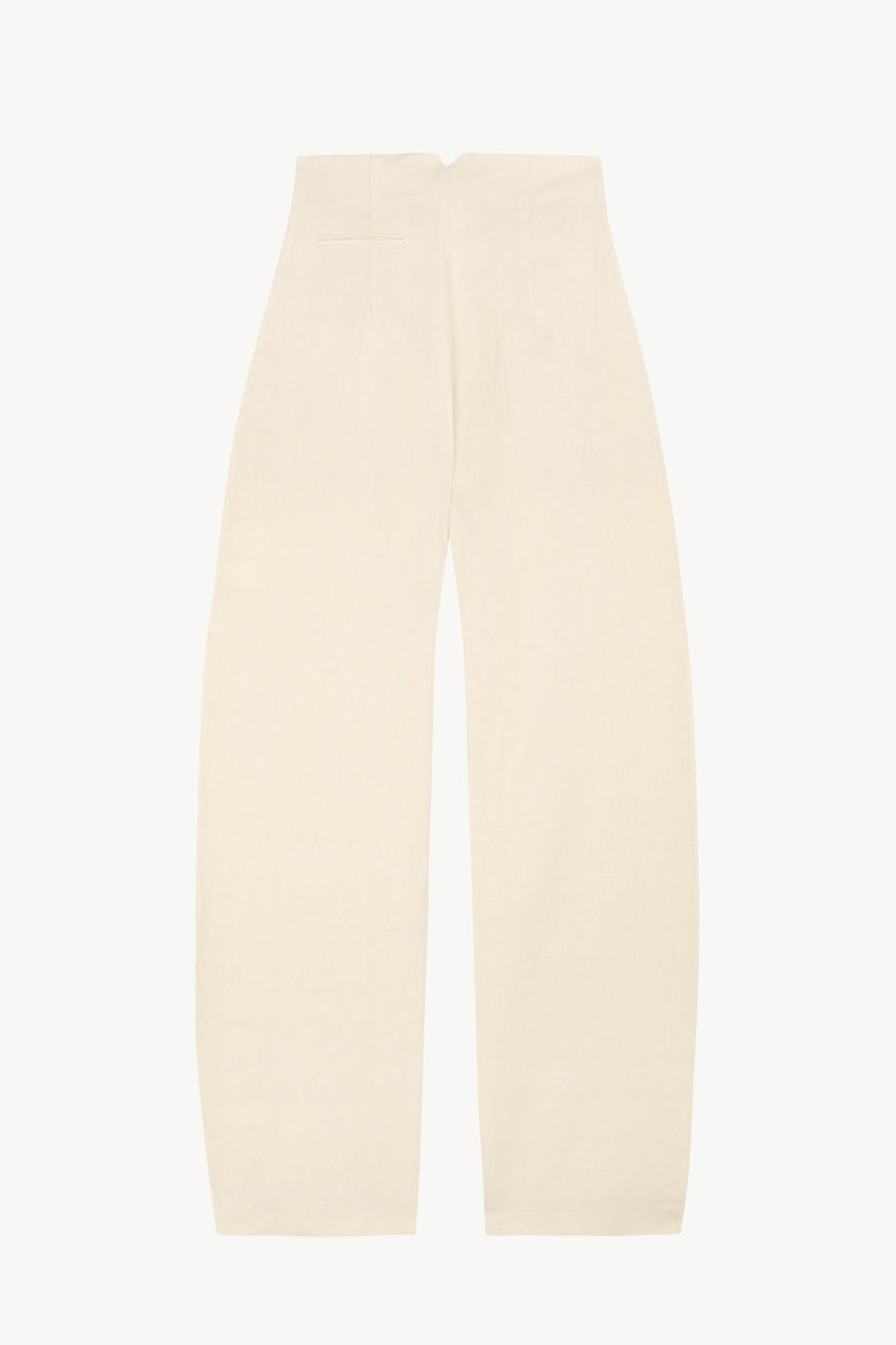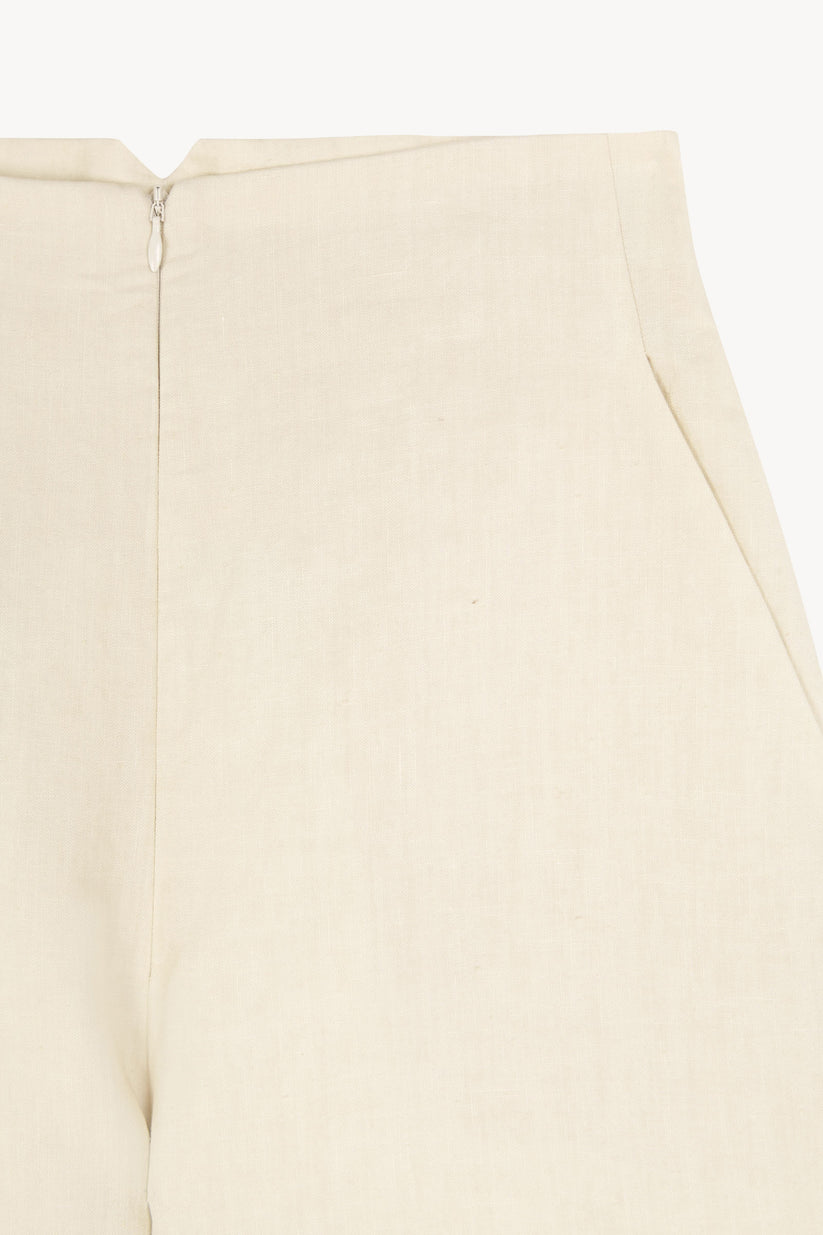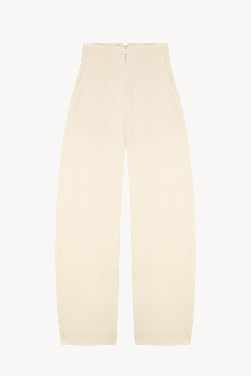 Pantalón de talle alto con bolsillos laterales y piernas con una ligera curvatura realizado en un tejido que combina lino y algodón. Cierre frontal con creamallera invisible.
