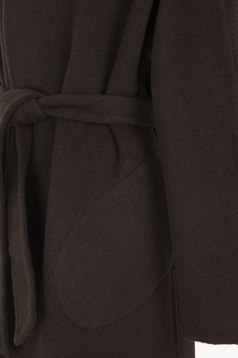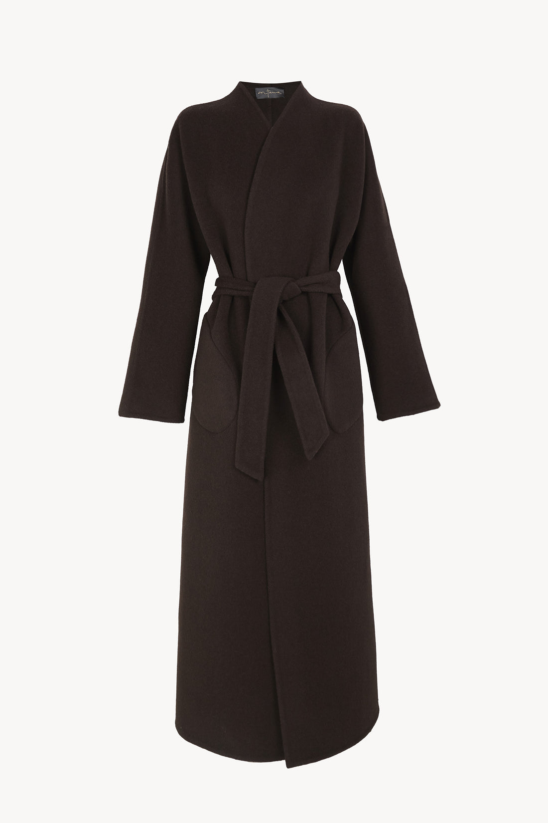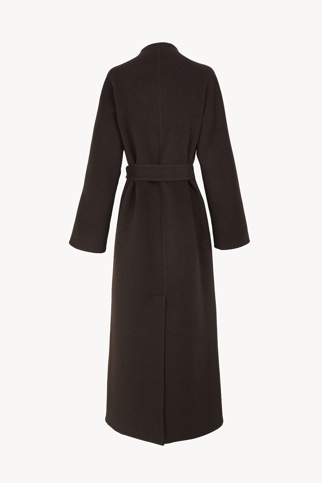 Abrigo largo doble faz confeccionado en un tejido denso de lana y cachemir de origen italiano. Su confección sin forro revela la pureza del material, mientras las mangas japonesas y los bolsillos laterales aportan comodidad. Incluye un cinturón para ajustar el volumen según la ocasión