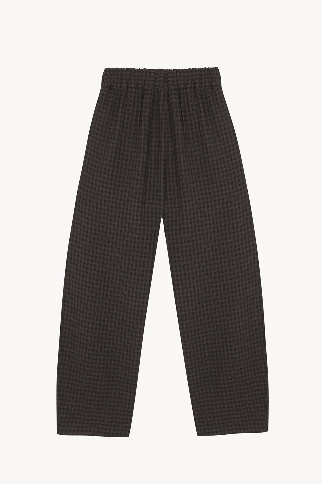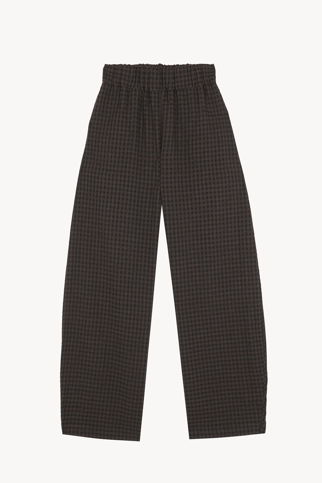 Pantalón ancho realizado en un tejido que combina lana y viscosa con un jacquard de cuadros. El pantalón Nuna lleva goma en la cinturilla y bolsillos laterales.