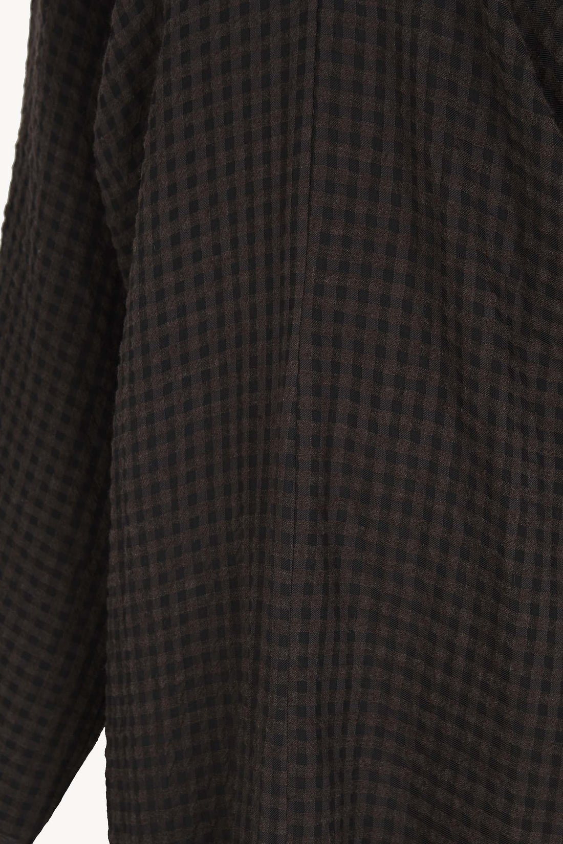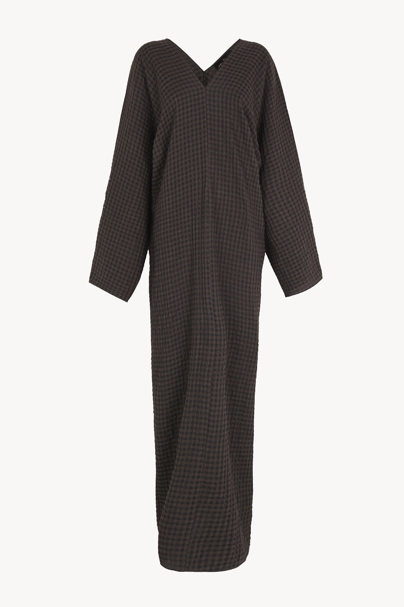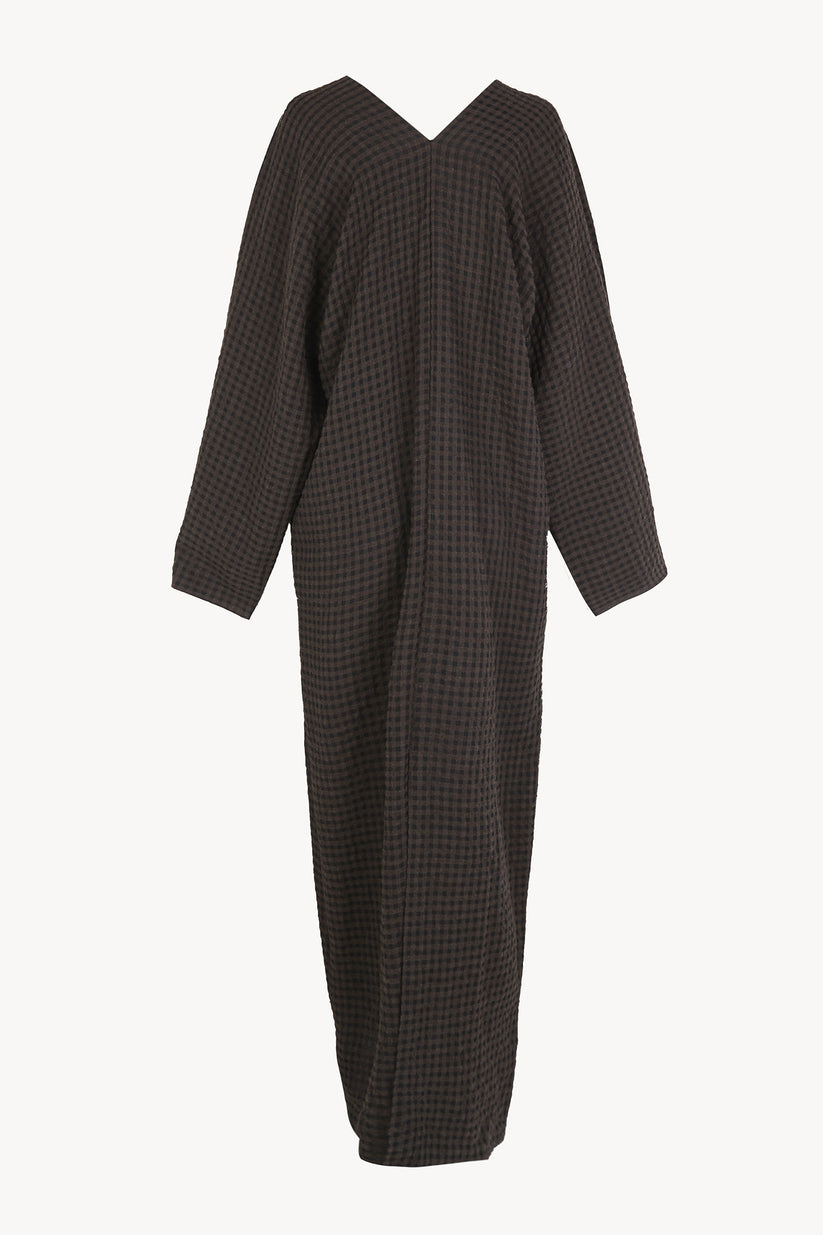Vestido tipo túnica con manga japonesa realizado en un tejido que combina lana y viscosa con un jacquard de cuadros. El vestido Nuna tiene escote pico en el frontal y en la espalda.