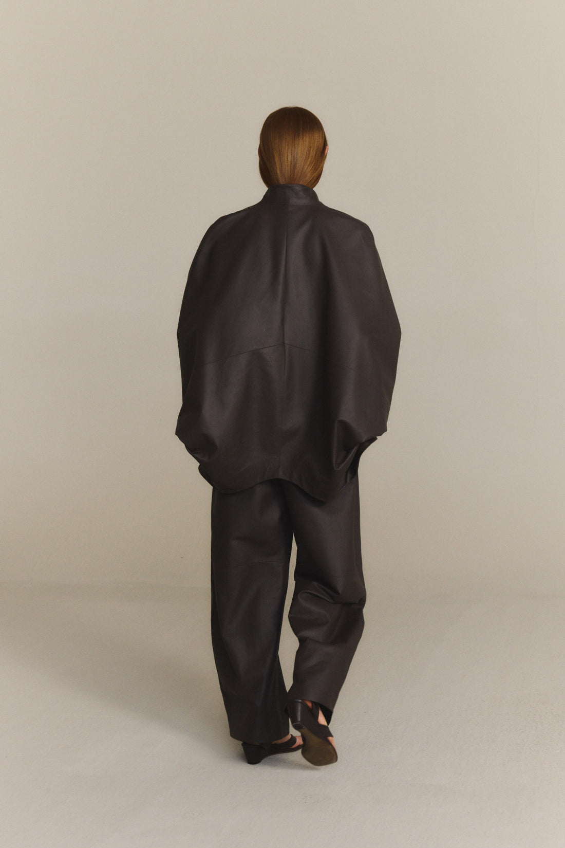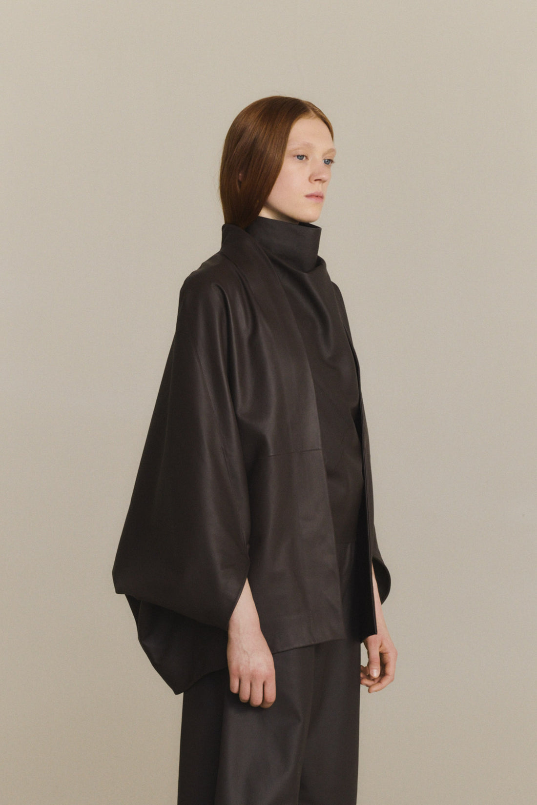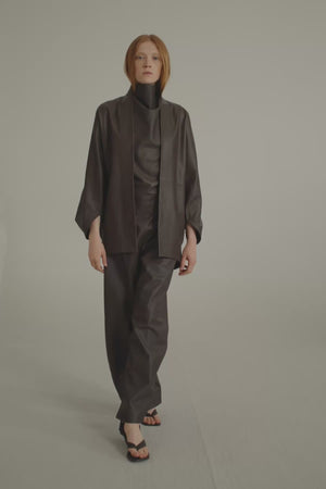 Chaqueta amplia estilo kimono realizada en piel de cordero. Cada pieza se confecciona en España, en talleres especializados, con un enfoque artesanal y una cuidada selección de materiales.