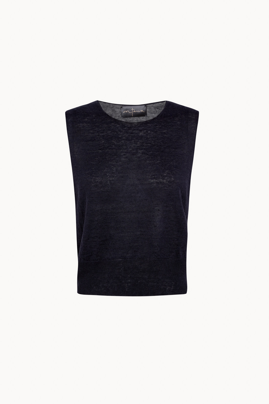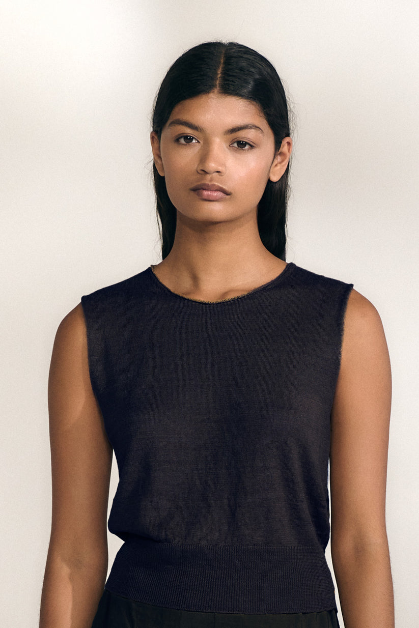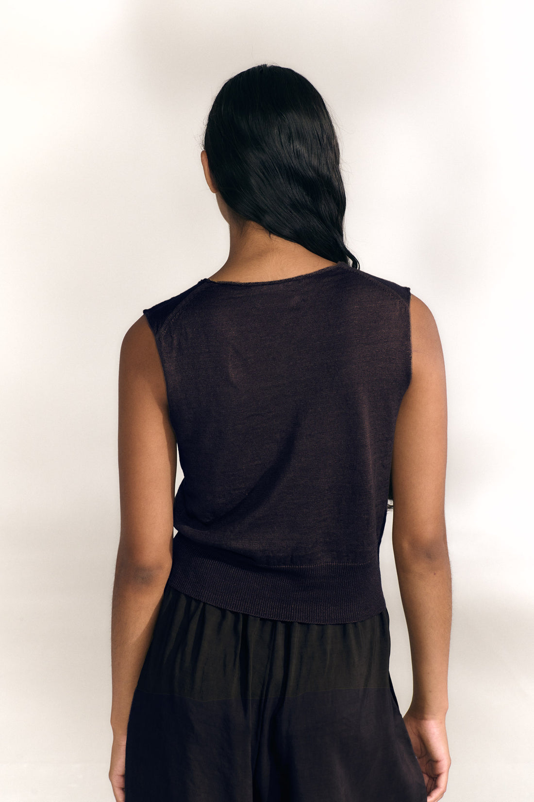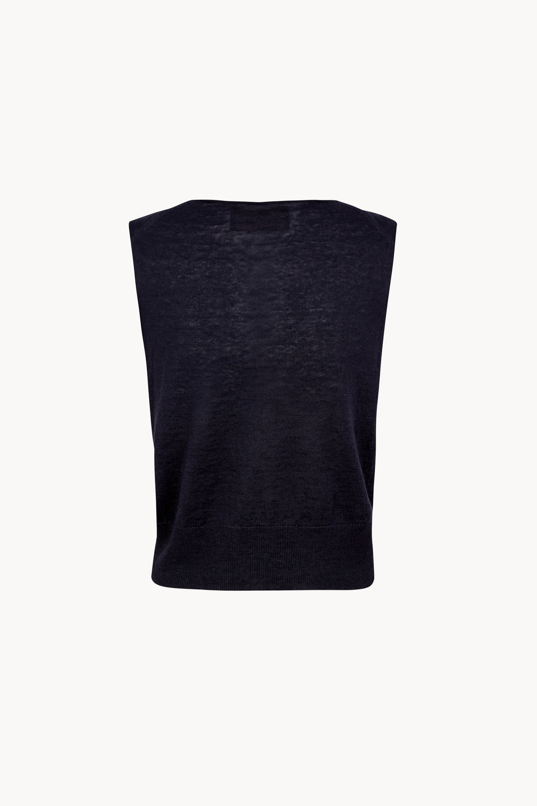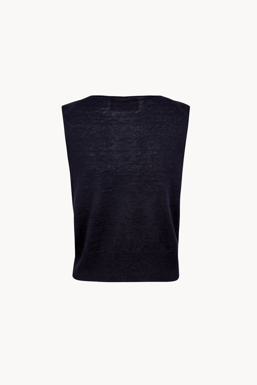 Chaleco realizado en punto de lino, de corte recto, cuello redondo y sin mangas.