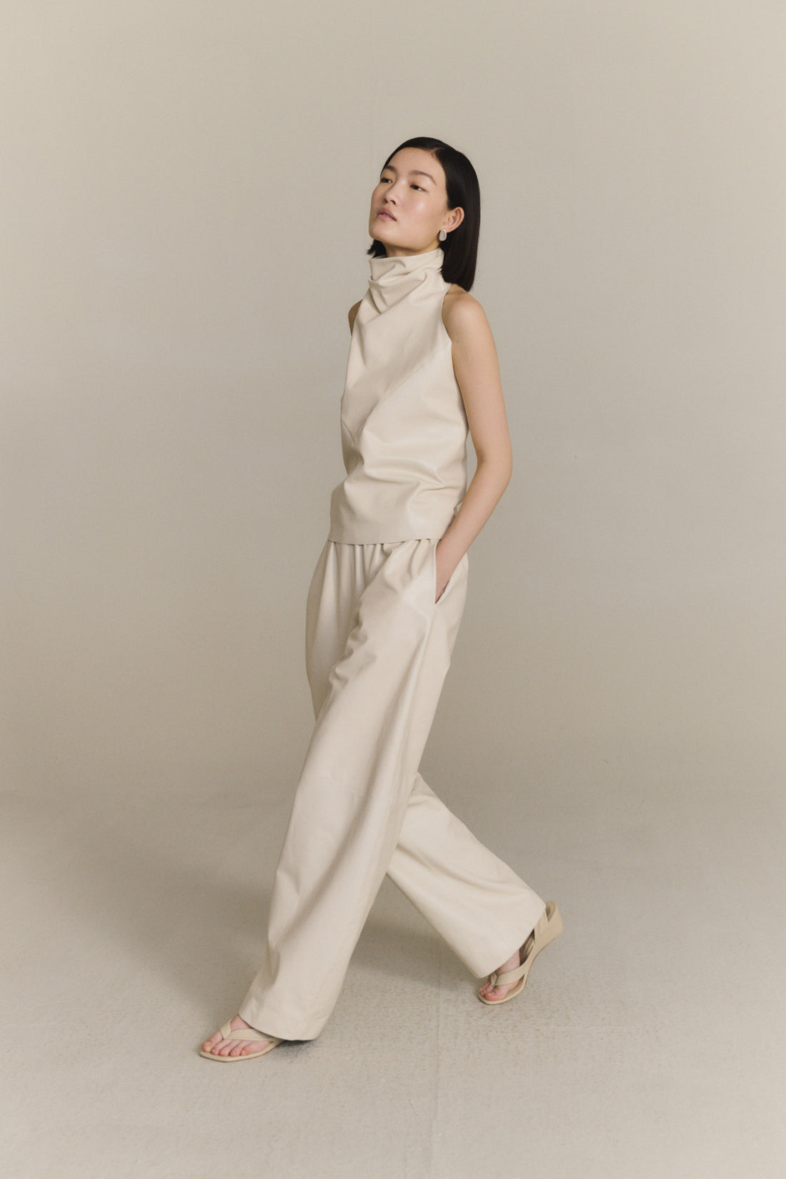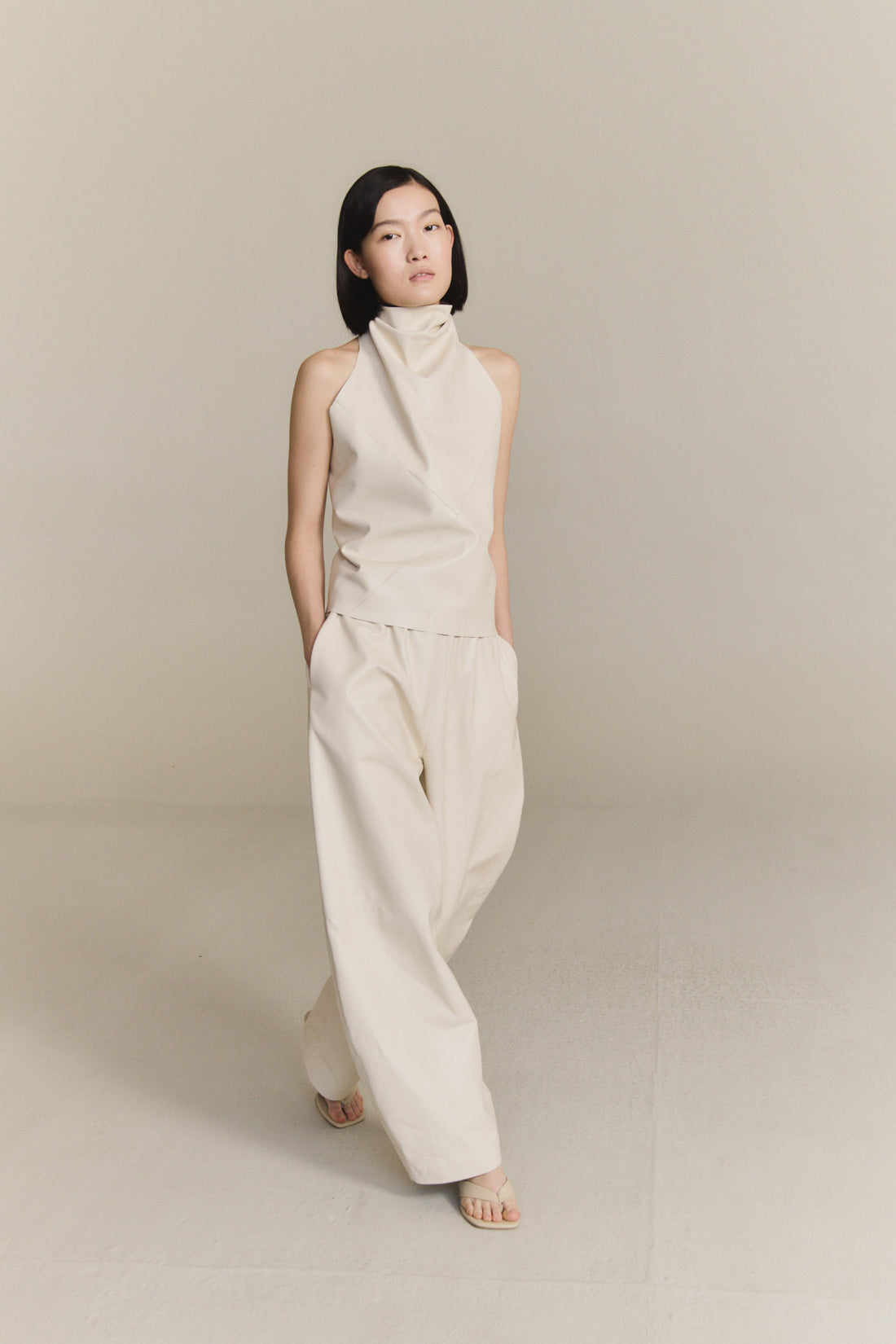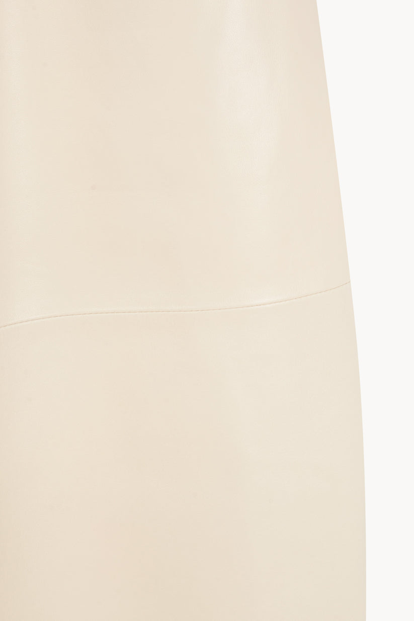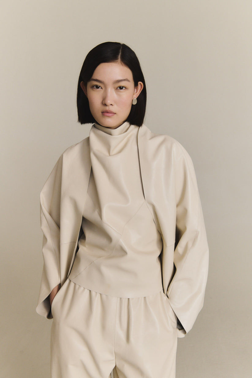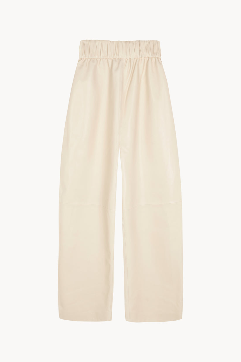 Pantalón unisex de corte amplio realizado en piel de cordero, con cintura elástica y pierna ligeramente curvada. Cada pieza se confecciona en España, en talleres especializados, con un enfoque artesanal y una cuidada selección de materiales.