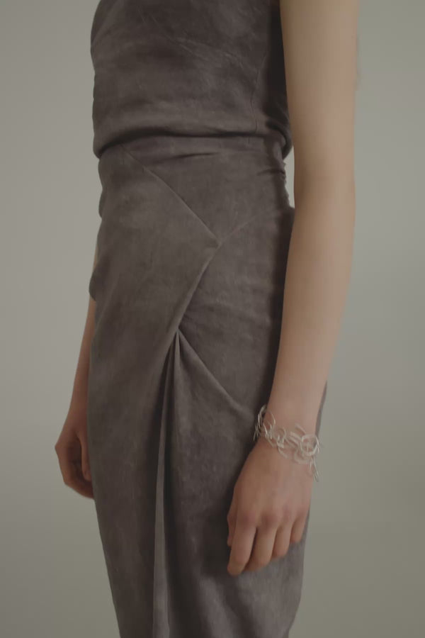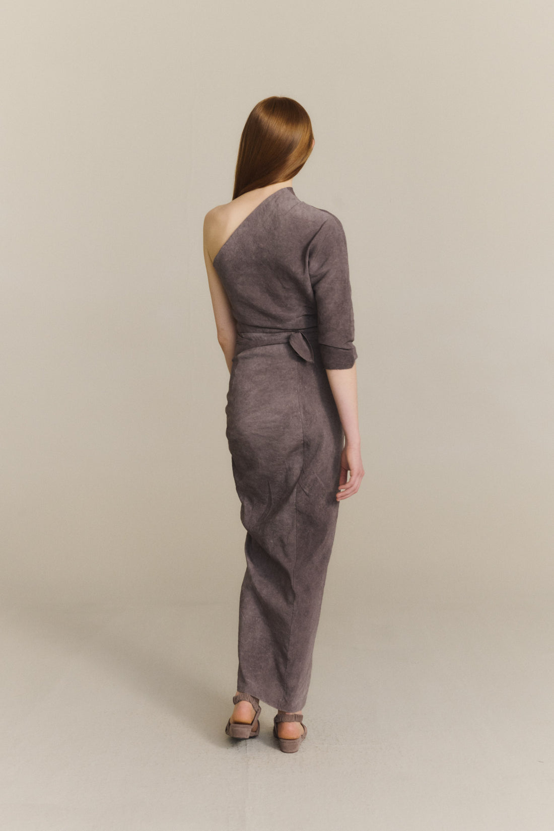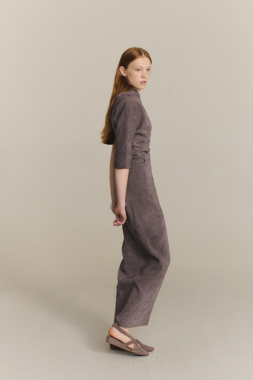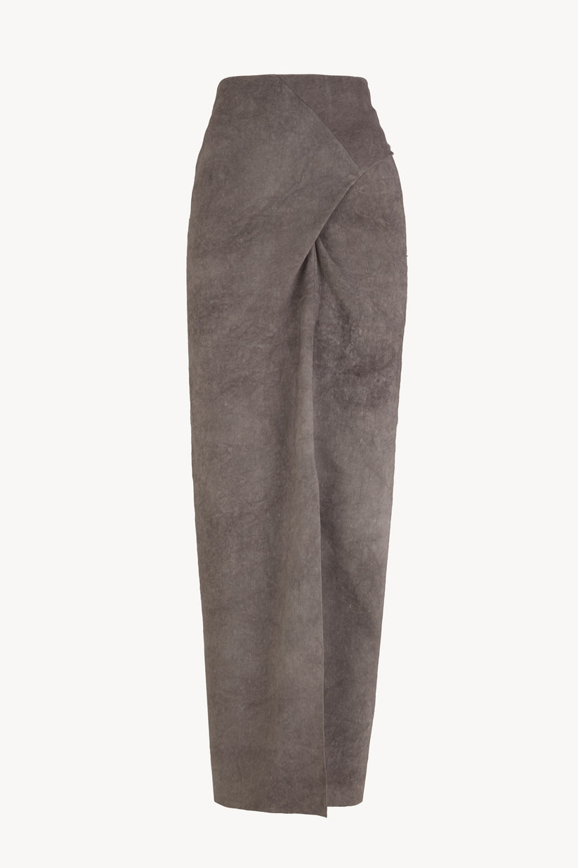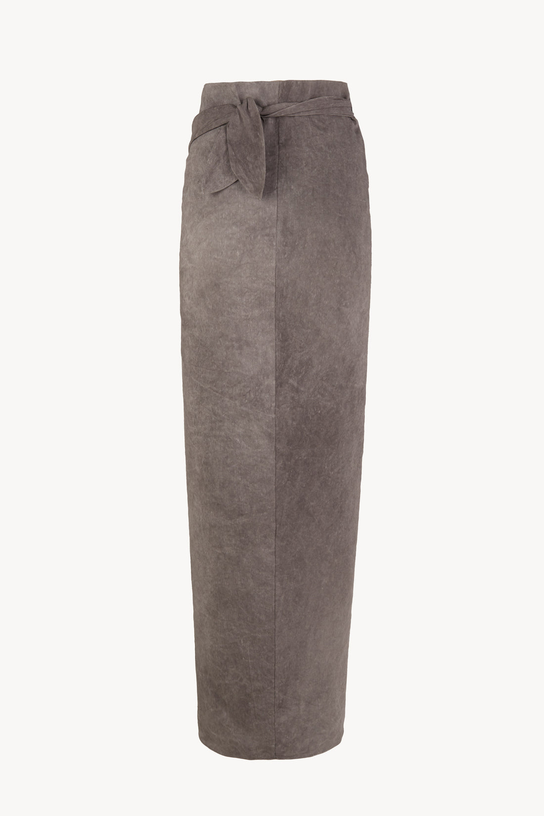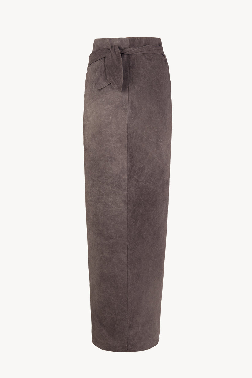 Falda de talle alto realizada en un tejido stretch que combina lino y viscosa con acabado maltinto. Este modelo tiene unas lazadas integradas que se atan en la cintura y una abertura frontal que aporta un mayor movimiento a la falda.
