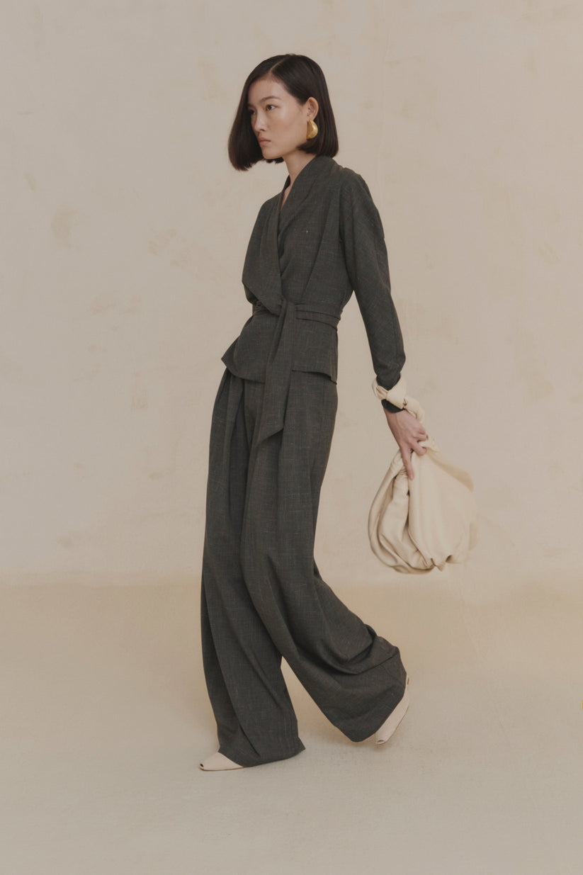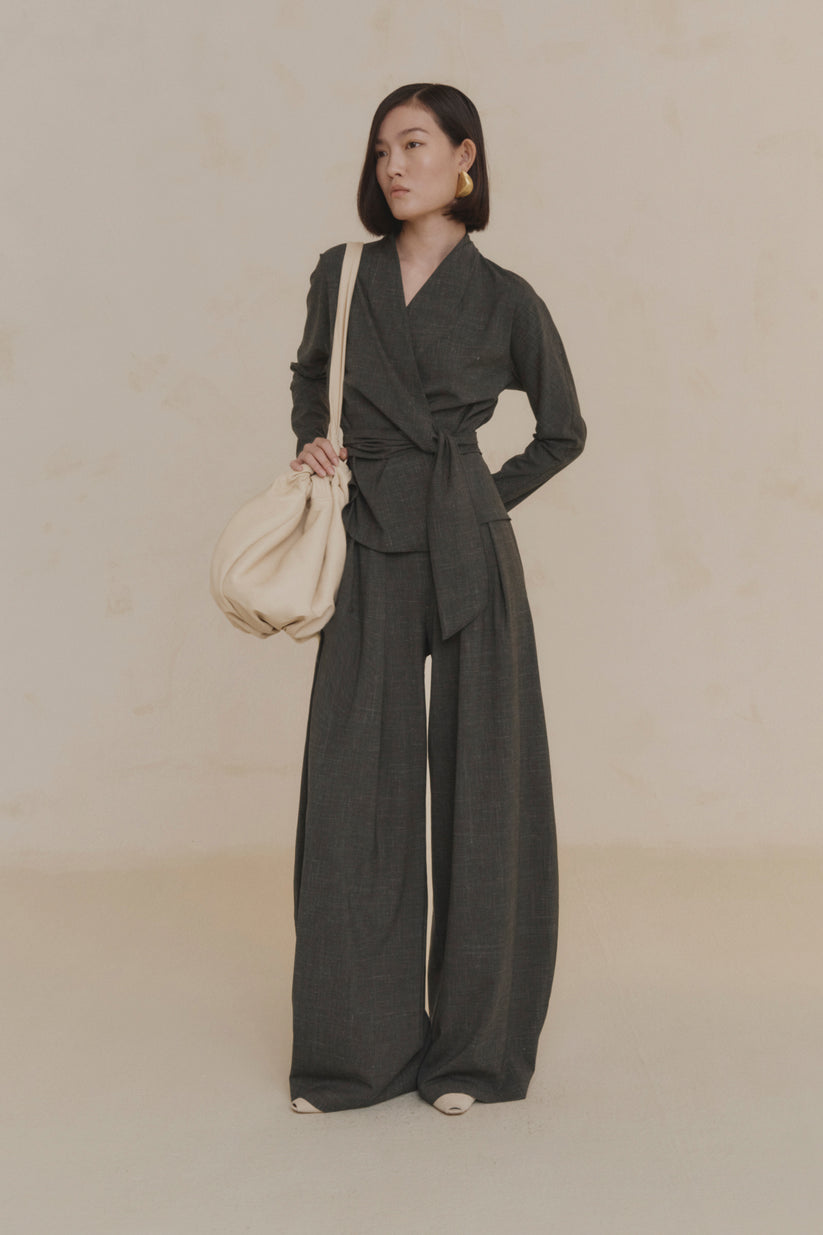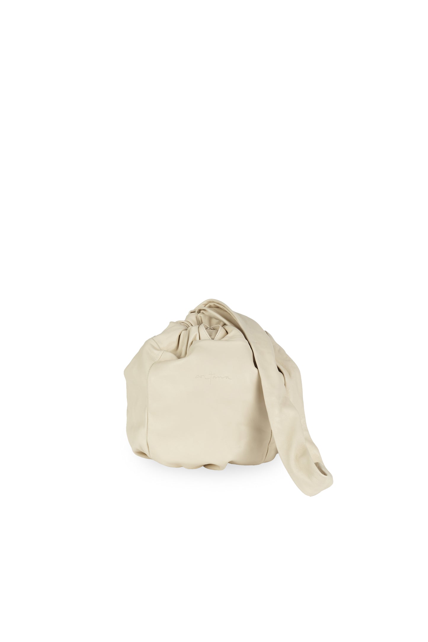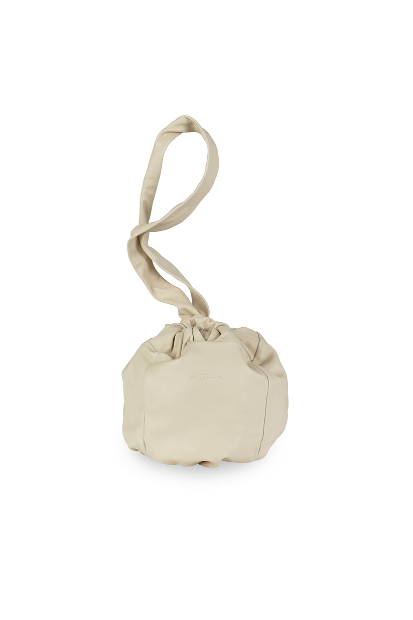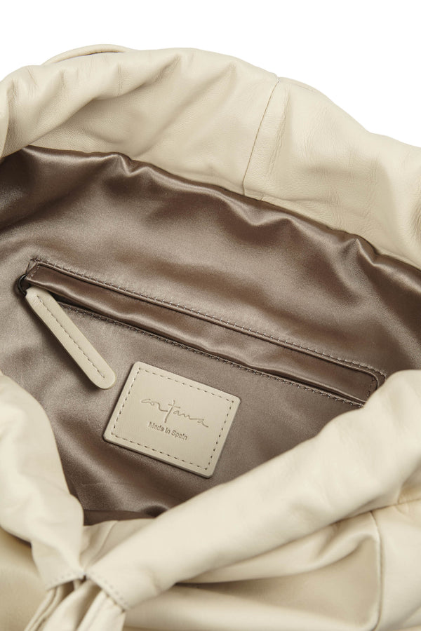 Bolso mediano Sack, confeccionado en España con piel de napa ultra suave y totalmente forrado en el interior con un tejido que combina algodón y seda. Gracias a la correa ancha que frunce la parte superior se puede llevar en forma de bandolera, al hombro o en la mano. Cuenta con un bolsillo interior con cremallera.