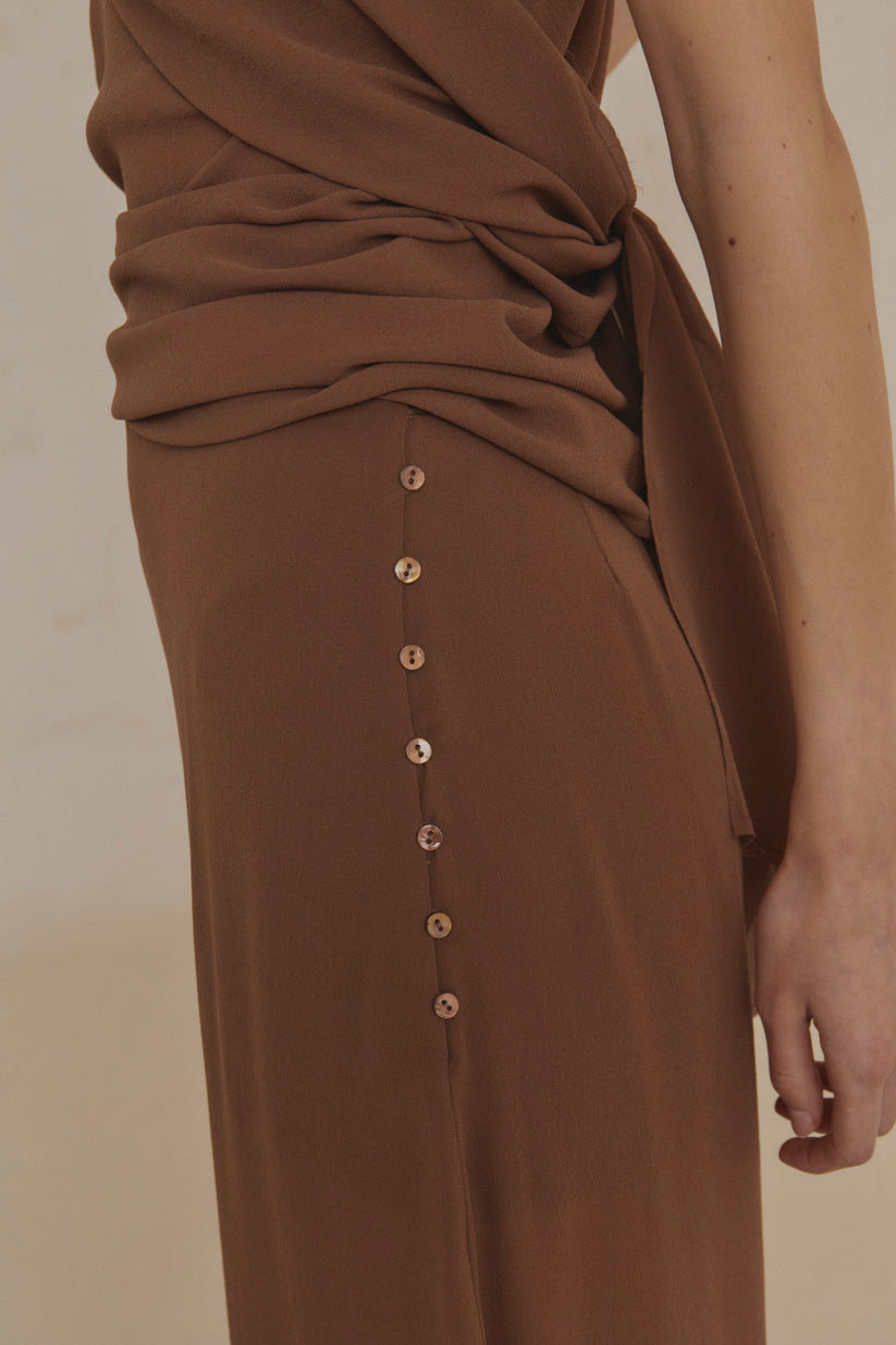 Pantalón de georgette de seda con short corto interior integrado para mayor cobertura. El pantalón Serene se cierra con pequeños botones en el lateral.