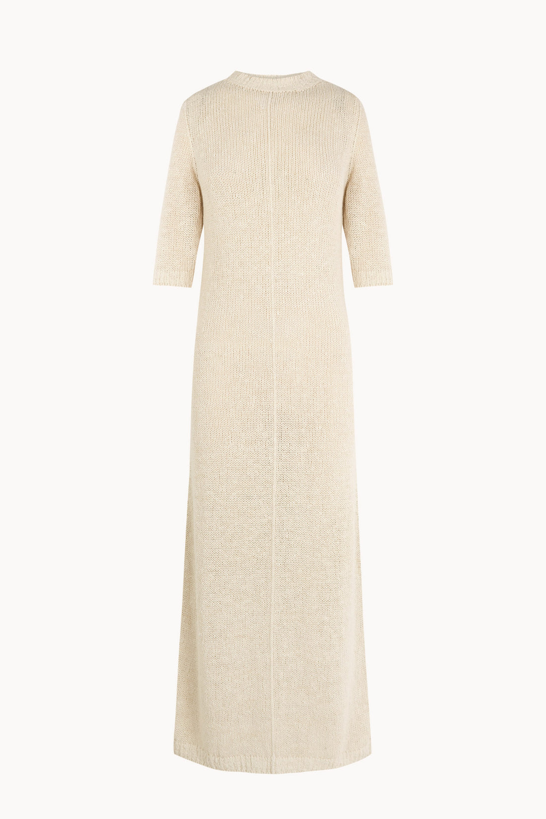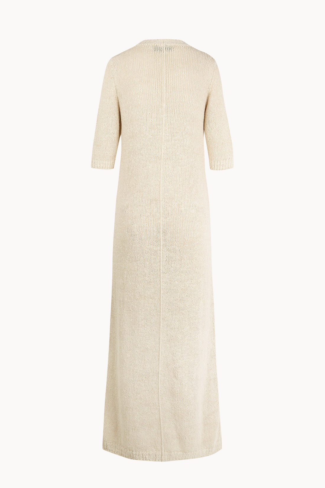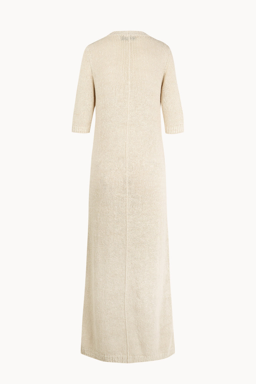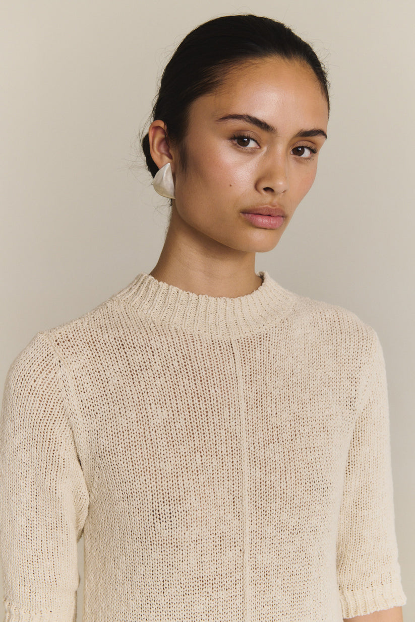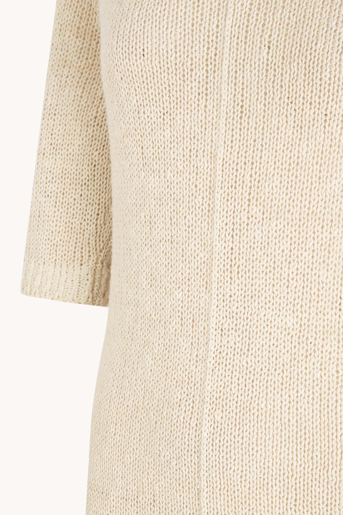 El hilo utilizado combina algodón, lino y seda reciclada. Puede generar irregularidades naturales que le dan un aspecto único a cada prenda. Estas particularidades forman parte del encanto y la autenticidad de este diseño único.